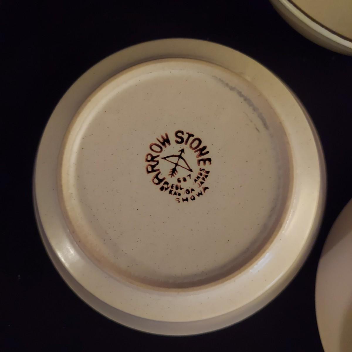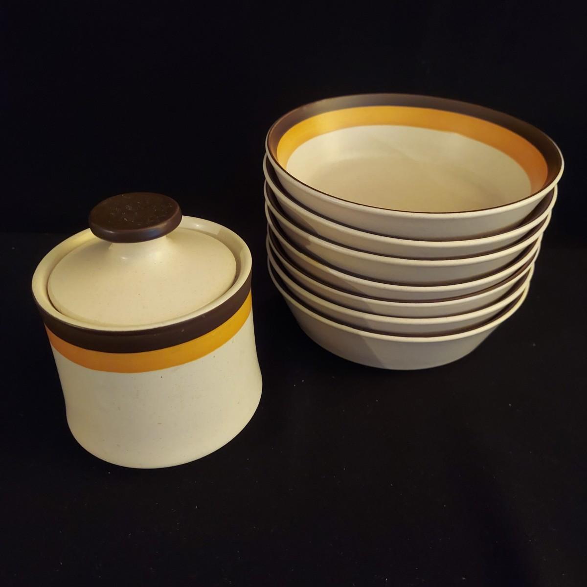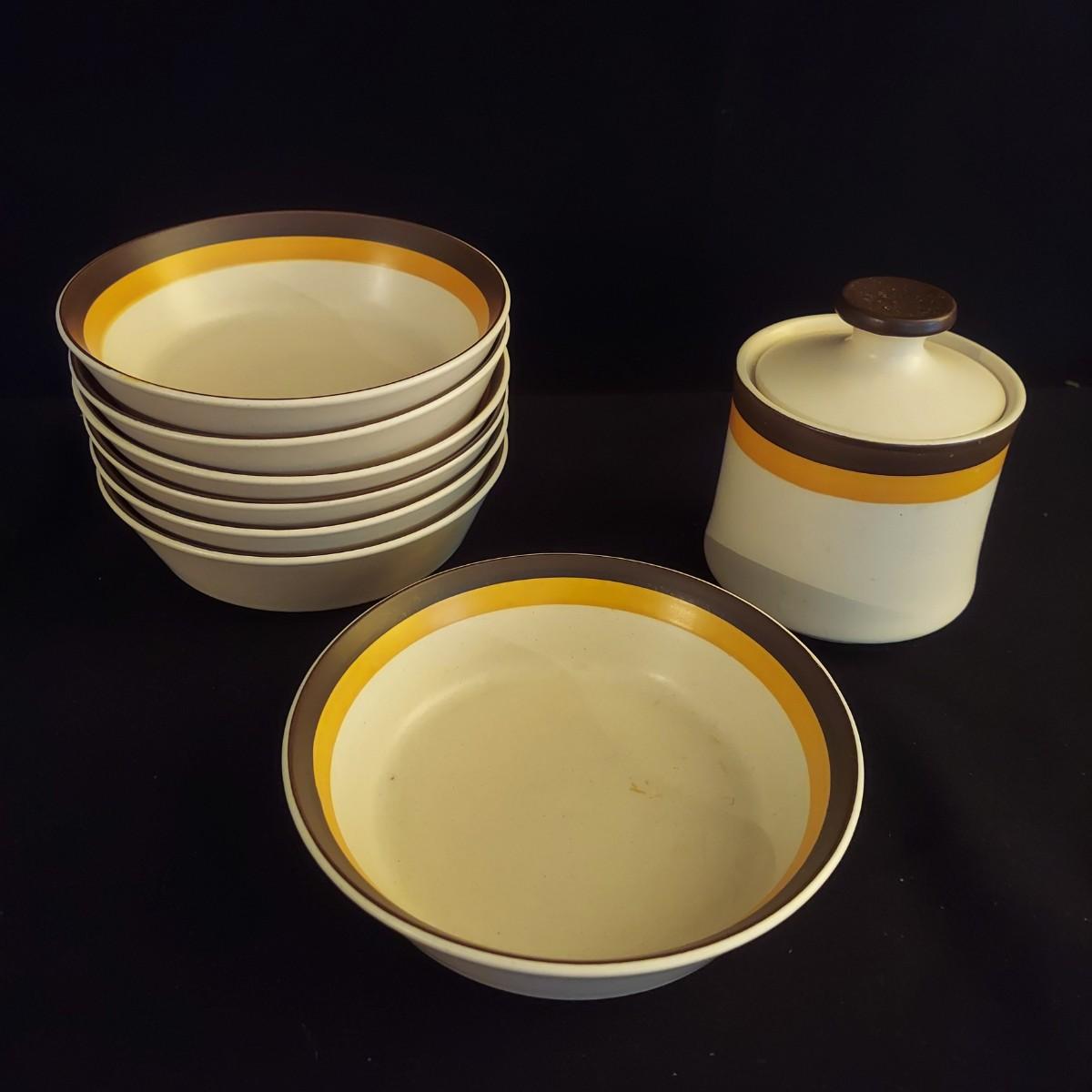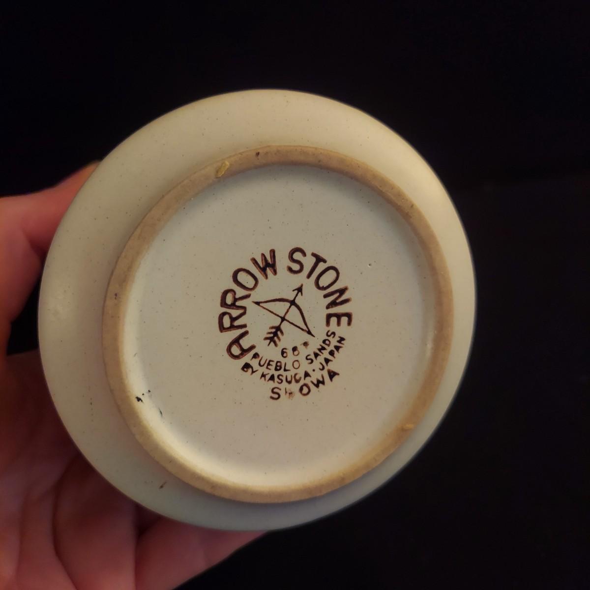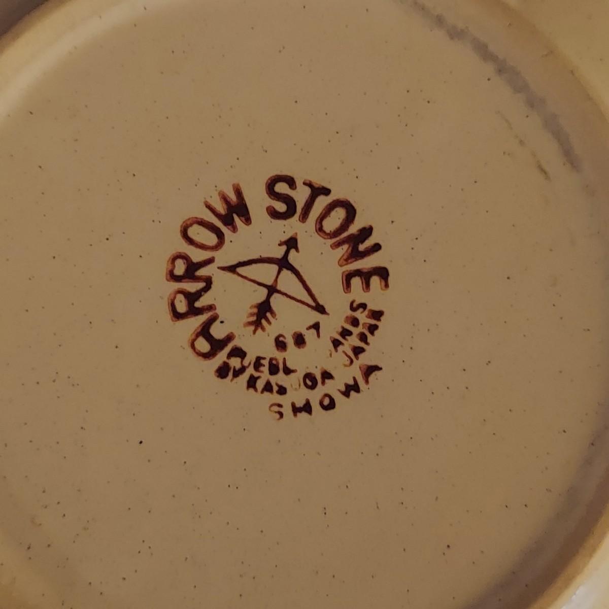 Arrow Stone Japanese stoneware dishes is Pueblo Sands Showa design. Lot includes seven 6" bowls and a sugar bowl with lid. Sugar dish measures 4"D x 4.5"H. Shipping available