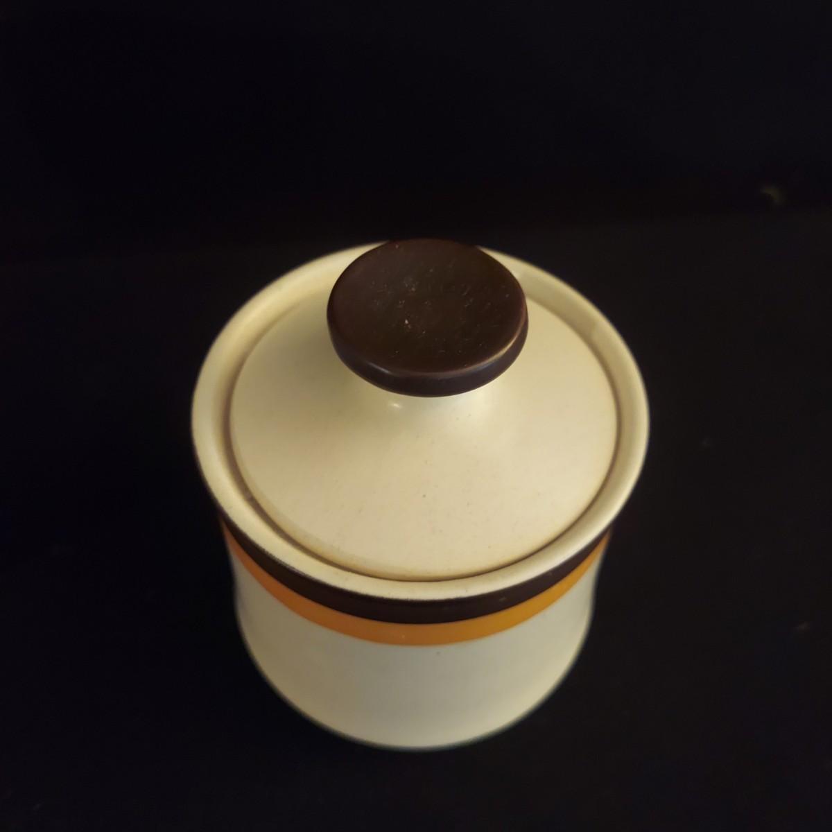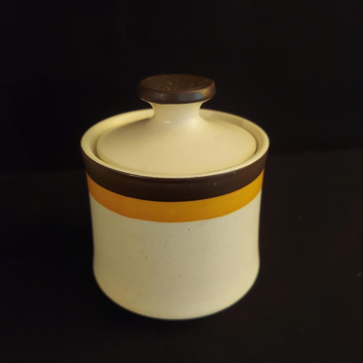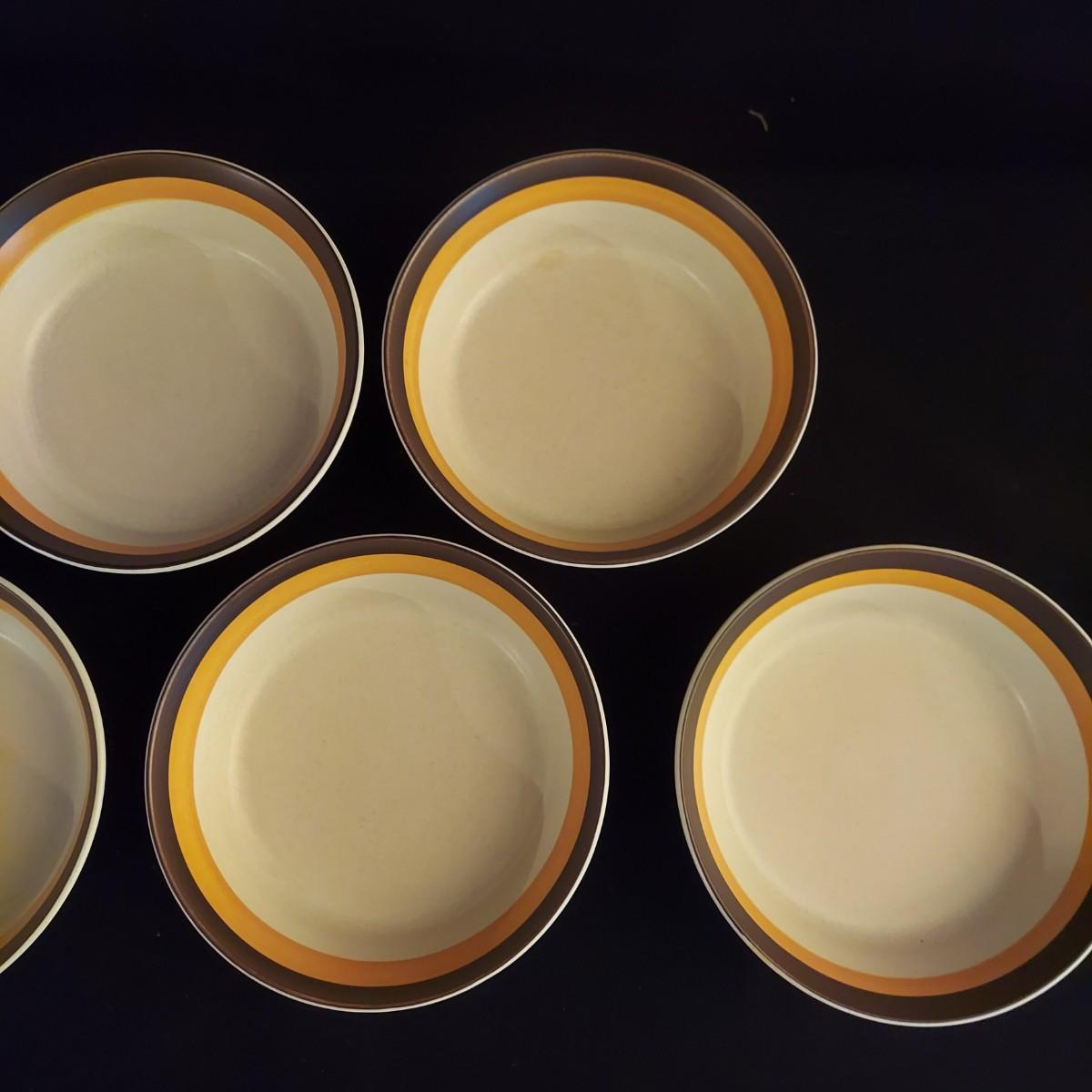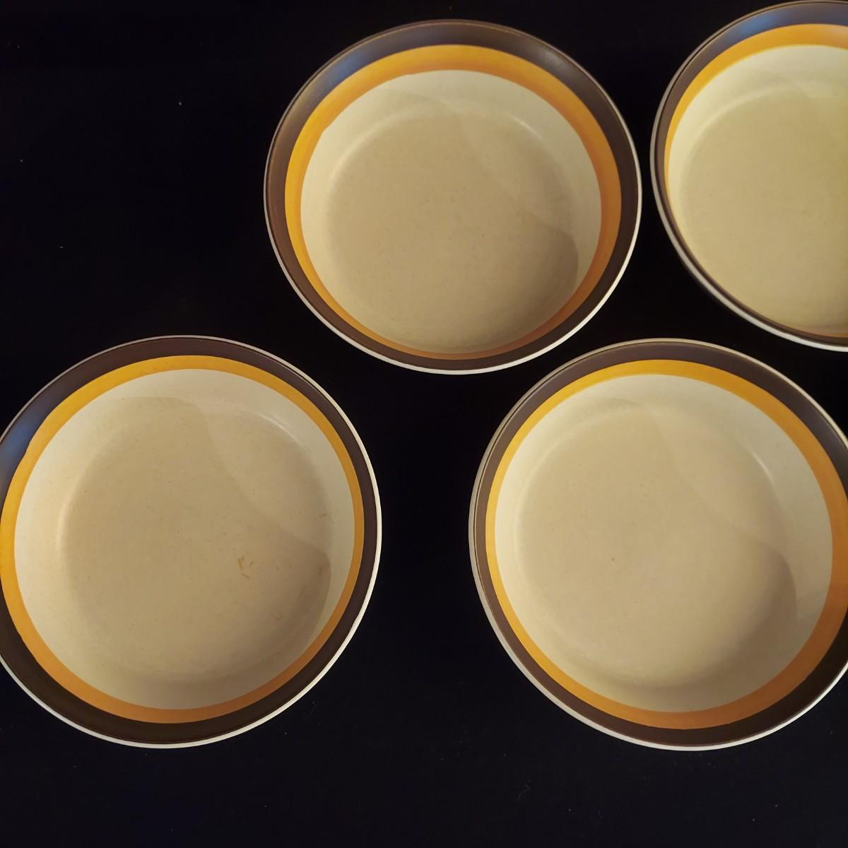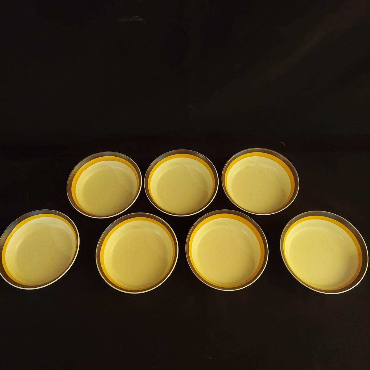 Arrow Stone Japanese stoneware dishes is Pueblo Sands Showa design. Lot includes seven 6" bowls and a sugar bowl with lid. Sugar dish measures 4"D x 4.5"H. Shipping available