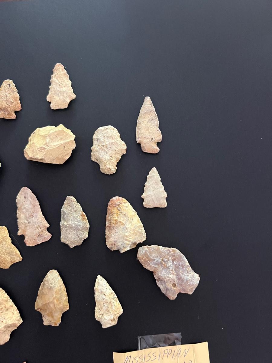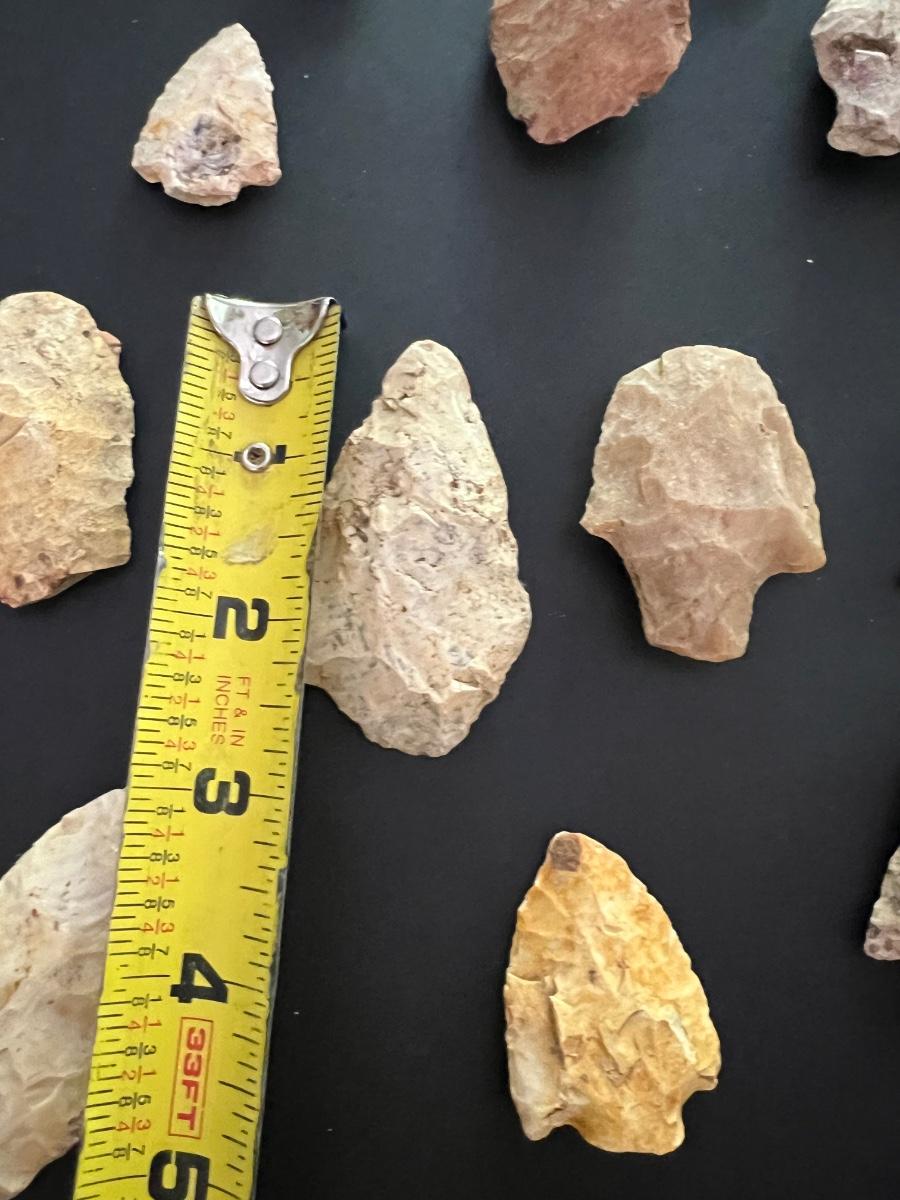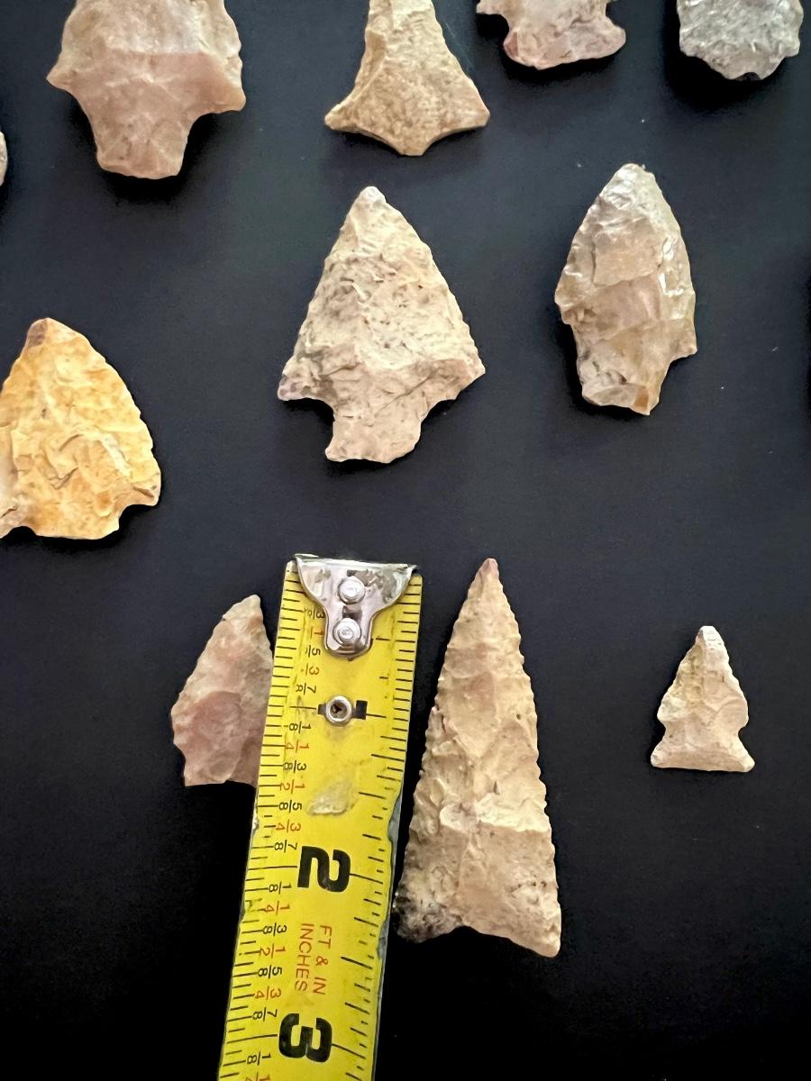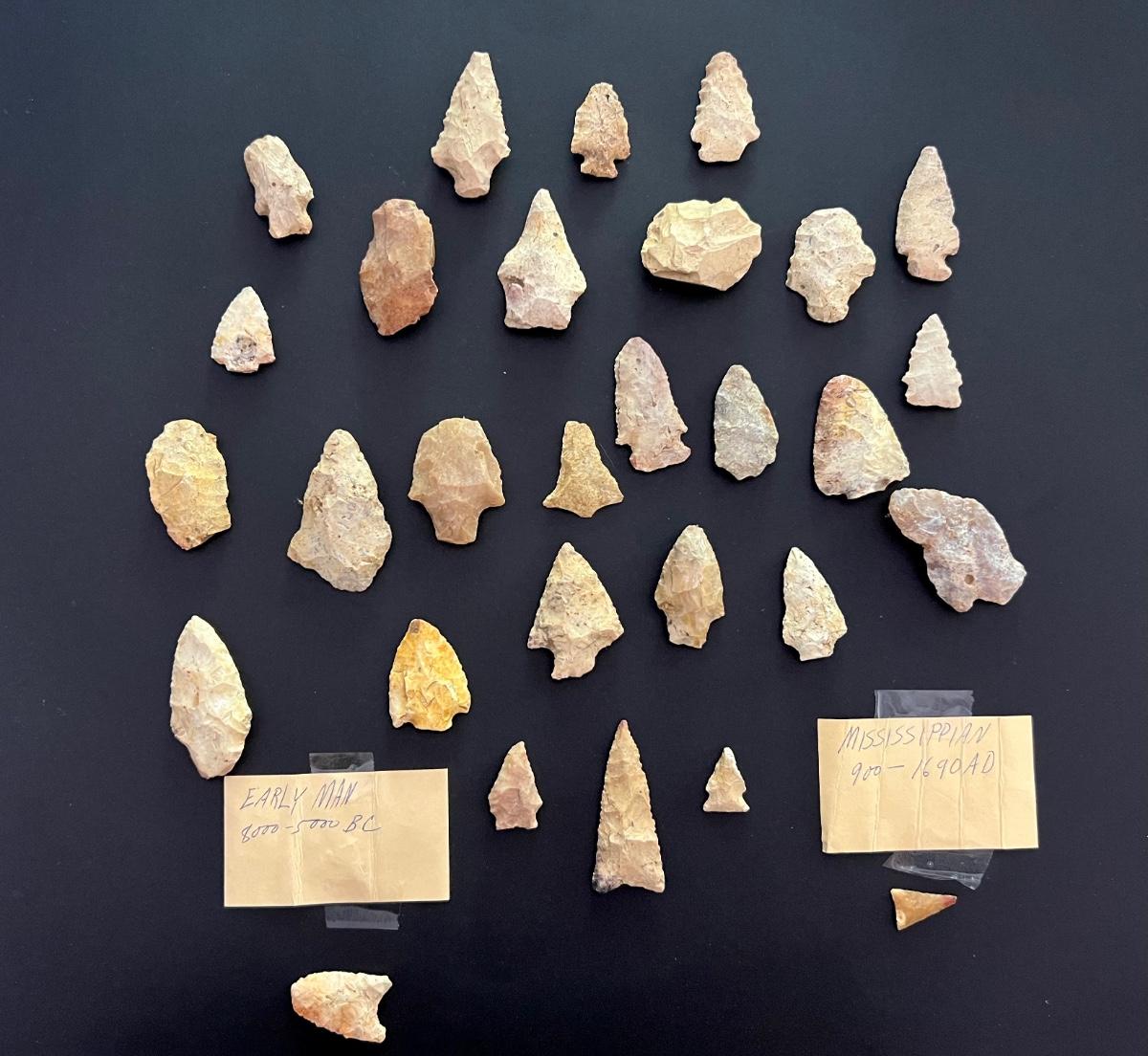 29 arrowheads are in this lot. Only two were wrapped and marked separate. One says MISSISSIPPIAN 900-1690AD. Other reads Early Man 8000-5000 BC. We have no way to verify this. See hand written notes. See pictures for general size information.