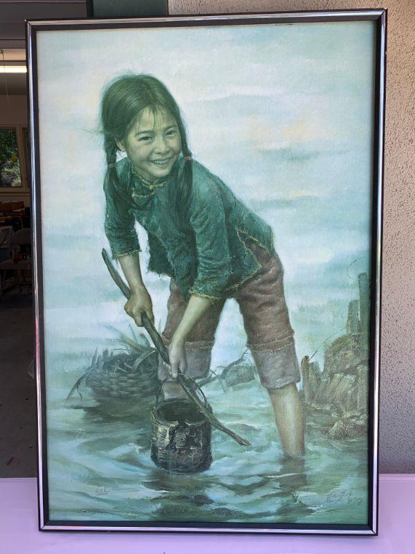Print on canvas of a happy Asian girl standing in water. In tones of blue & brown. Close up pictures are not accurate of the color. 37"x25"
