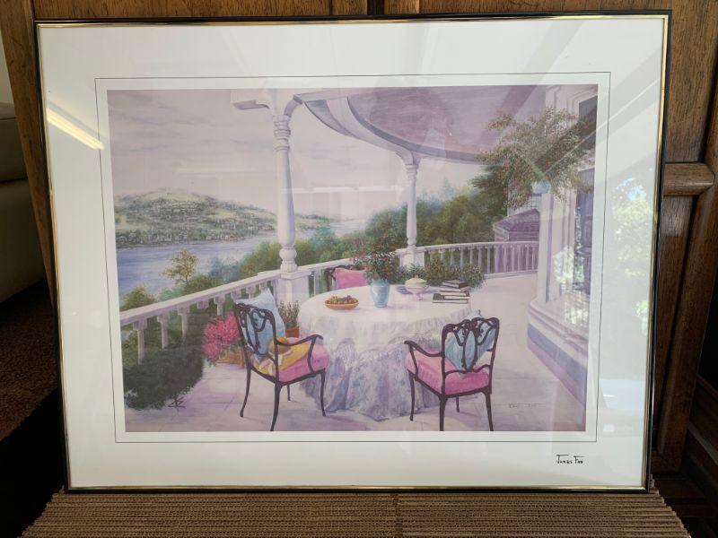 Scene on the veranda overlooking body of water. Decorative art print by James Fry