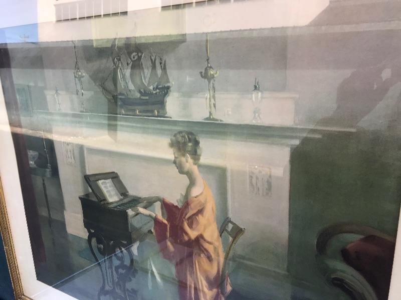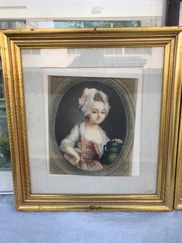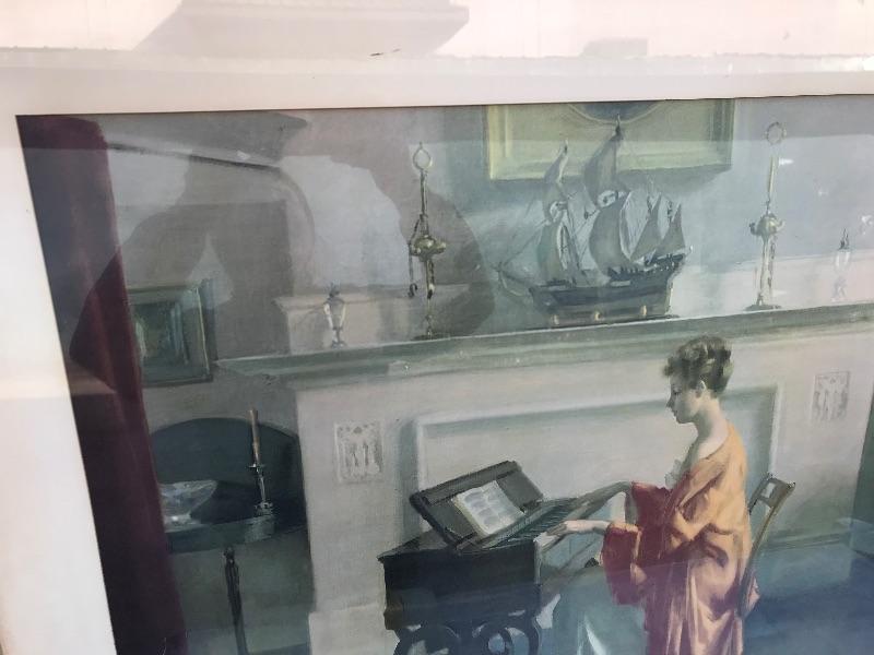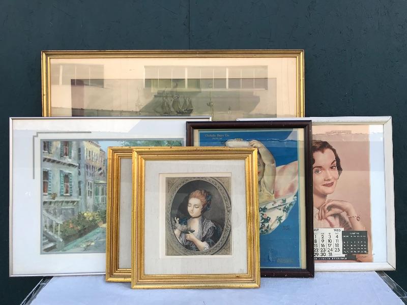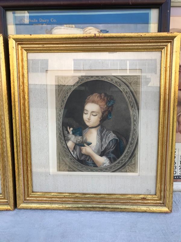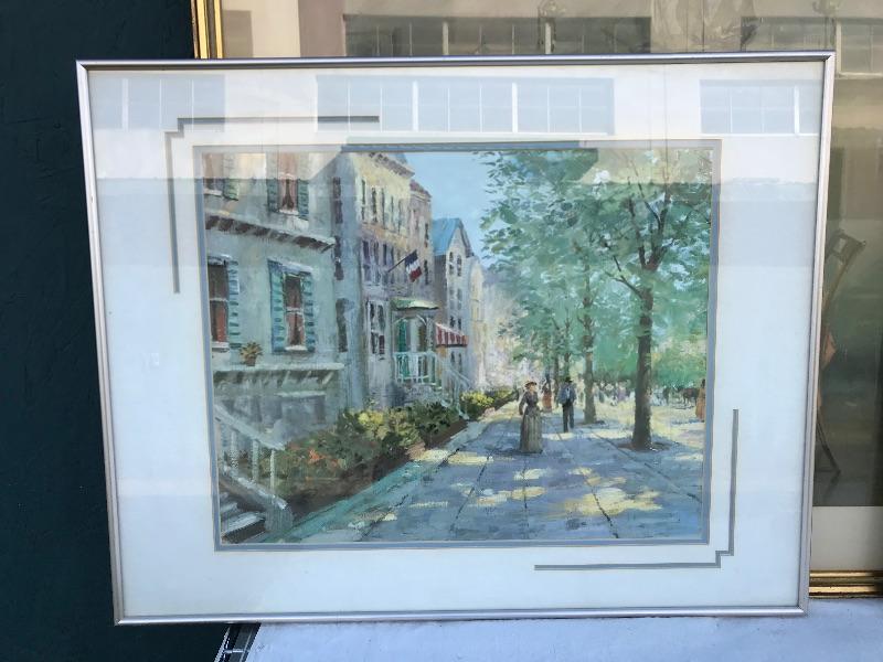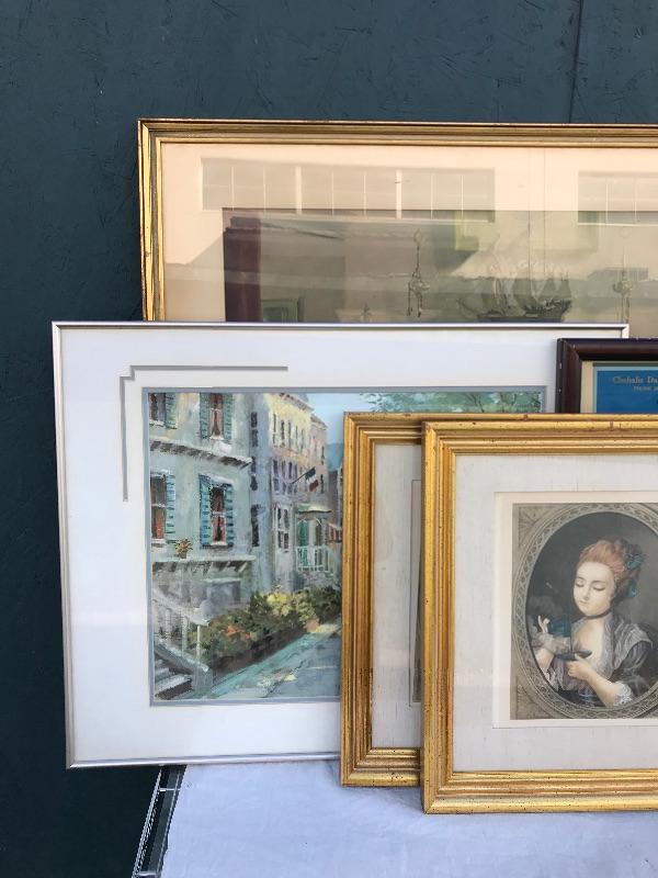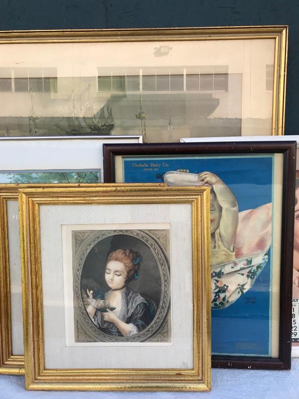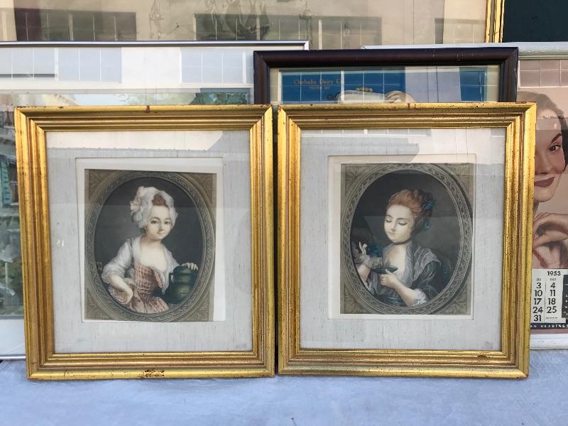 Framed pieces of art ranging from 16.75" x 18" (pair of matching portraits) to 37.75" x 32" ("At the Melodian").