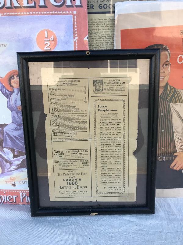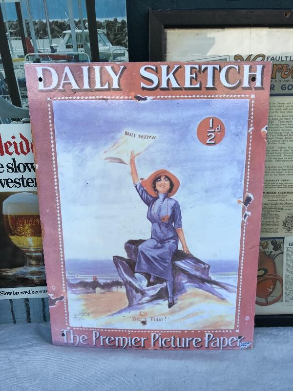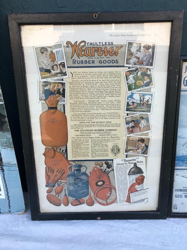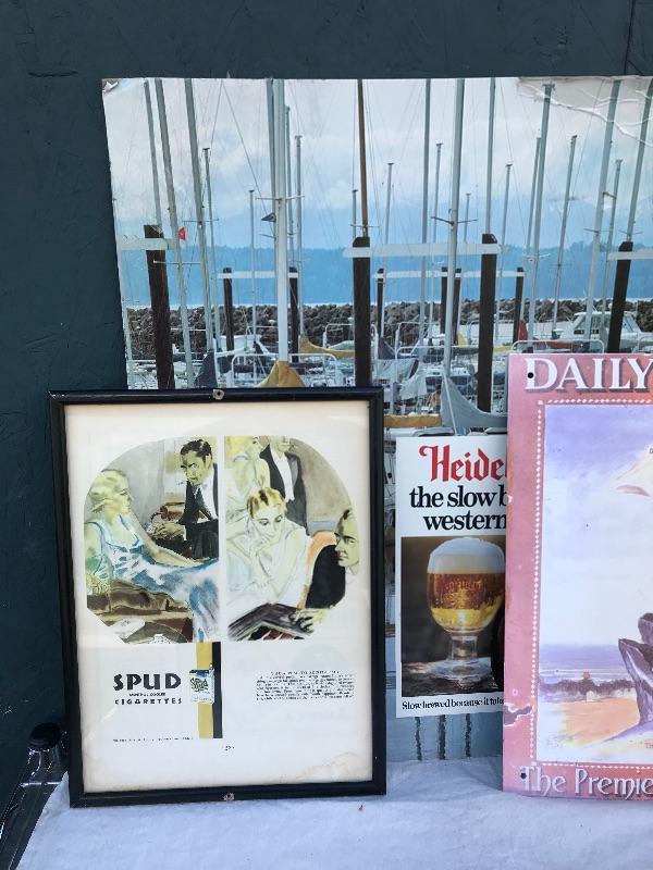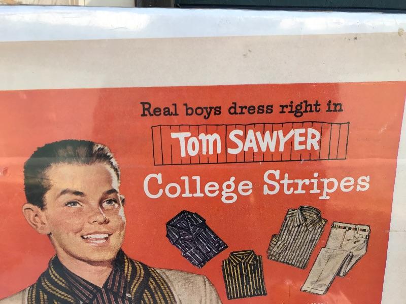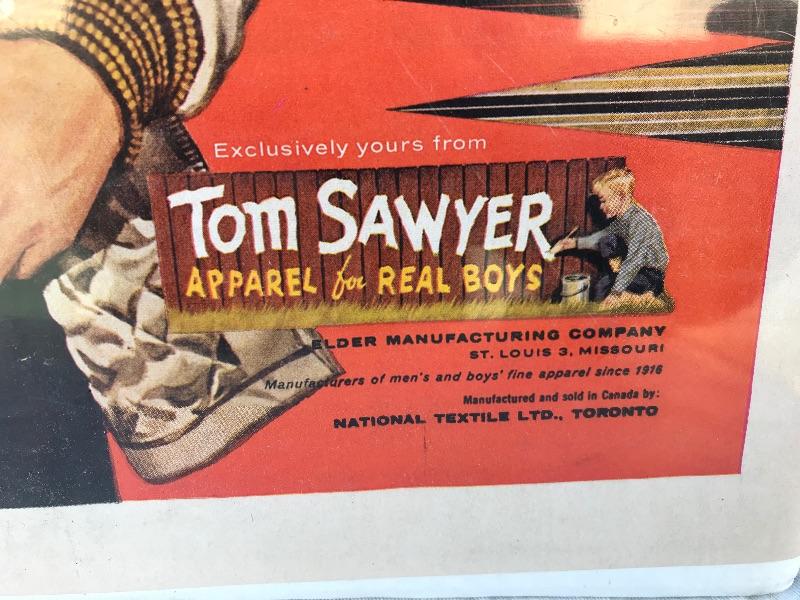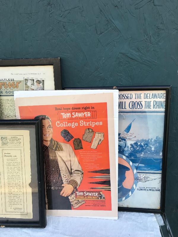 Dent's toothache Gum is 9.5" x 12". Tom Sawyer "Apparel for Real Boys" is 10.5" x 14" and is backed by cardboard wrapped in plastic. Daily Sketch is 12" x 15.75" printed on metal. SPUD Menthol Cigarettes is 11" x 14.5". Fautless "Wearever" Rubber Goods Ad is 12.75" x 17.75". General Pershing print is 11.25" x 14.75". Heidelberg beer is 18" x 24" made of cardboard.