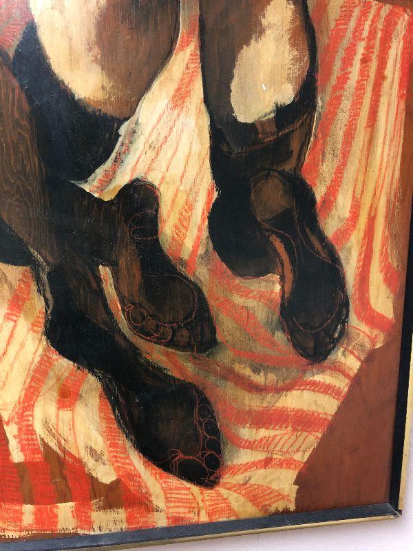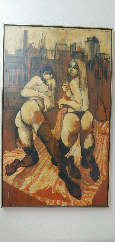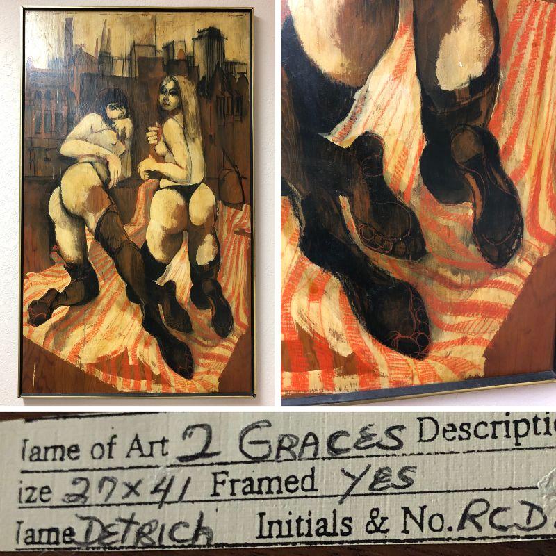 Vintage mid-century modern oil painting on board titled "2 Graces" by Chicago artist Dick Detrich 27x41