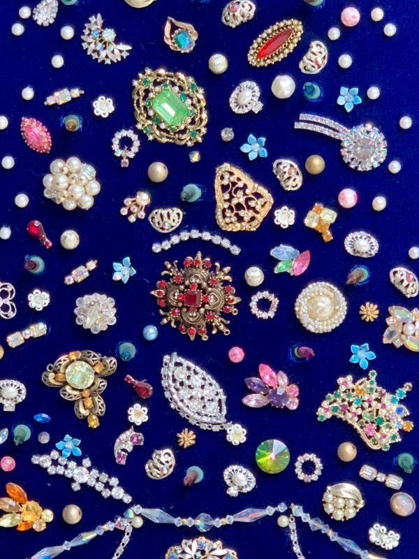 Vintage jewelry craft. Beautiful Christmas tree made from discarded pieces of jewelry. Lights up with a string of twinkle lights. Very crafty! 29 1/4"x23 1/4"