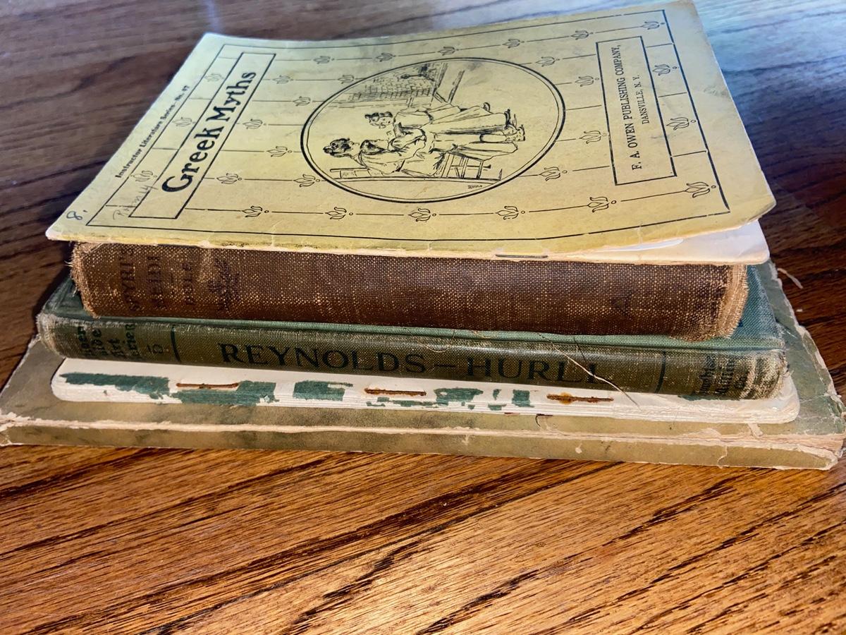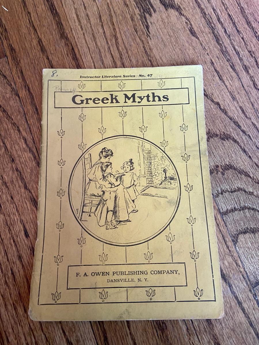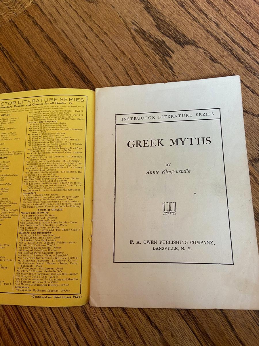 Greek Myths by Annie Klingensmith, published by F. A. Owen publishing Co., yellow pamphlet