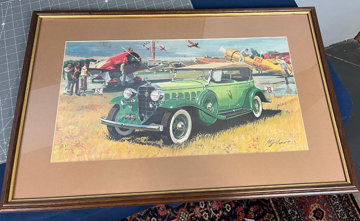 Art  ~ Antique Car Print W J Sims Framed and mated 1932 Cadillac
