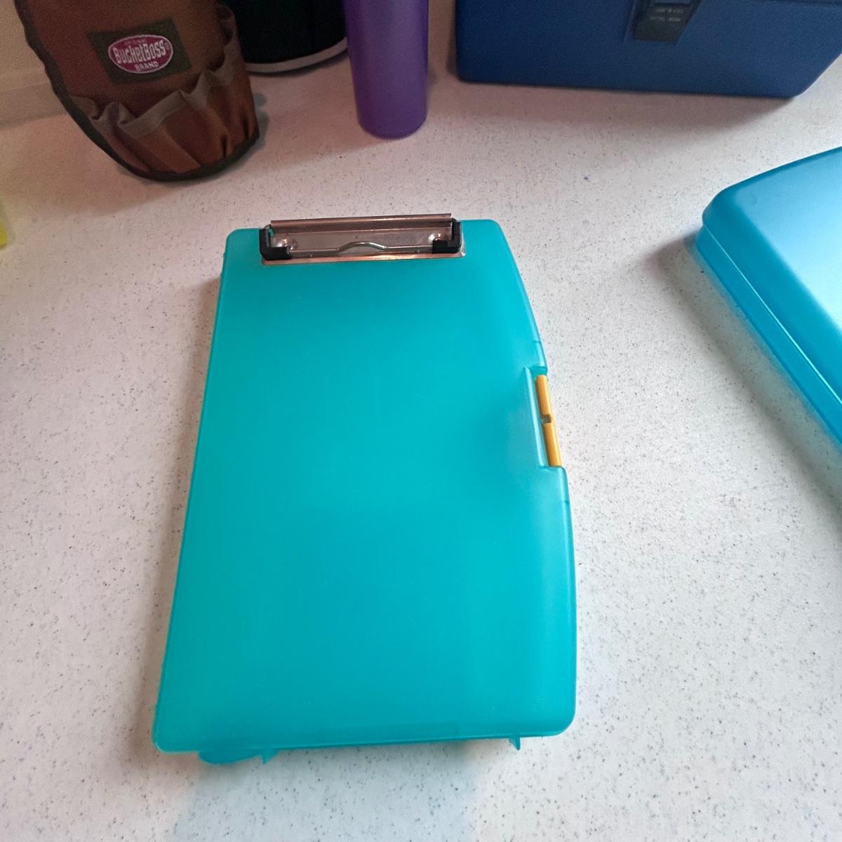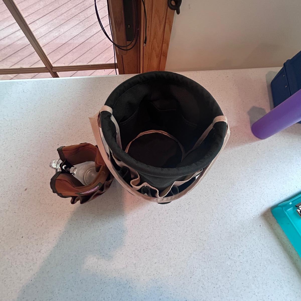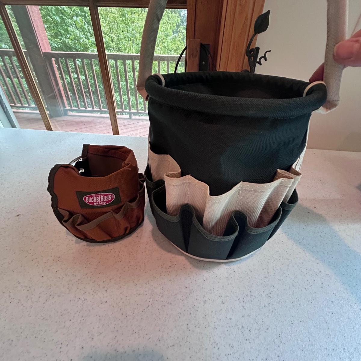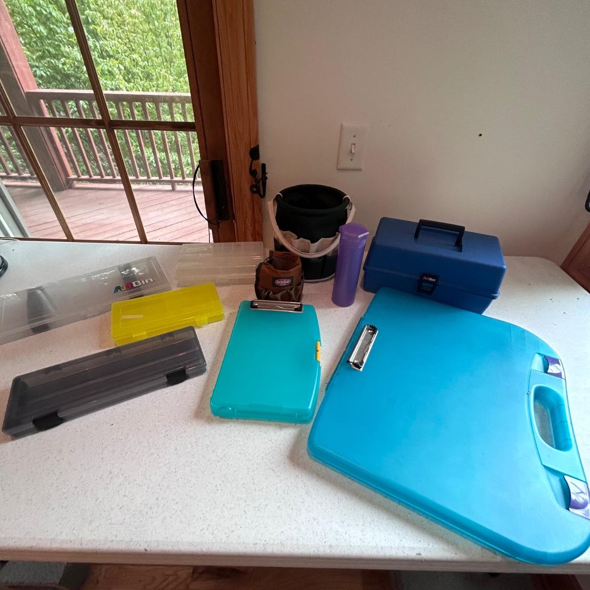 Ten plastic and canvas storage bins for any artist. The two sketch pad holders are well equipped with strong clips and the largest measures 18” x15.5”. The green bucket like one is all canvas and the bucket boss is on a glass mug but can go on any mug you like. So cute! Shipping available.