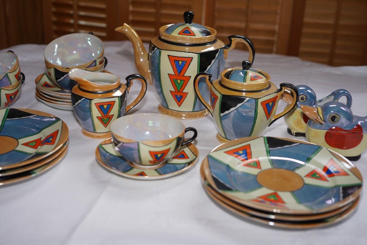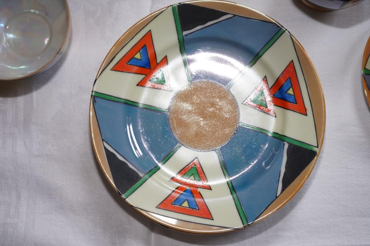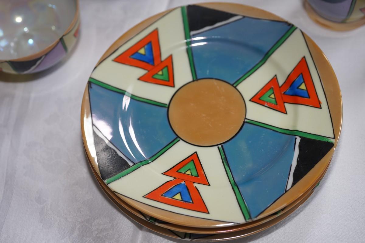 This set has the vivid geometric patterns of the popular art deco. Hand painted on the quality porcelain.