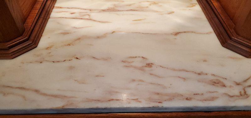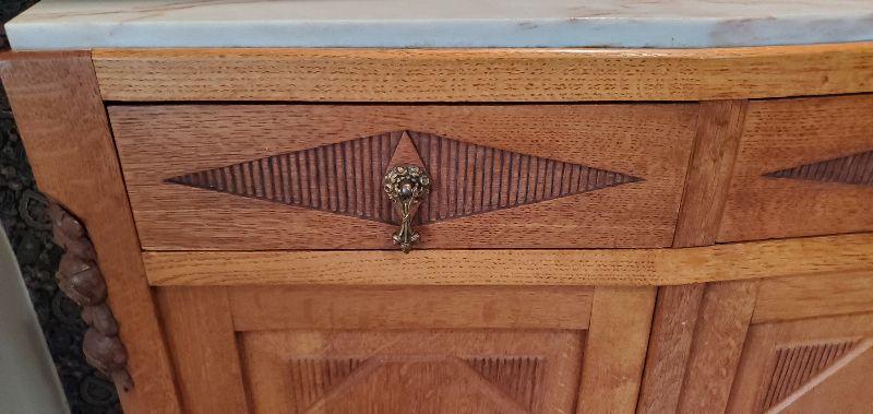 Oak Art Deco sideboard with marble top. Beautiful carving and detail. The brass key plates and drawer pulls are the shape of acorns. Two original keys are included. No cracks or breaks in the marble. The base measures: 51" wide, 18" deep, 40" tall. The top measures: 49" wide, 14" deep, 26" tall. This solid piece is in excellent condition!