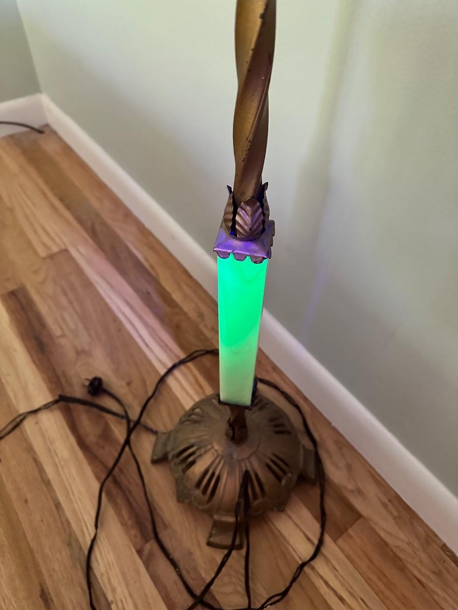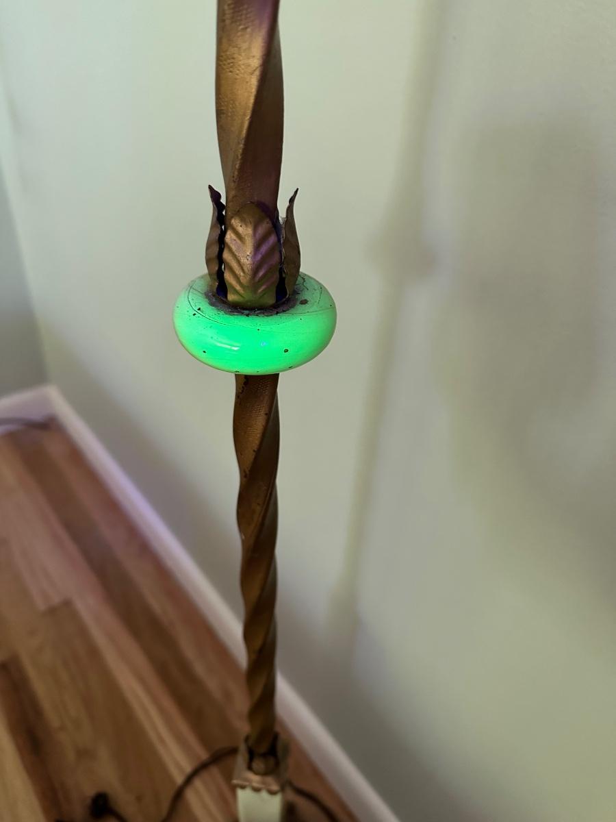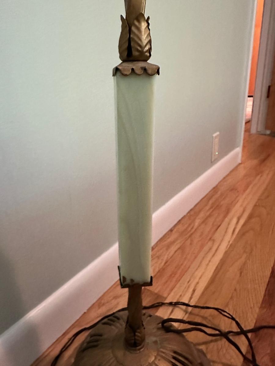 Reactive uranium glass in sea foam green and gold painted iron lamp. Needs re-wired cord is frayed.