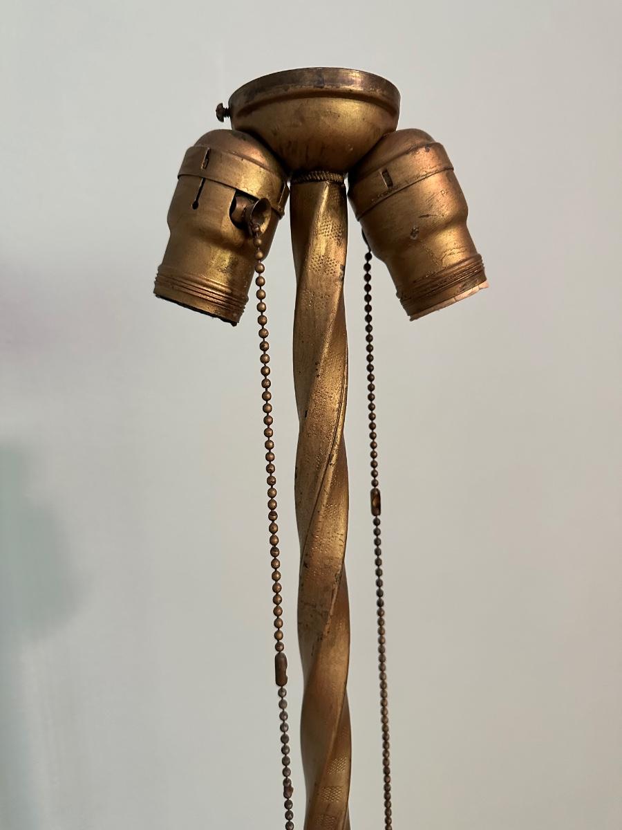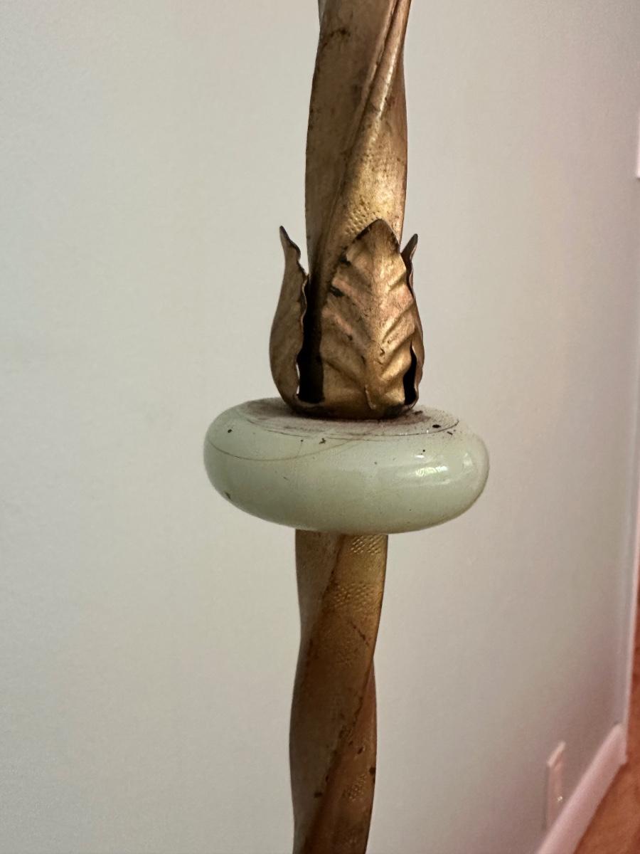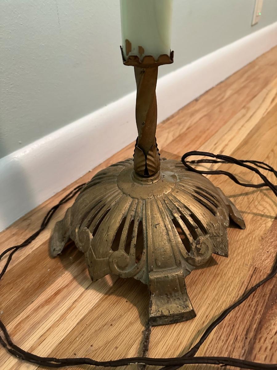 Reactive uranium glass in sea foam green and gold painted iron lamp. Needs re-wired cord is frayed.