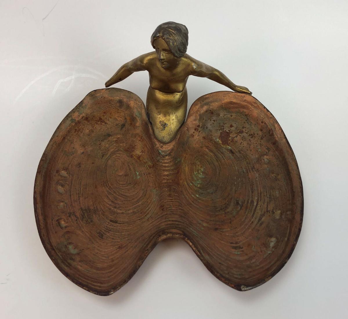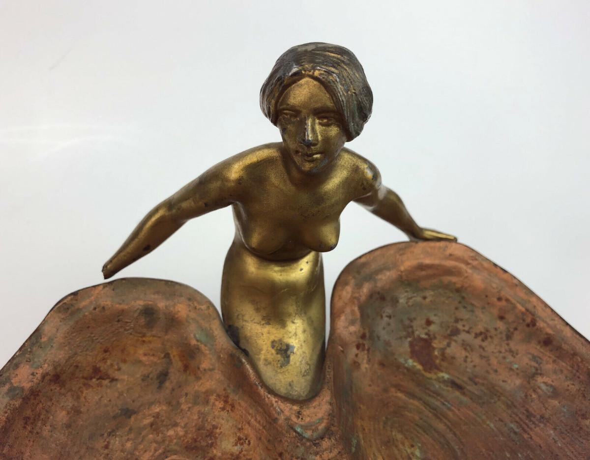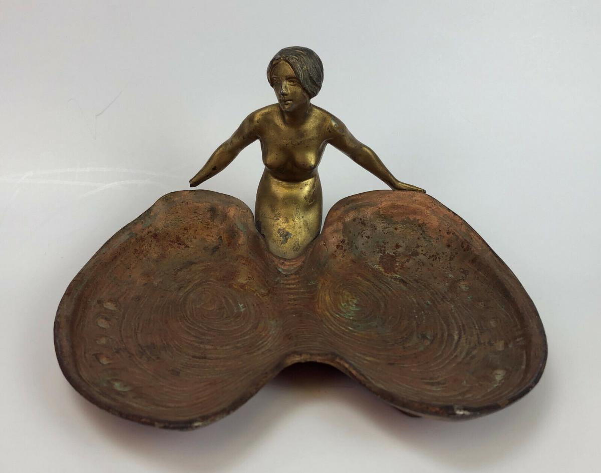 Here is an Art Deco or maybe even an Art Nouveau piece that we came across...A cast metal Nude female figure at a rippling pond...or an open shell to hold your pearls...This tray would work in a number of settings...All cast metal...Unknown maker...5 1/8" high...7 1/2" x 8 3/4" tray...Offered as found this enchanting sculpture is missing her right hand(pictured)...Some signs of age on surface...Nice patina...Offered with no reserve...