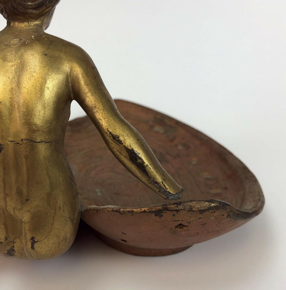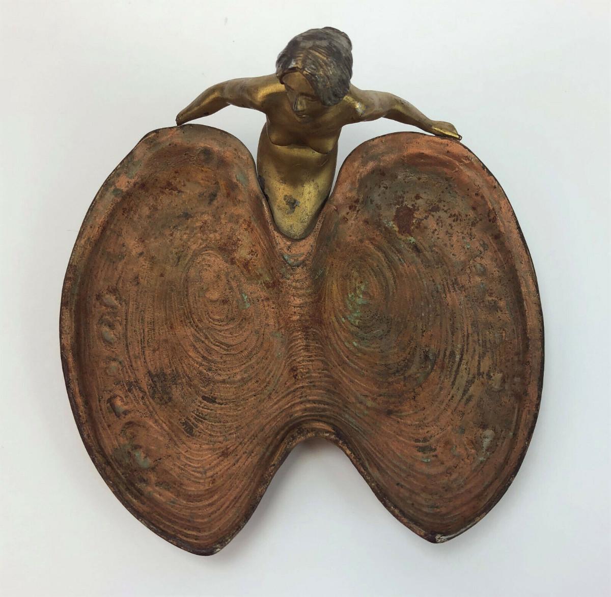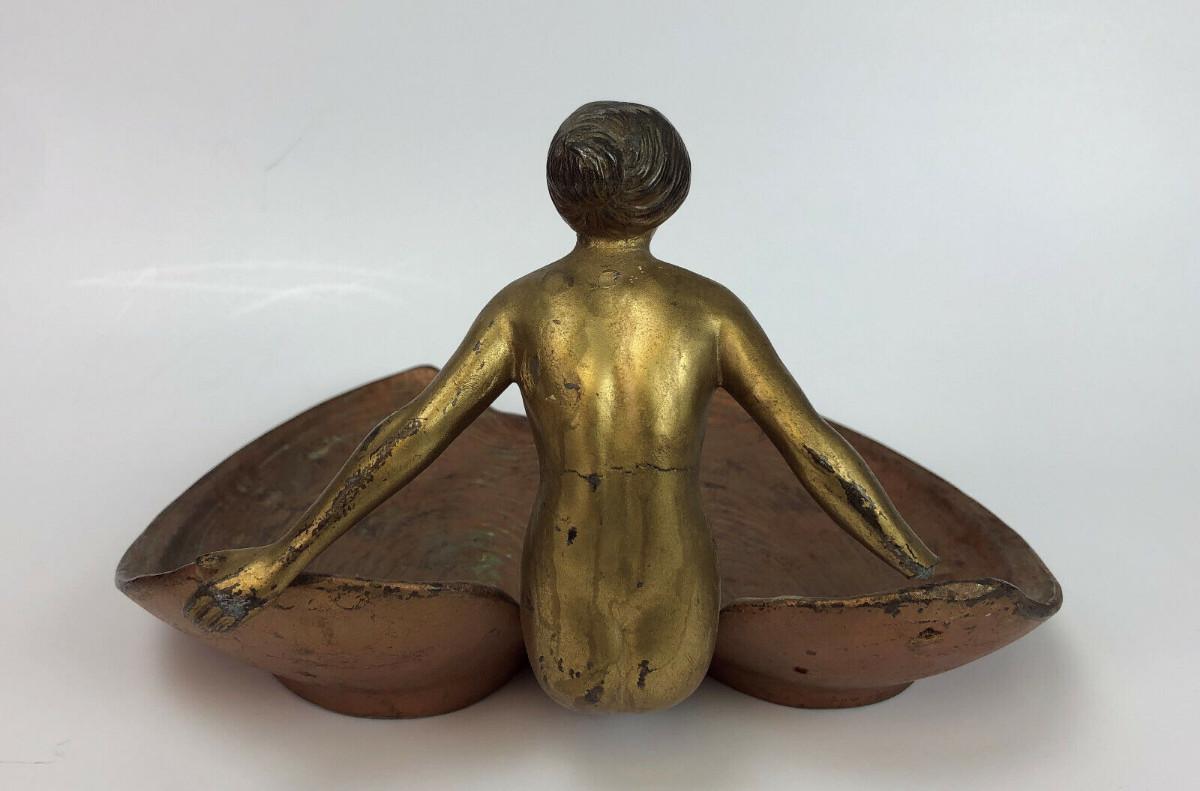Here is an Art Deco or maybe even an Art Nouveau piece that we came across...A cast metal Nude female figure at a rippling pond...or an open shell to hold your pearls...This tray would work in a number of settings...All cast metal...Unknown maker...5 1/8" high...7 1/2" x 8 3/4" tray...Offered as found this enchanting sculpture is missing her right hand(pictured)...Some signs of age on surface...Nice patina...Offered with no reserve...