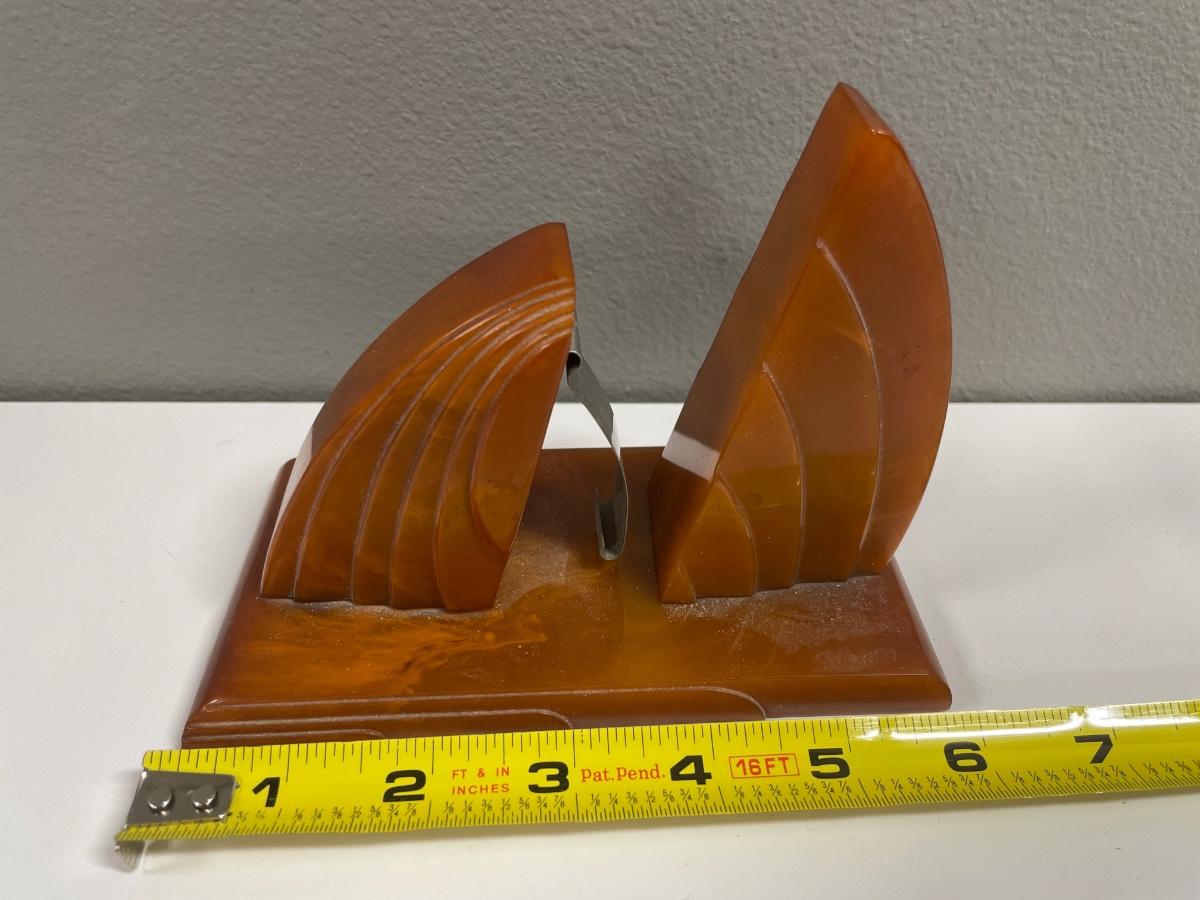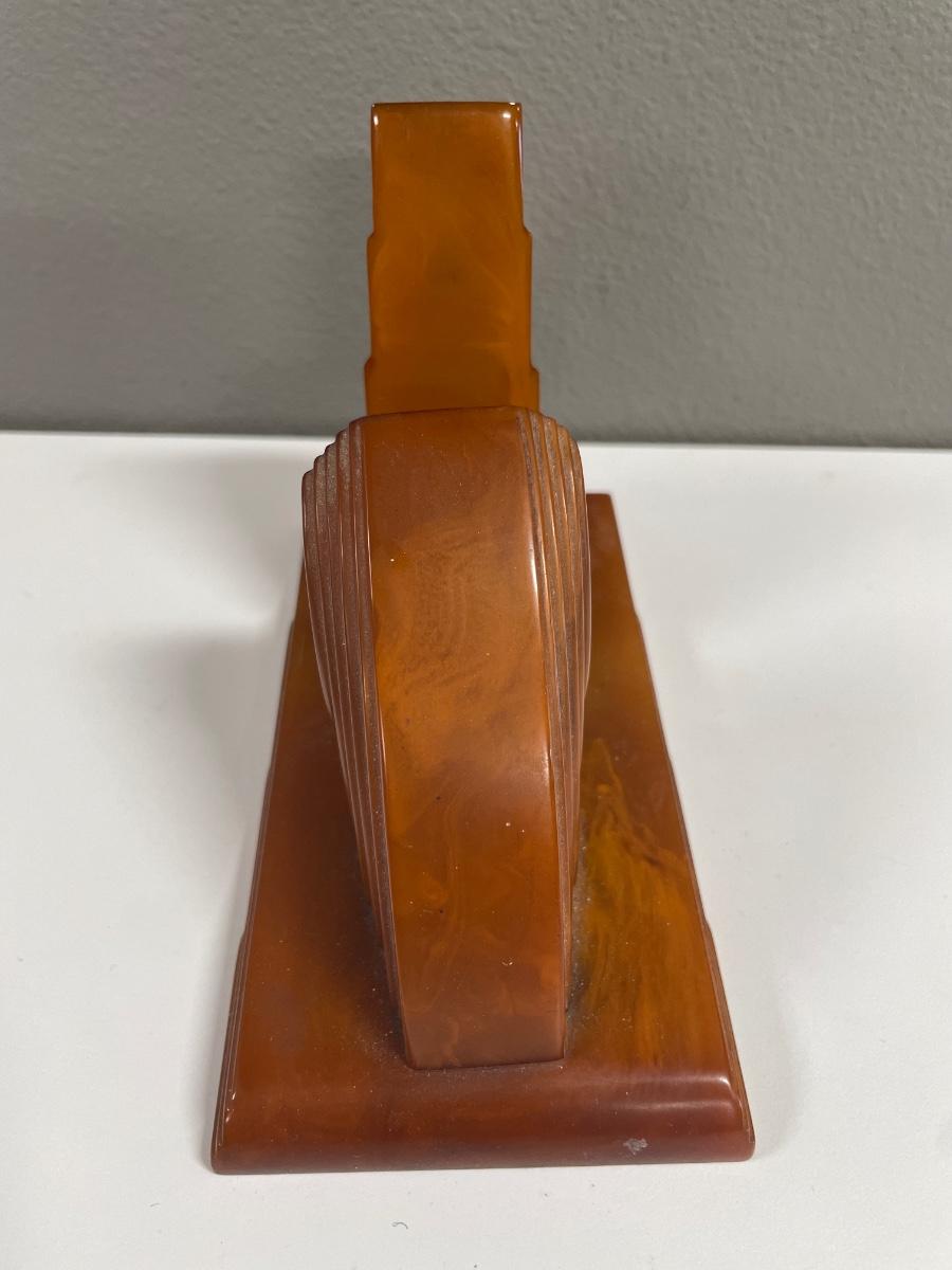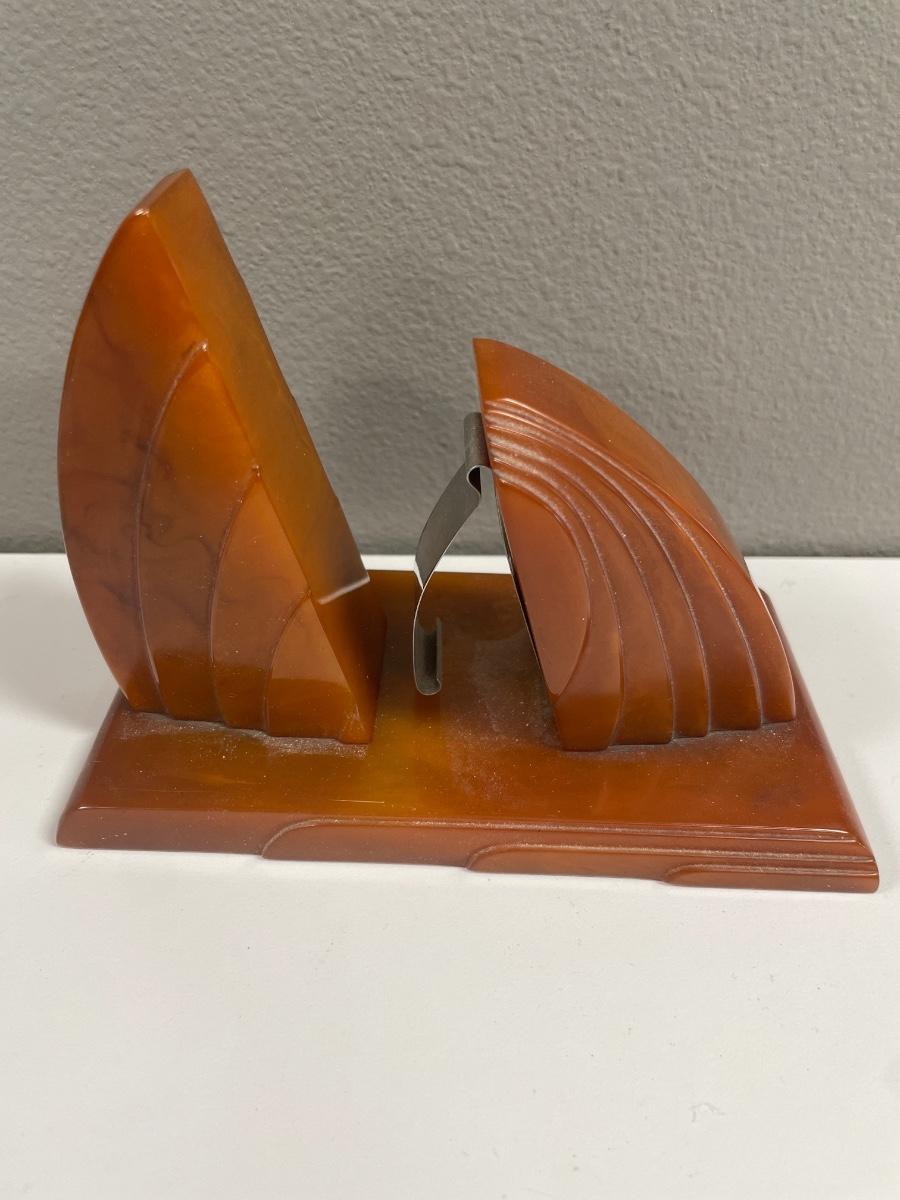 In very good shape art deco Bakelite letter paper holder in dark amber color