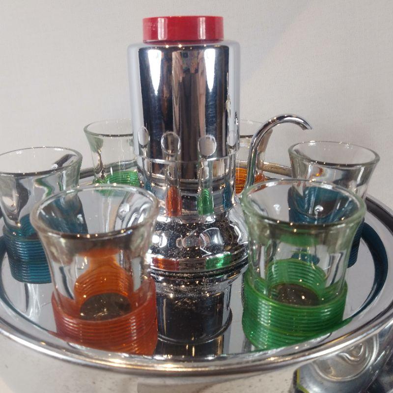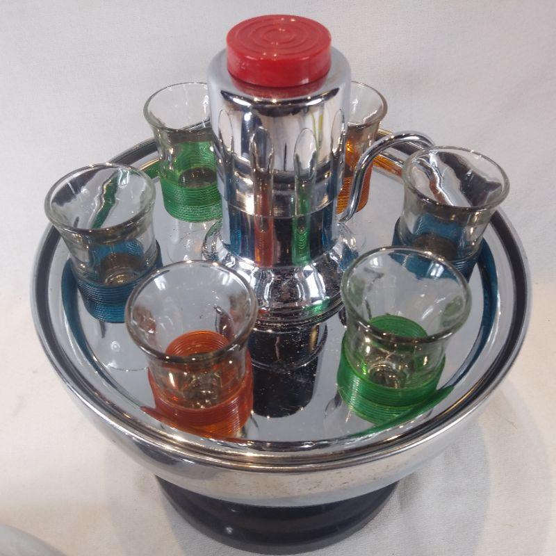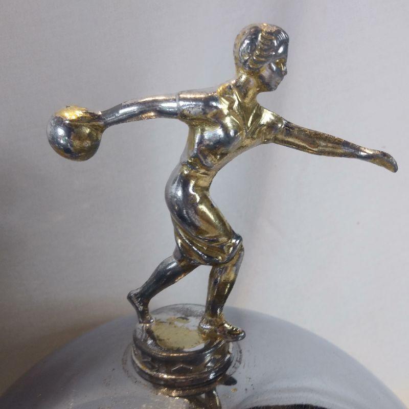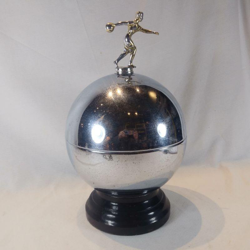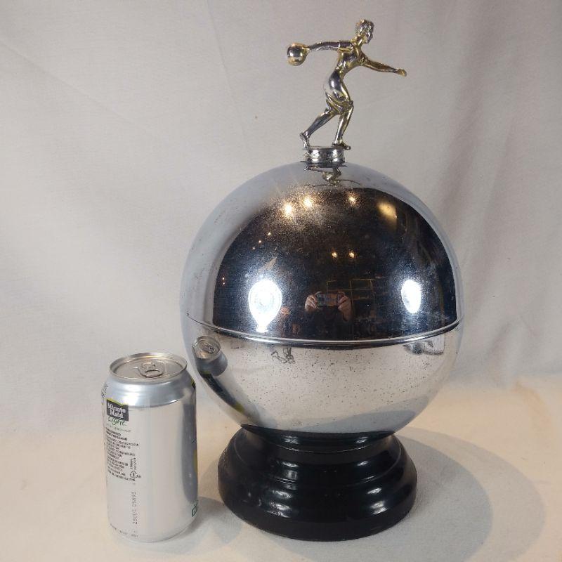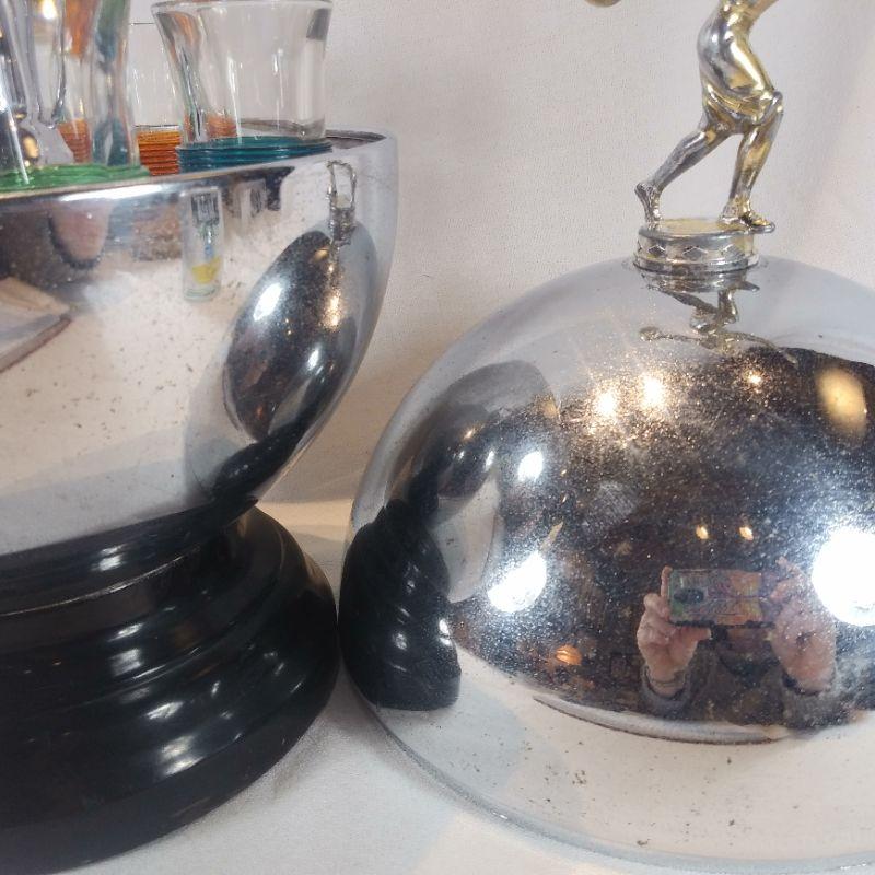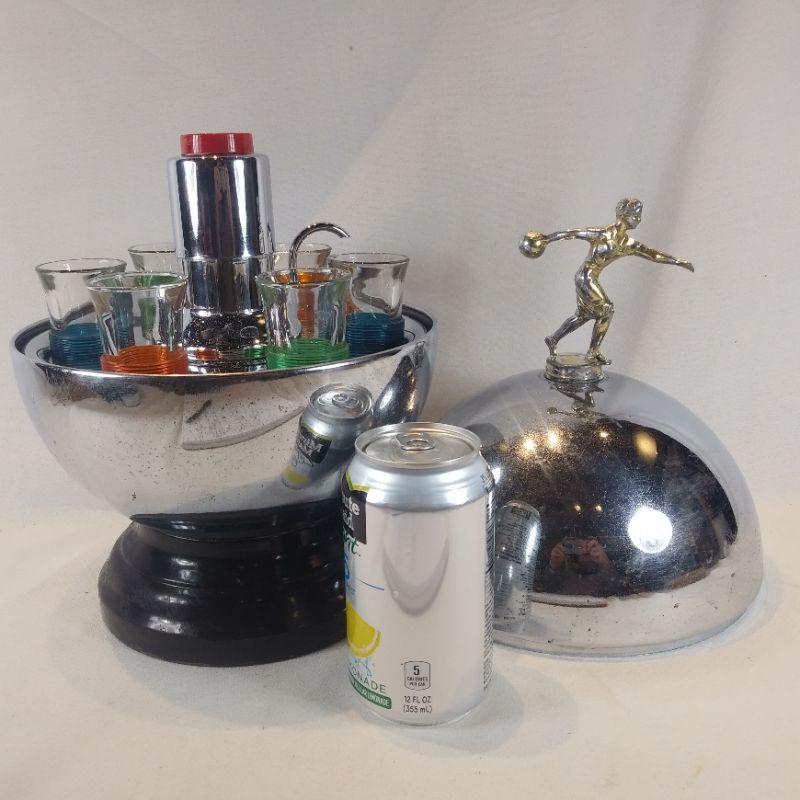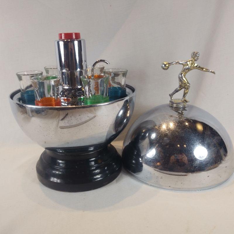 Art Deco Bowling Trophy Bar Set. This is one cool bar set. It houses a bottle with pump and 6 shots. All in good working condition and are intact. Chrome shows pitting due to age and some chrome loss to the bowler - consistent with age. It measures 14 1/2-inches tall X 8 1/2-inches in diameter. Over all in good condition. Reserve Price $20.