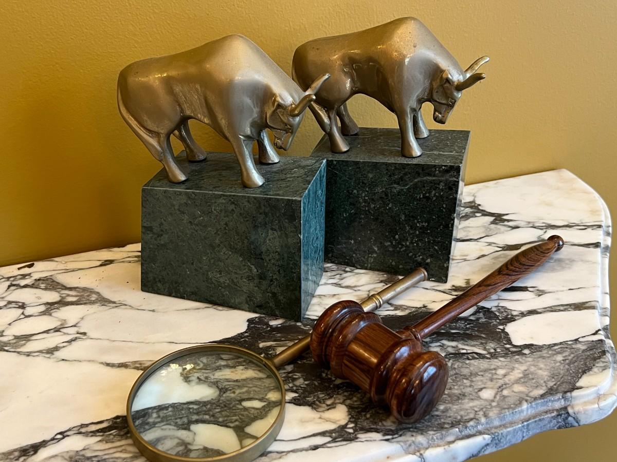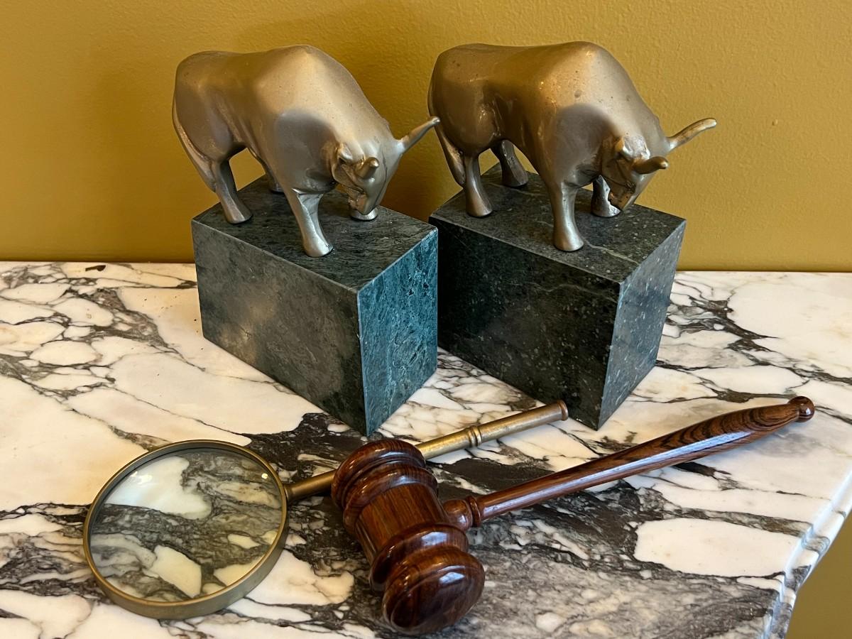 Art Deco Brass Bull on Marble Book Ends with Wood Gavel and Brass Magnifying Glass