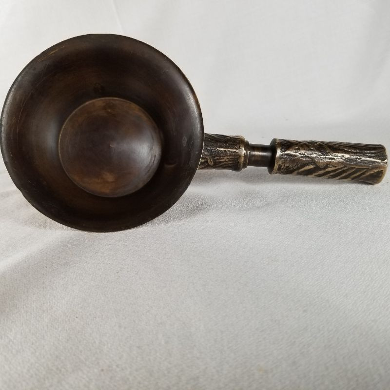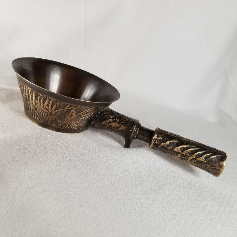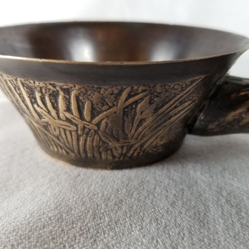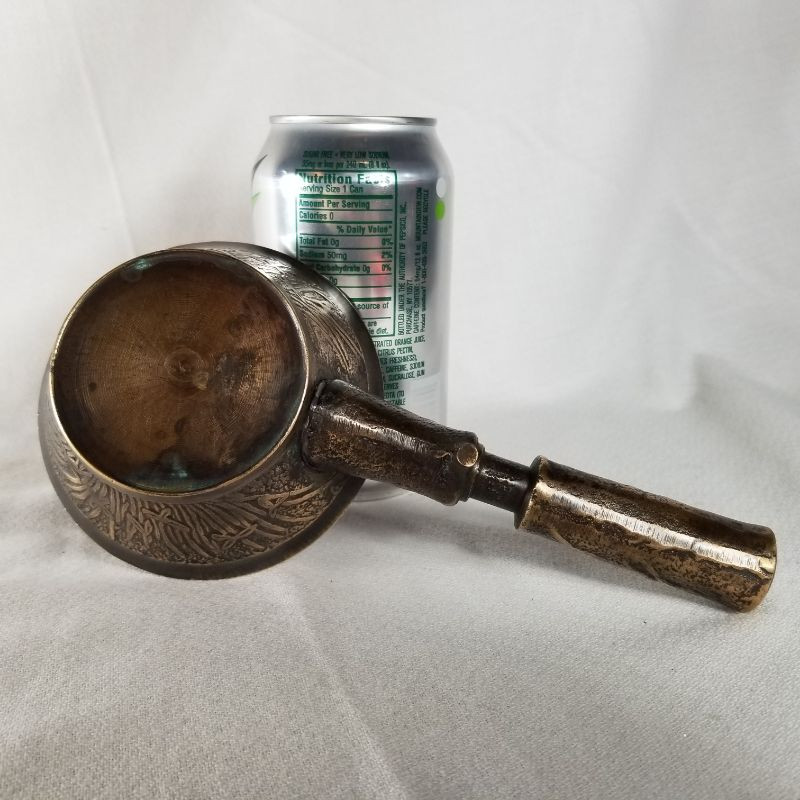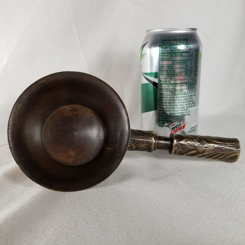 This is an amazing bronze, Art Deco, handled scoop or cup. The embossed design is wonderful. It looks to be solid bronze and is very heavy for its size. The scoop measures 8-inches long X 4-inches wide X 1-1/3-inches tall. Very good condition. Very pretty. Very unusual - would look great sitting on a bookshelf next to all those World Classics.