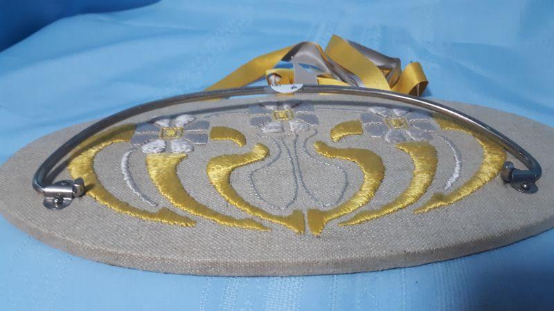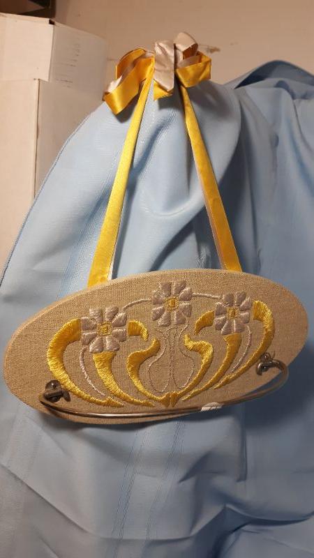 Art deco embroidered wall hanger / rack in EUC, 12"W