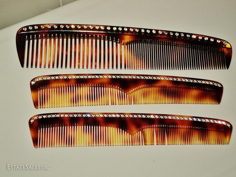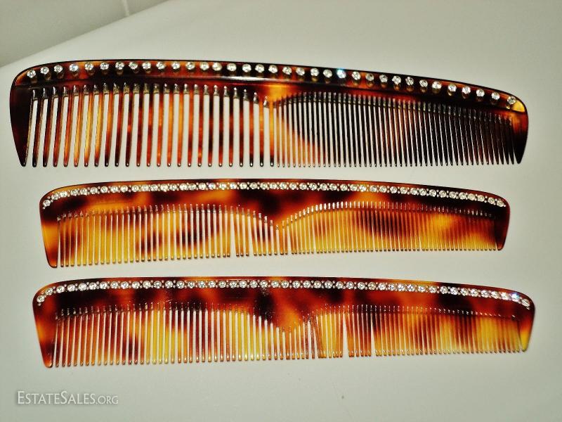 Magnificent Art Deco set of Tortoise combs with crystal stones by famous French accessory Designer Francois Huchard, France. Circa late 1930's early 1940's and exquisite.