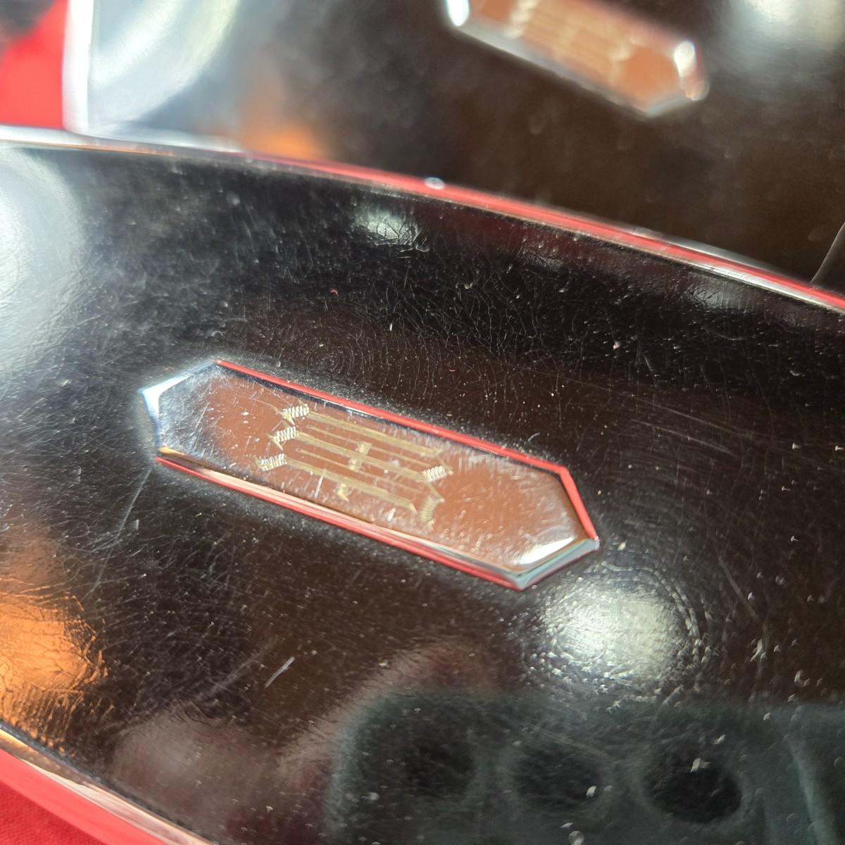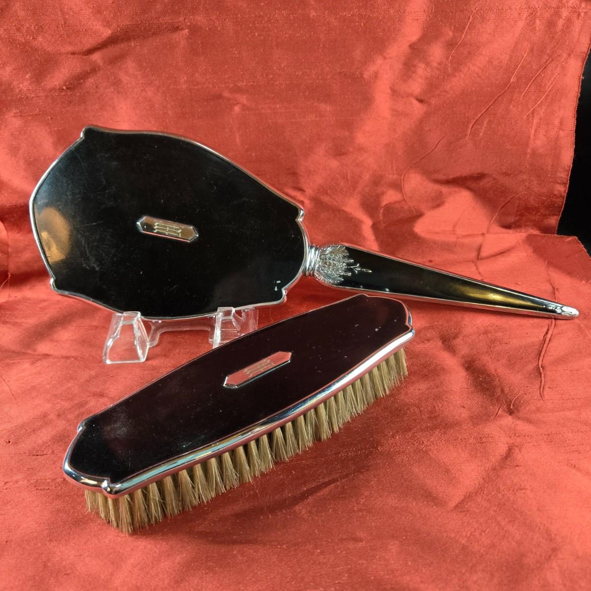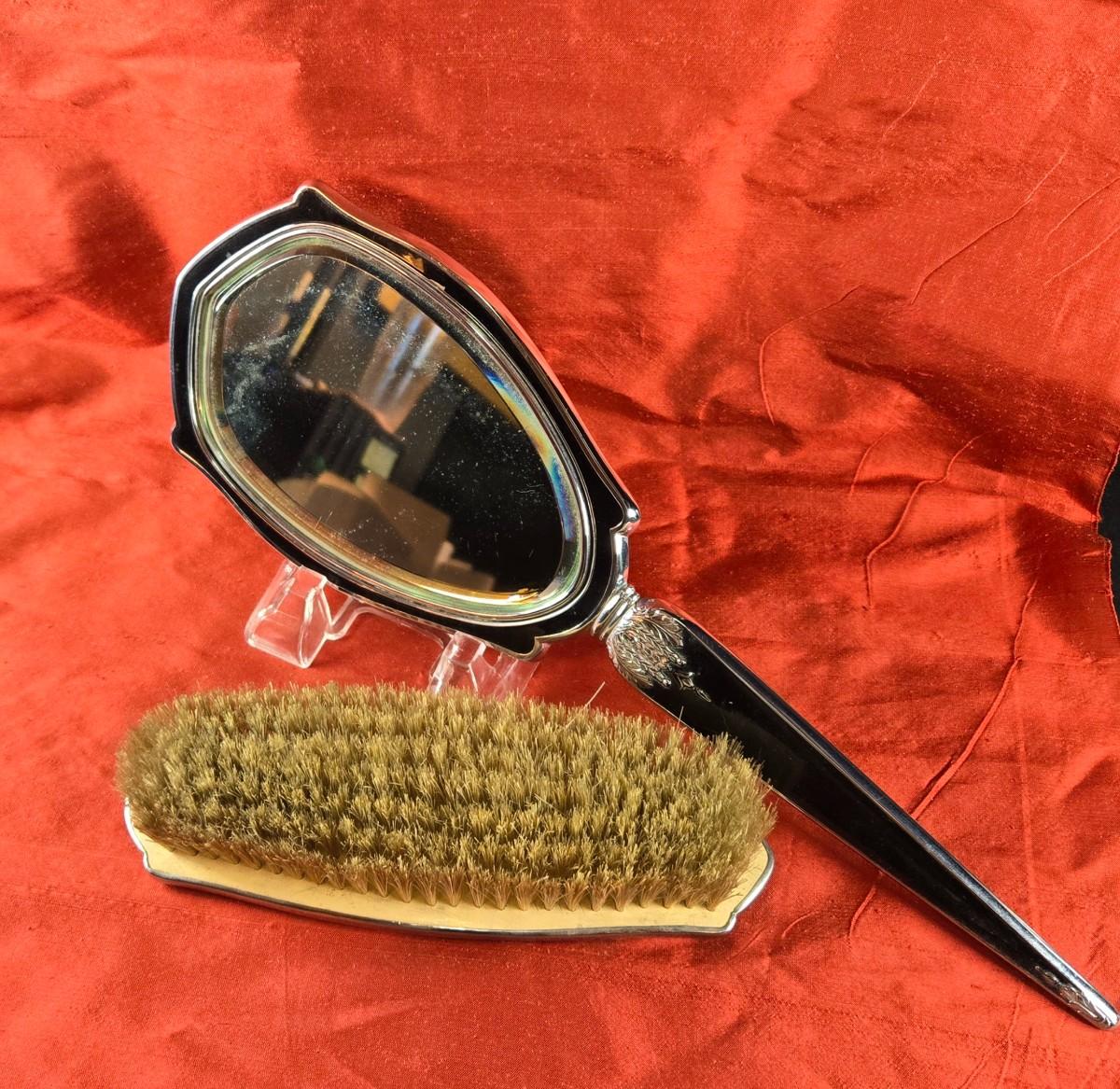 This auction lot is for a Art Deco Hand Mirror and Brush Set, This item is a black and silver hand mirror and clothes brush set. It is monogramed with the letter "M". There is some age crazing and a paint chip on the mirror back (see picture). The mirror shows slight age fogging. Mirror is about 13-inches long, the brush is 7-inches long. Both items are good for their age.