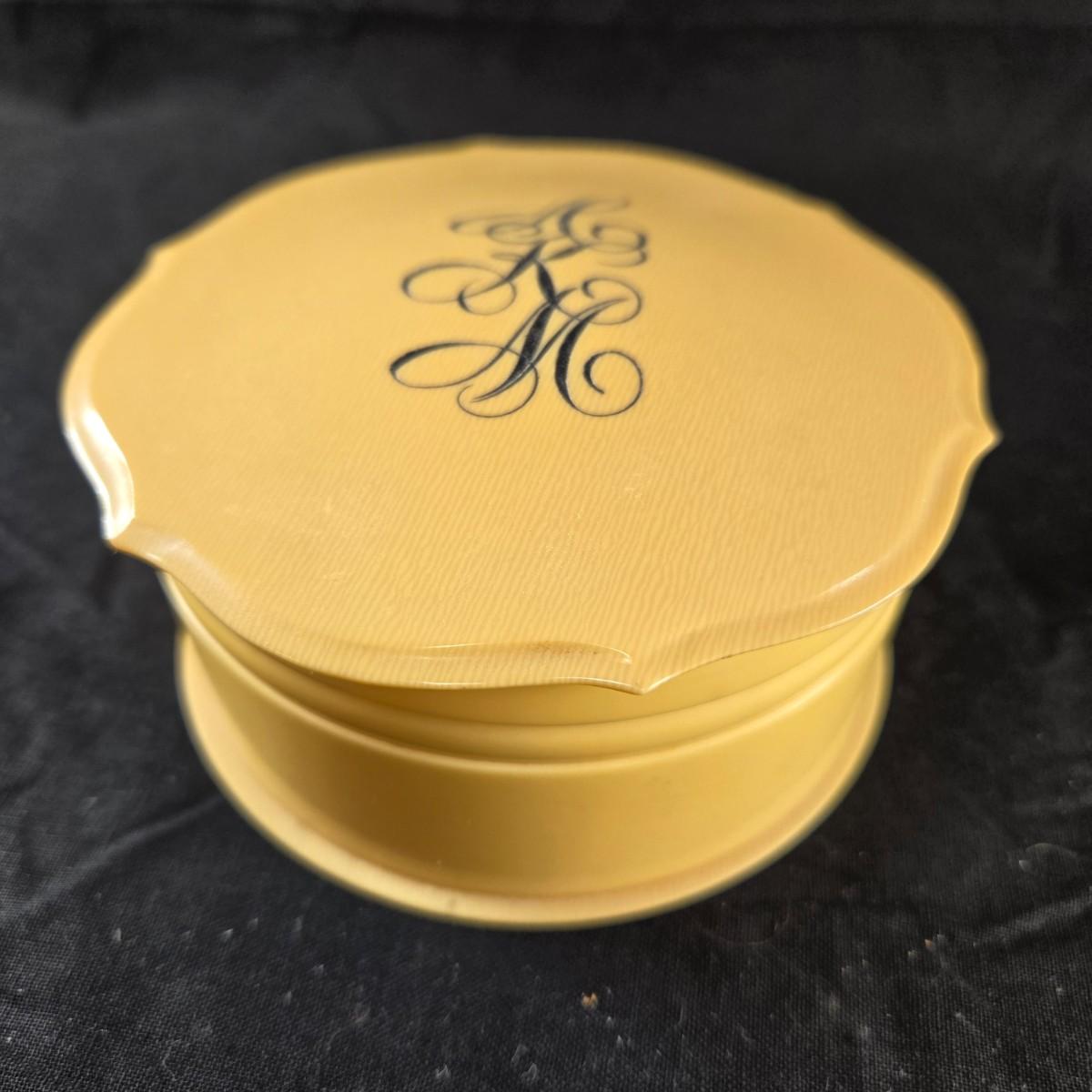 This auction lot is for a Art Deco Hand Mirror and Brush Set and a Vintage Powder Box. This item is a black and silver hand mirror and clothes brush set. It is monogramed with the letter "M". There is some age crazing and a paint chip on the mirror back (see picture). The mirror shows slight age fogging. Mirror is about 13-inches long, the brush is about 7-inches long. Both items are good for their age. This also include a vintage powder box. This is a vintage item - it is monogramed with the initials AKM. We think the powder box is celluloid?. It is in very nice condition for its age. The box measures about 4.5-inches diameter X 2-inches tall.
