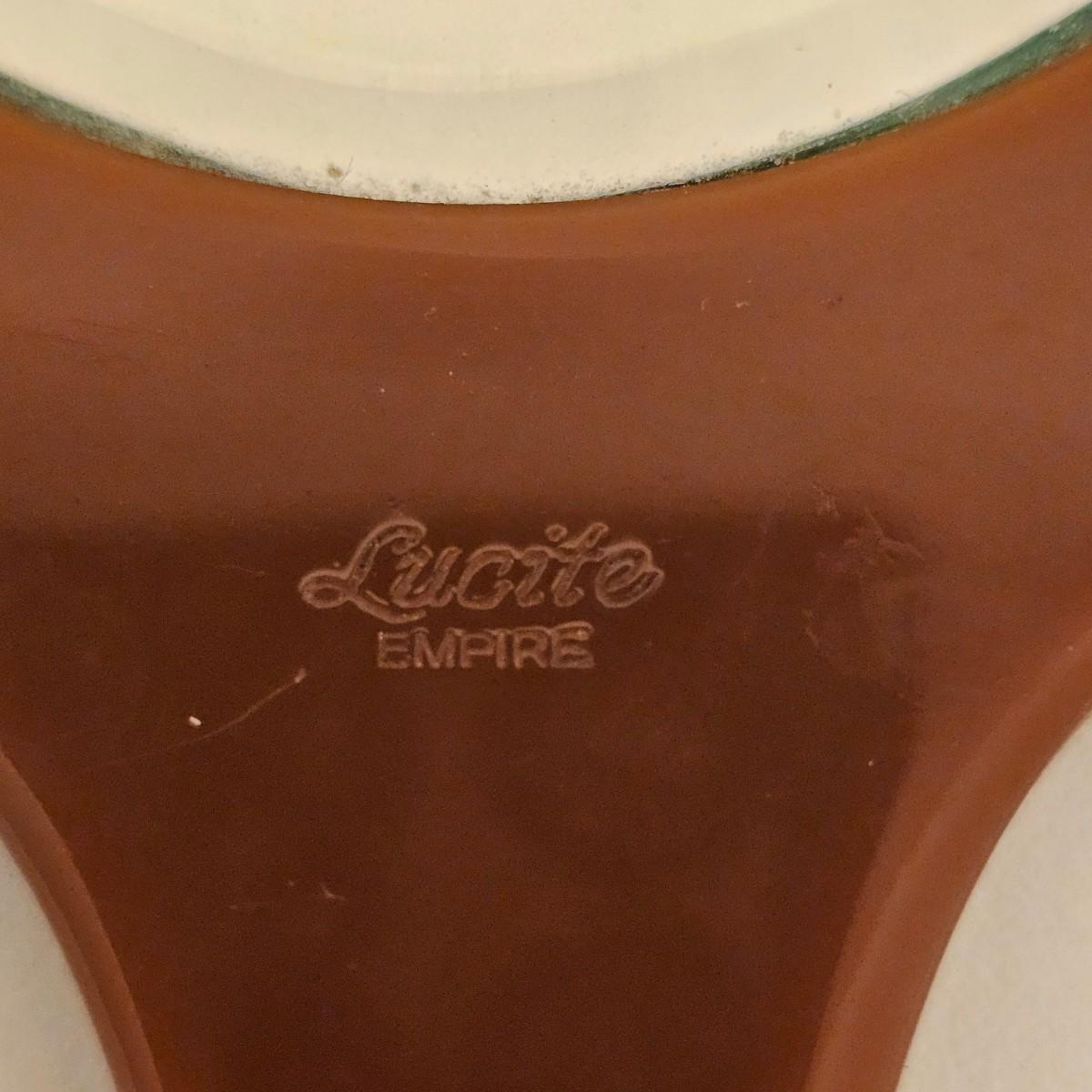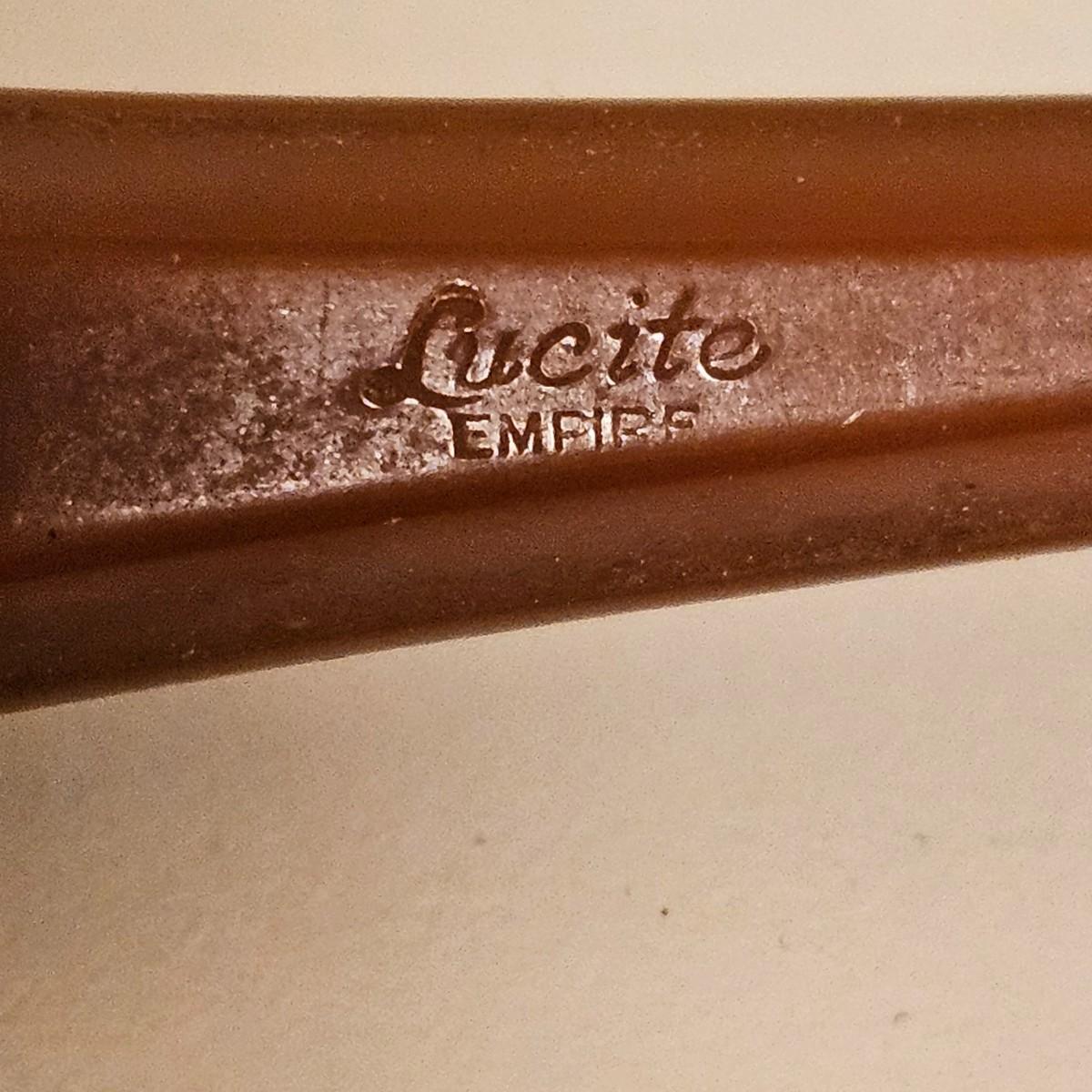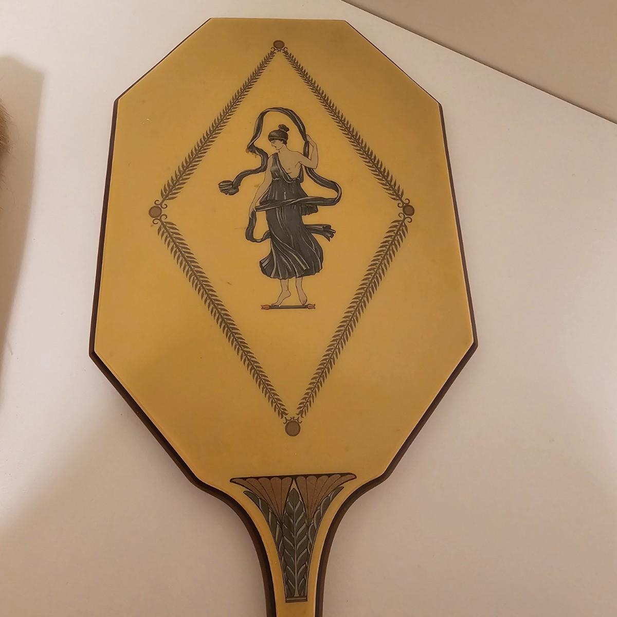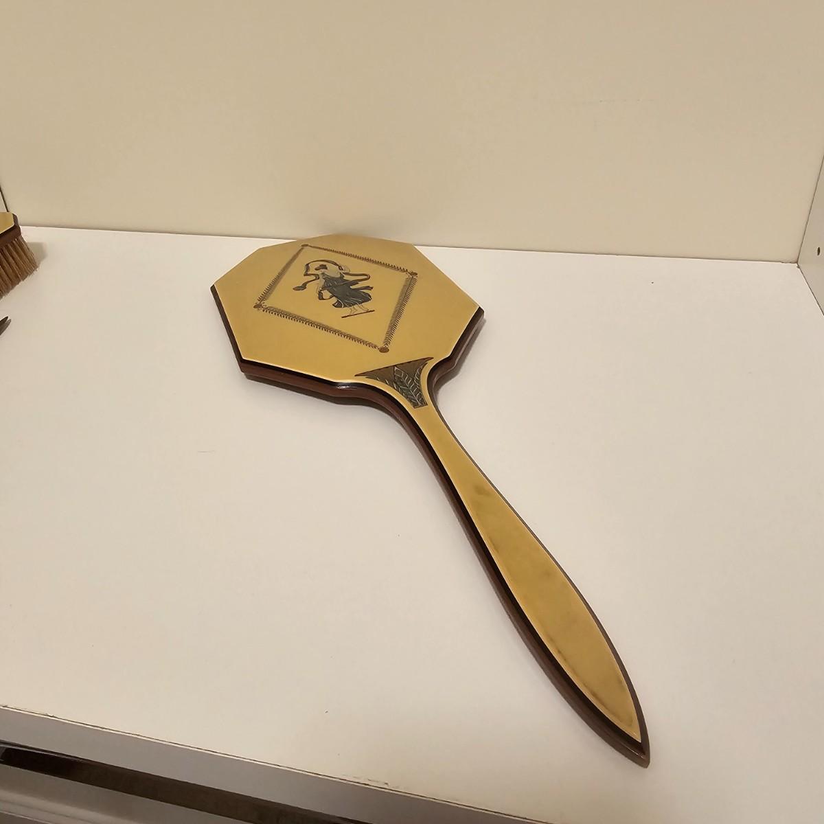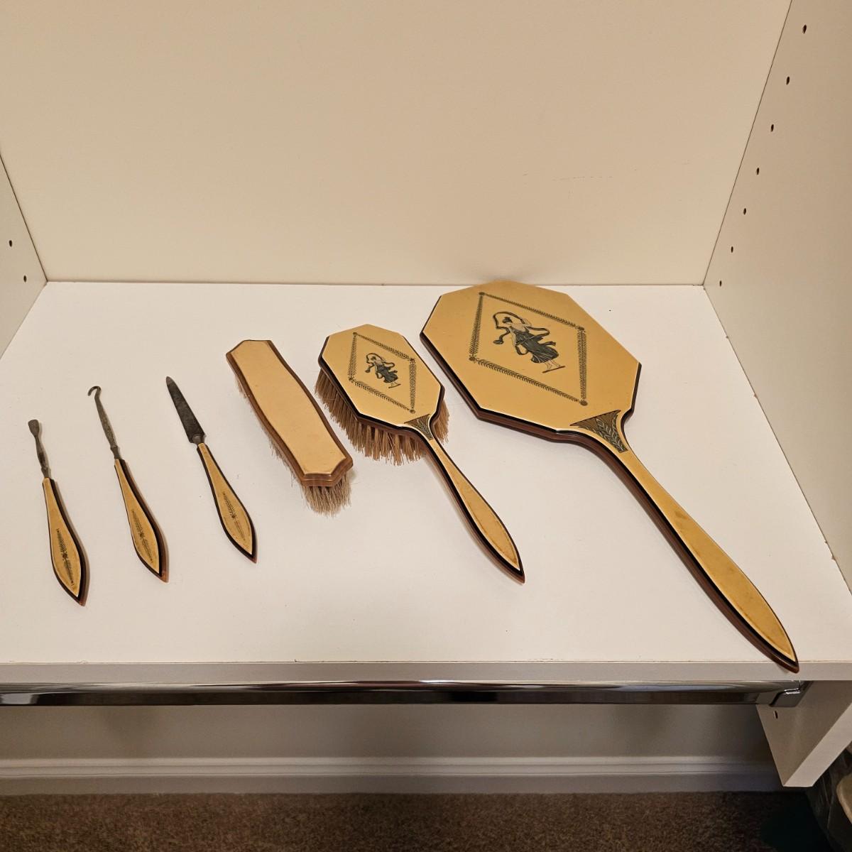 Vintage Lucite vanity set in beautiful caramel and tan colors. Part of the 'Empire' style line, this six piece set is probably from the 1930's or 1940's. Many of these were made by Dupont during that time and had the image of a Grecian goddess displayed on the backs. The set has a hand mirror, 5.5" x 15" H, a hair brush, clothes brush, nail file and cuticle tool and a button hook, 7.5" long. Hand mirror has beveled glass mirror. 'Lucite' and 'Empire' markings on most items. Clothes brush may be from another set but matches closely in color. Also included is an Art Nouveau style jewelry chest or casket, used for storing small jewelry like rings or earrings. Appears to be made of aluminum with bas relief decoration, and faux velvet lining. Measures 5" x 3" x 5"H. See photos for details. Shipping available.