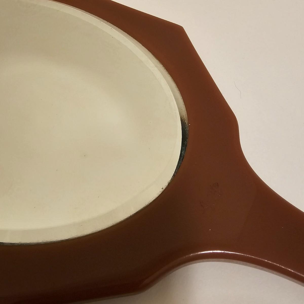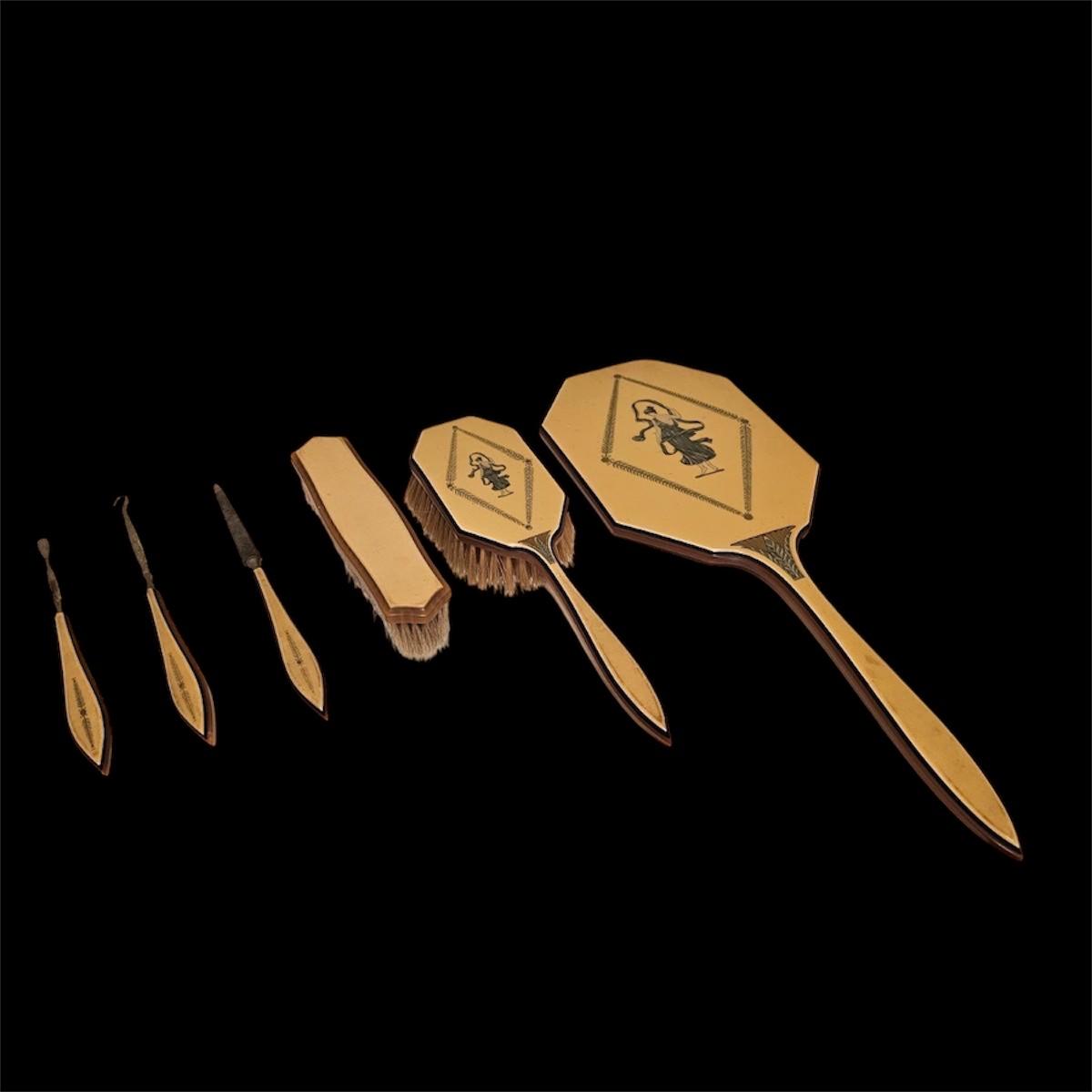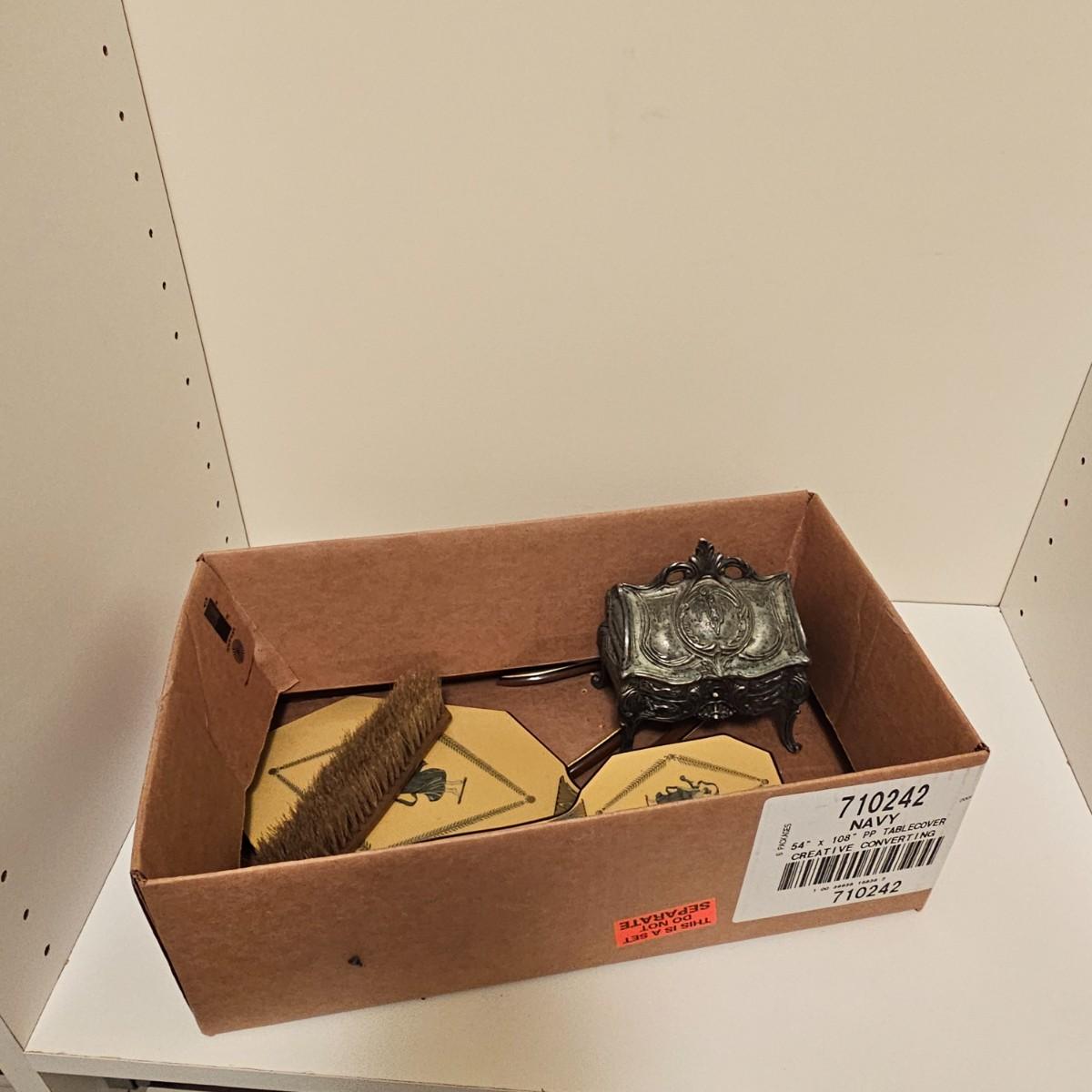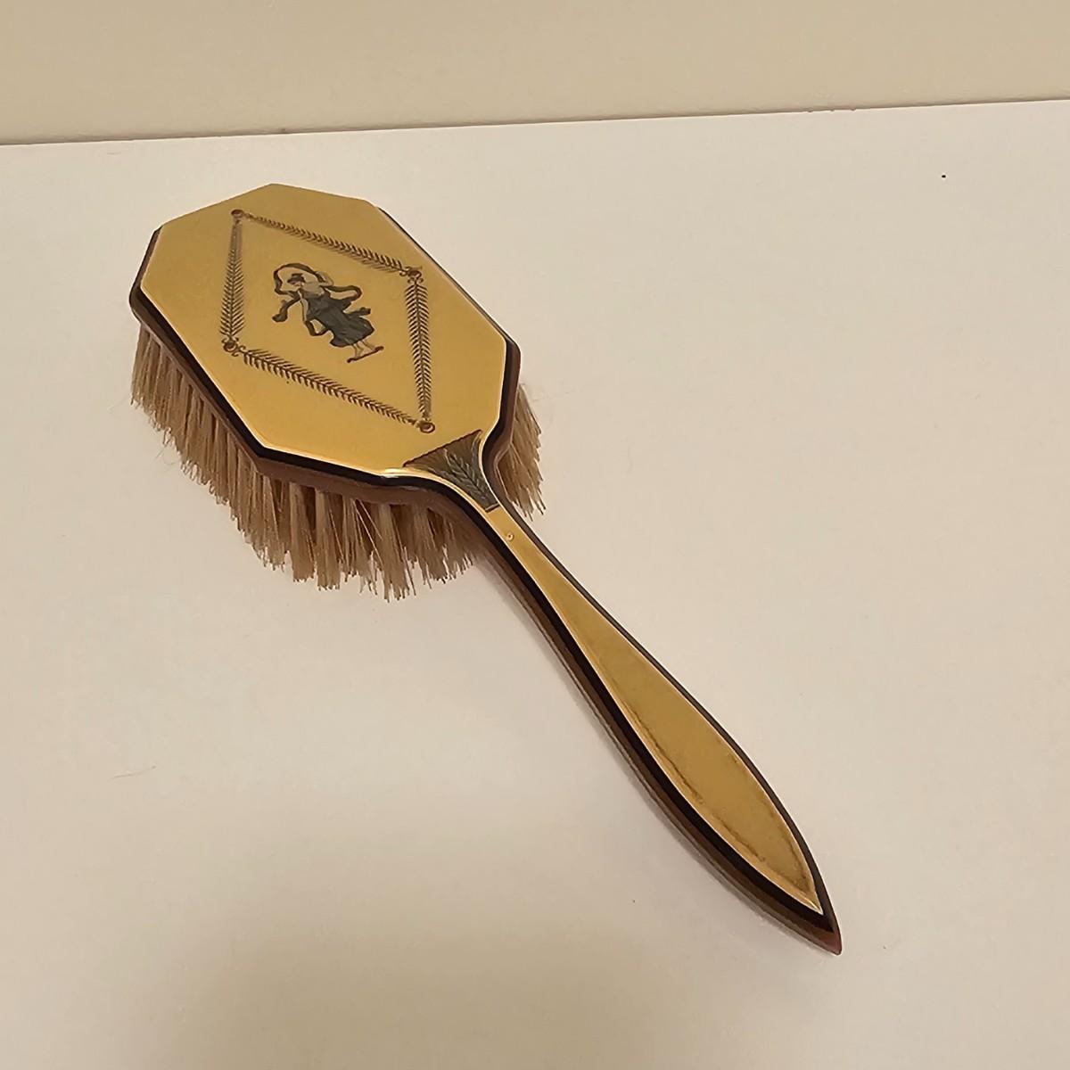 Vintage Lucite vanity set in beautiful caramel and tan colors. Part of the 'Empire' style line, this six piece set is probably from the 1930's or 1940's. Many of these were made by Dupont during that time and had the image of a Grecian goddess displayed on the backs. The set has a hand mirror, 5.5" x 15" H, a hair brush, clothes brush, nail file and cuticle tool and a button hook, 7.5" long. Hand mirror has beveled glass mirror. 'Lucite' and 'Empire' markings on most items. Clothes brush may be from another set but matches closely in color. Also included is an Art Nouveau style jewelry chest or casket, used for storing small jewelry like rings or earrings. Appears to be made of aluminum with bas relief decoration, and faux velvet lining. Measures 5" x 3" x 5"H. See photos for details. Shipping available.