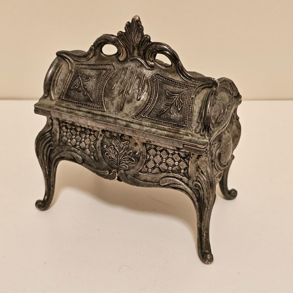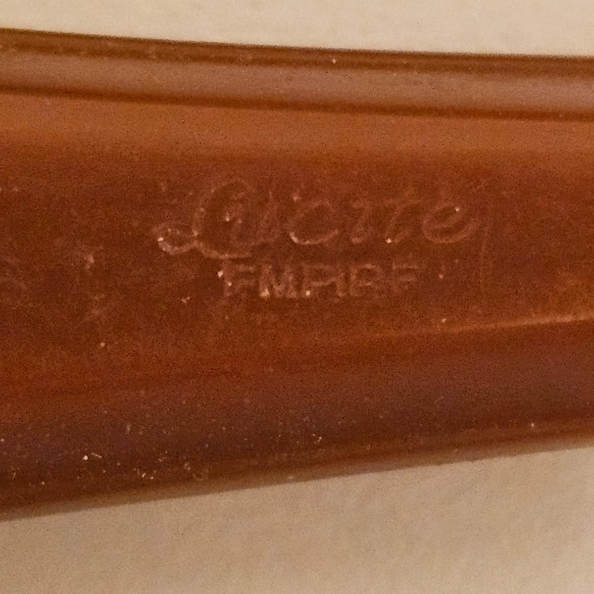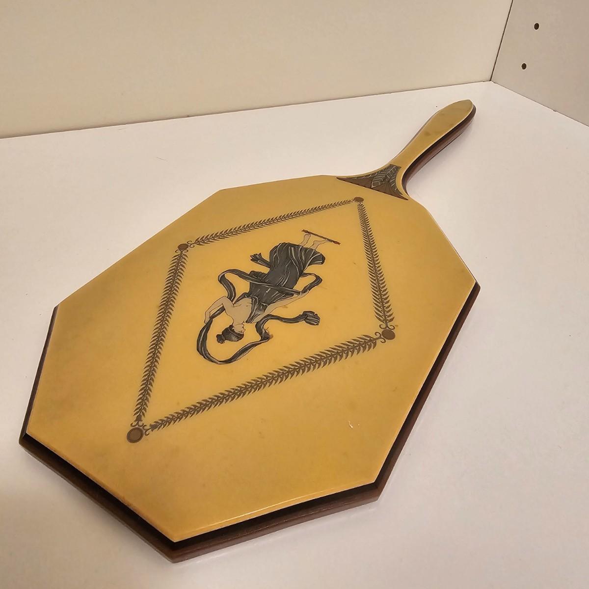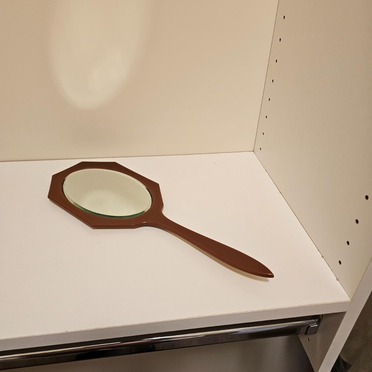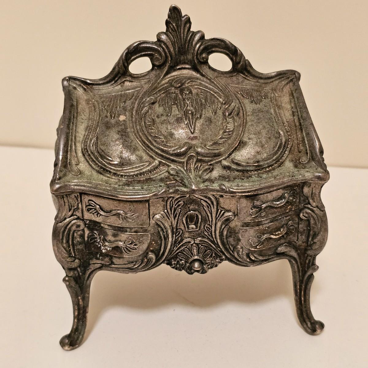 Vintage Lucite vanity set in beautiful caramel and tan colors. Part of the 'Empire' style line, this six piece set is probably from the 1930's or 1940's. Many of these were made by Dupont during that time and had the image of a Grecian goddess displayed on the backs. The set has a hand mirror, 5.5" x 15" H, a hair brush, clothes brush, nail file and cuticle tool and a button hook, 7.5" long. Hand mirror has beveled glass mirror. 'Lucite' and 'Empire' markings on most items. Clothes brush may be from another set but matches closely in color. Also included is an Art Nouveau style jewelry chest or casket, used for storing small jewelry like rings or earrings. Appears to be made of aluminum with bas relief decoration, and faux velvet lining. Measures 5" x 3" x 5"H. See photos for details. Shipping available.
