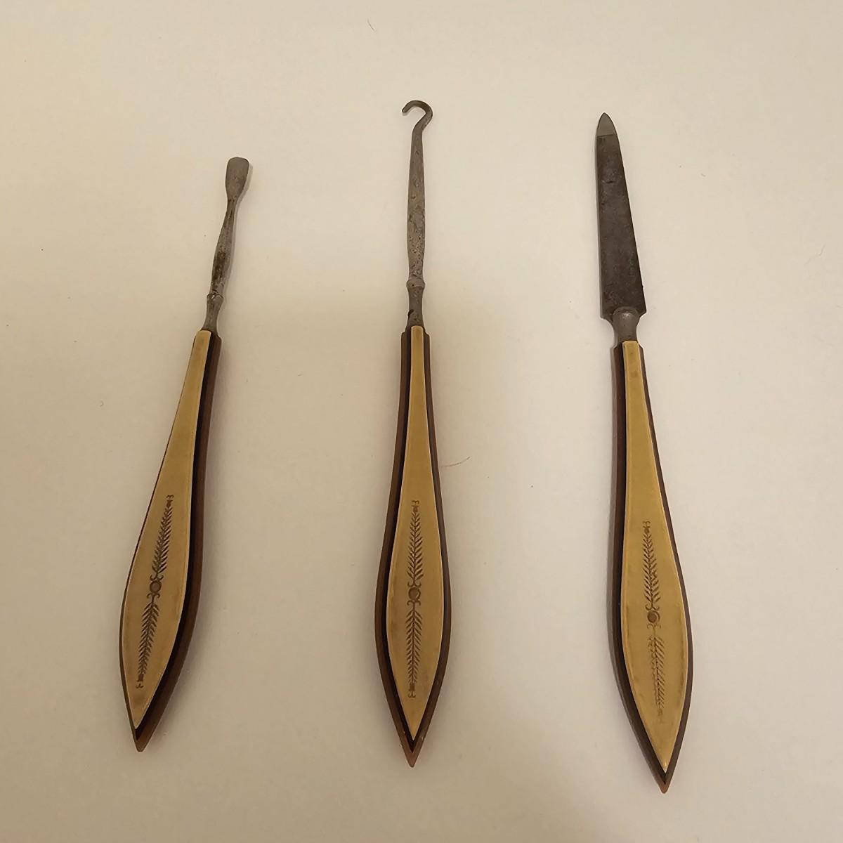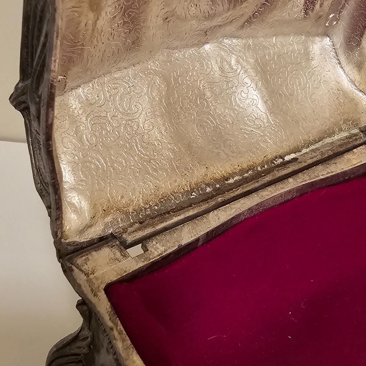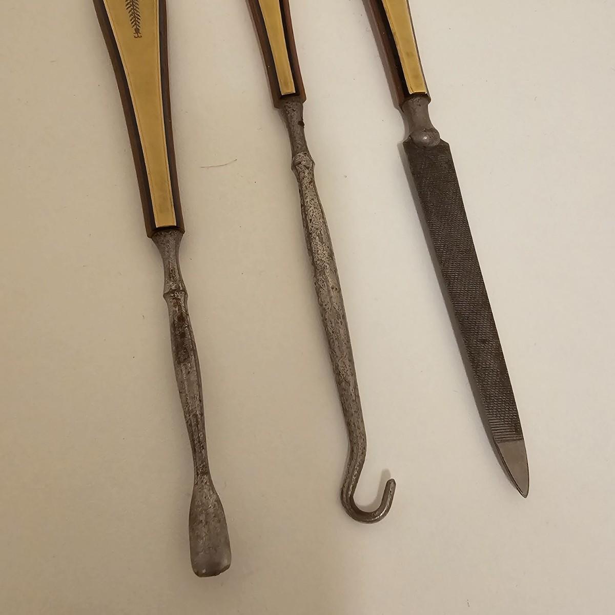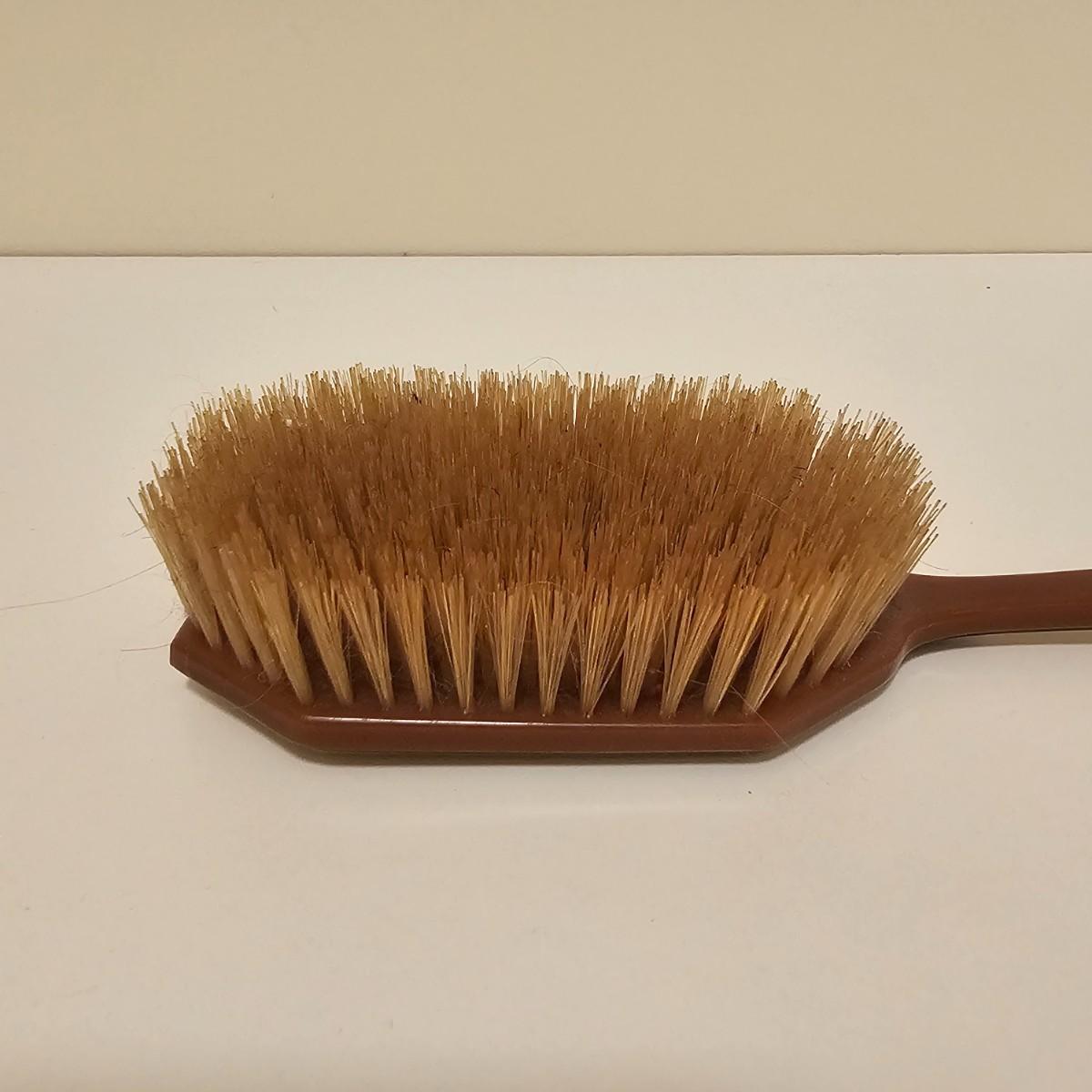 Vintage Lucite vanity set in beautiful caramel and tan colors. Part of the 'Empire' style line, this six piece set is probably from the 1930's or 1940's. Many of these were made by Dupont during that time and had the image of a Grecian goddess displayed on the backs. The set has a hand mirror, 5.5" x 15" H, a hair brush, clothes brush, nail file and cuticle tool and a button hook, 7.5" long. Hand mirror has beveled glass mirror. 'Lucite' and 'Empire' markings on most items. Clothes brush may be from another set but matches closely in color. Also included is an Art Nouveau style jewelry chest or casket, used for storing small jewelry like rings or earrings. Appears to be made of aluminum with bas relief decoration, and faux velvet lining. Measures 5" x 3" x 5"H. See photos for details. Shipping available.