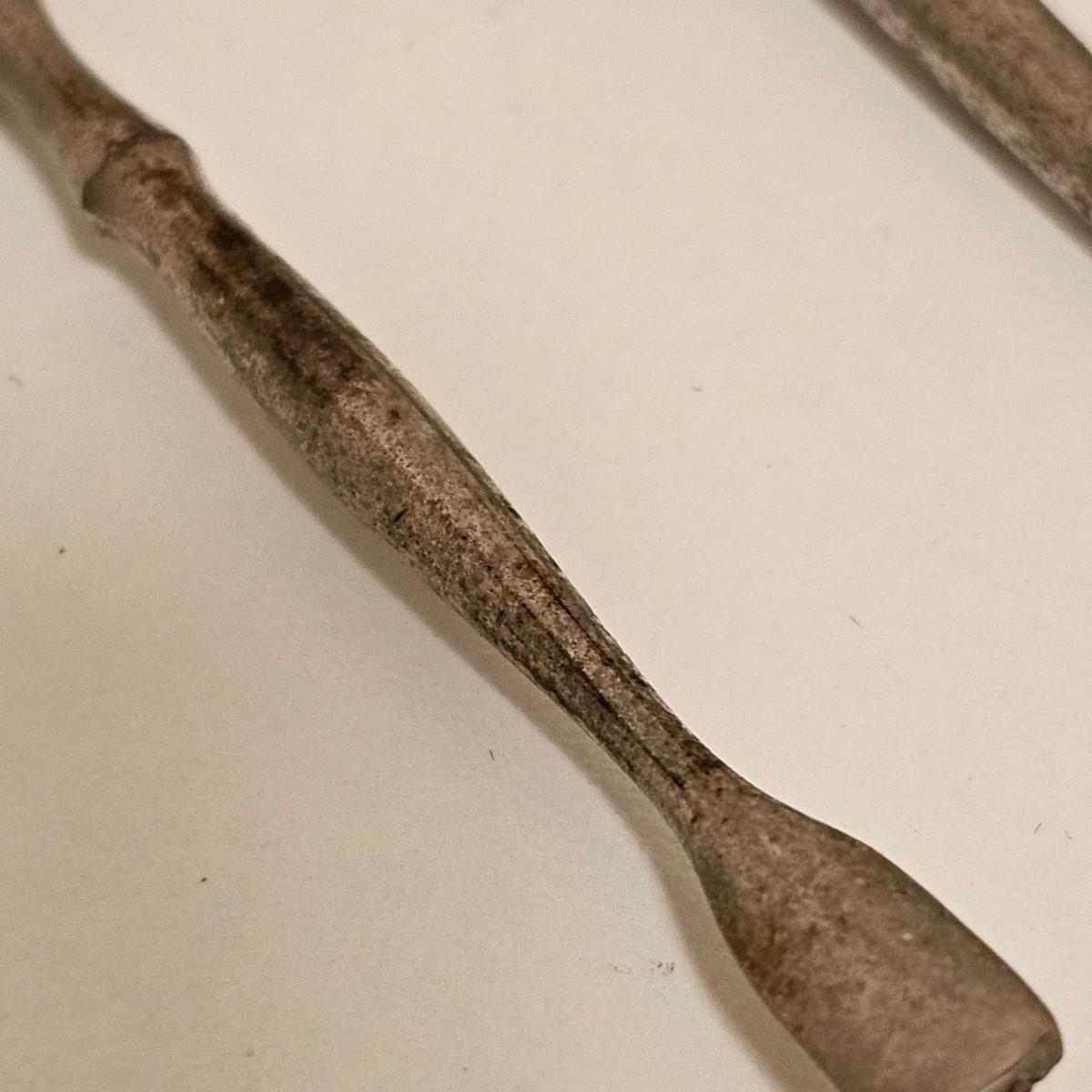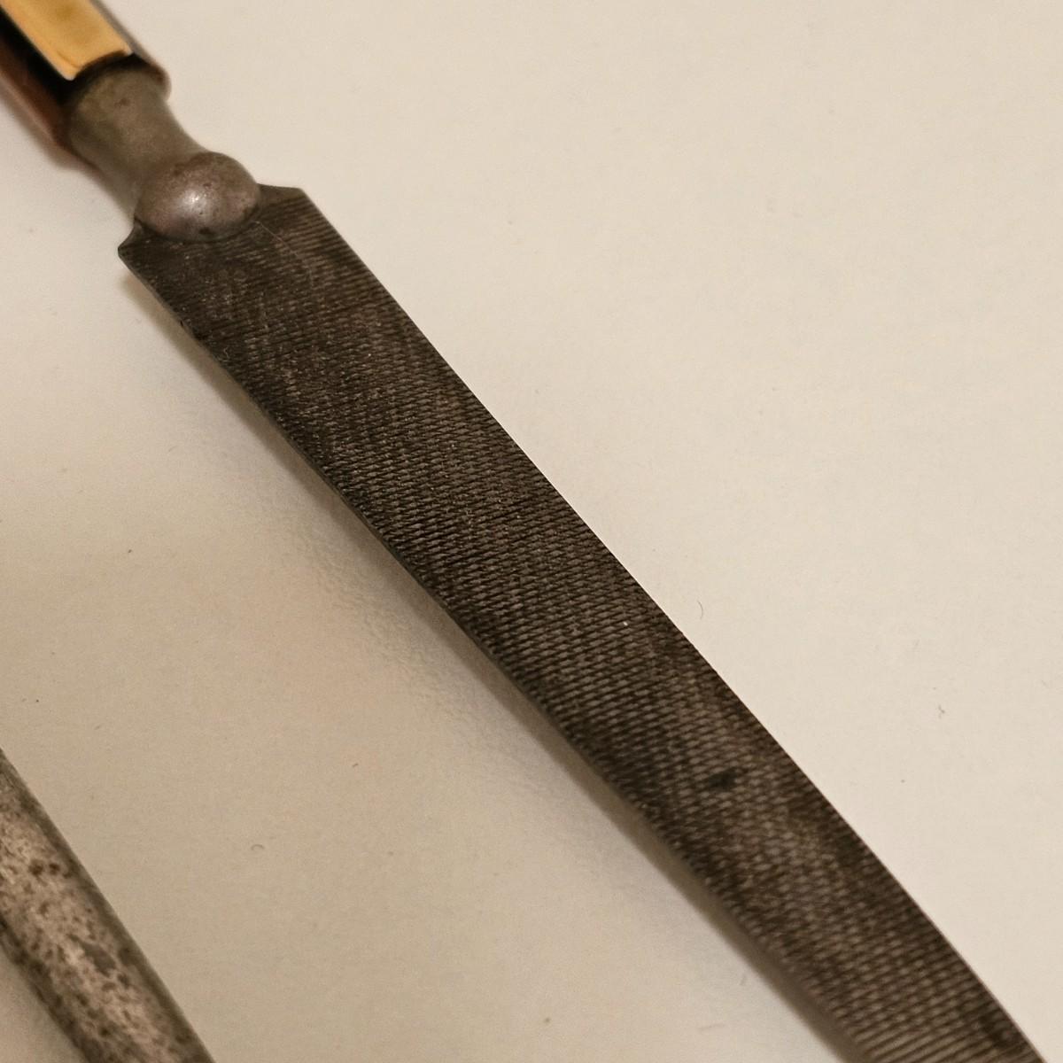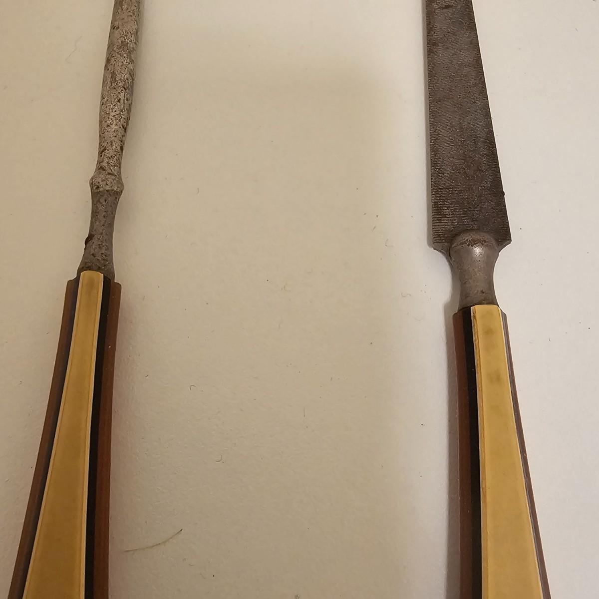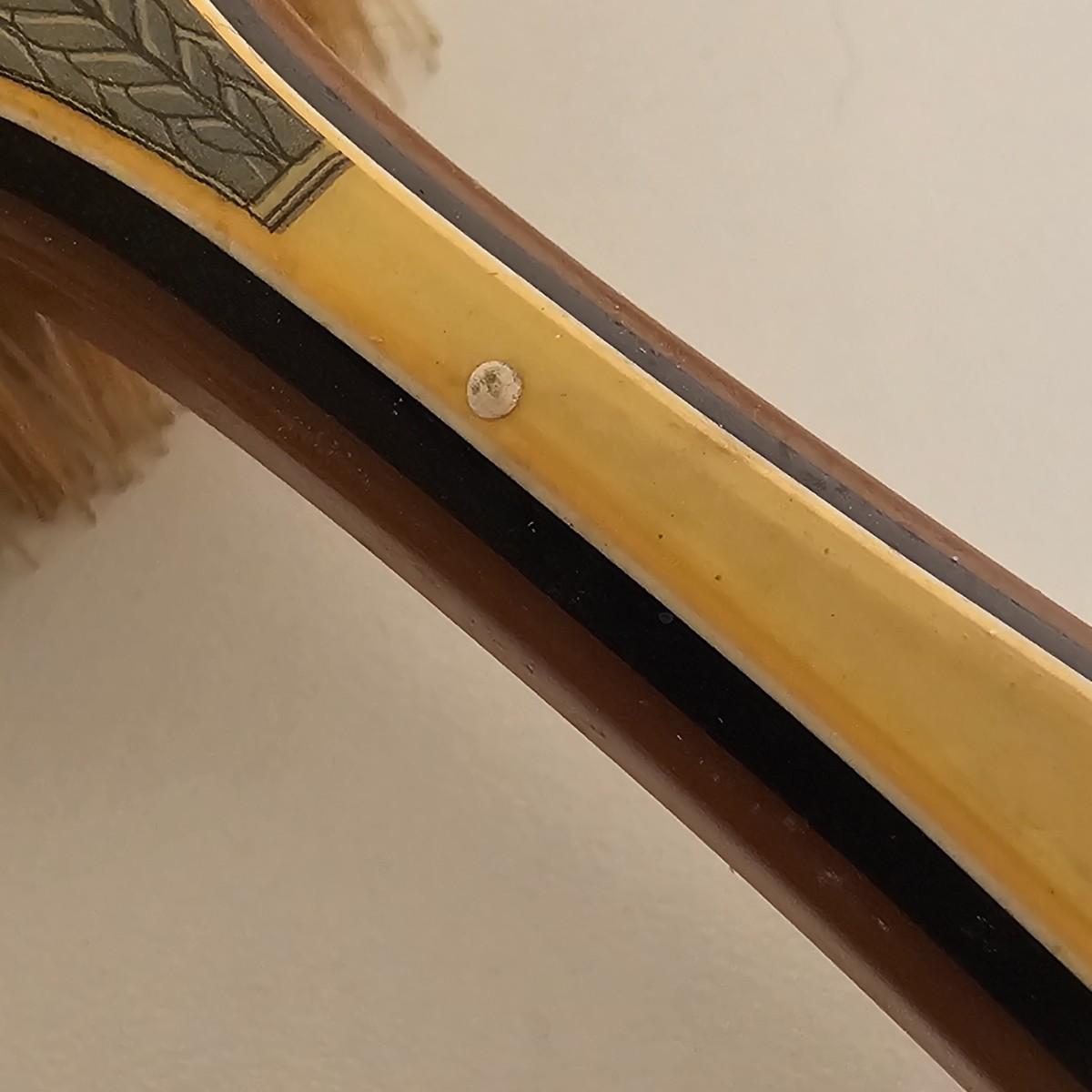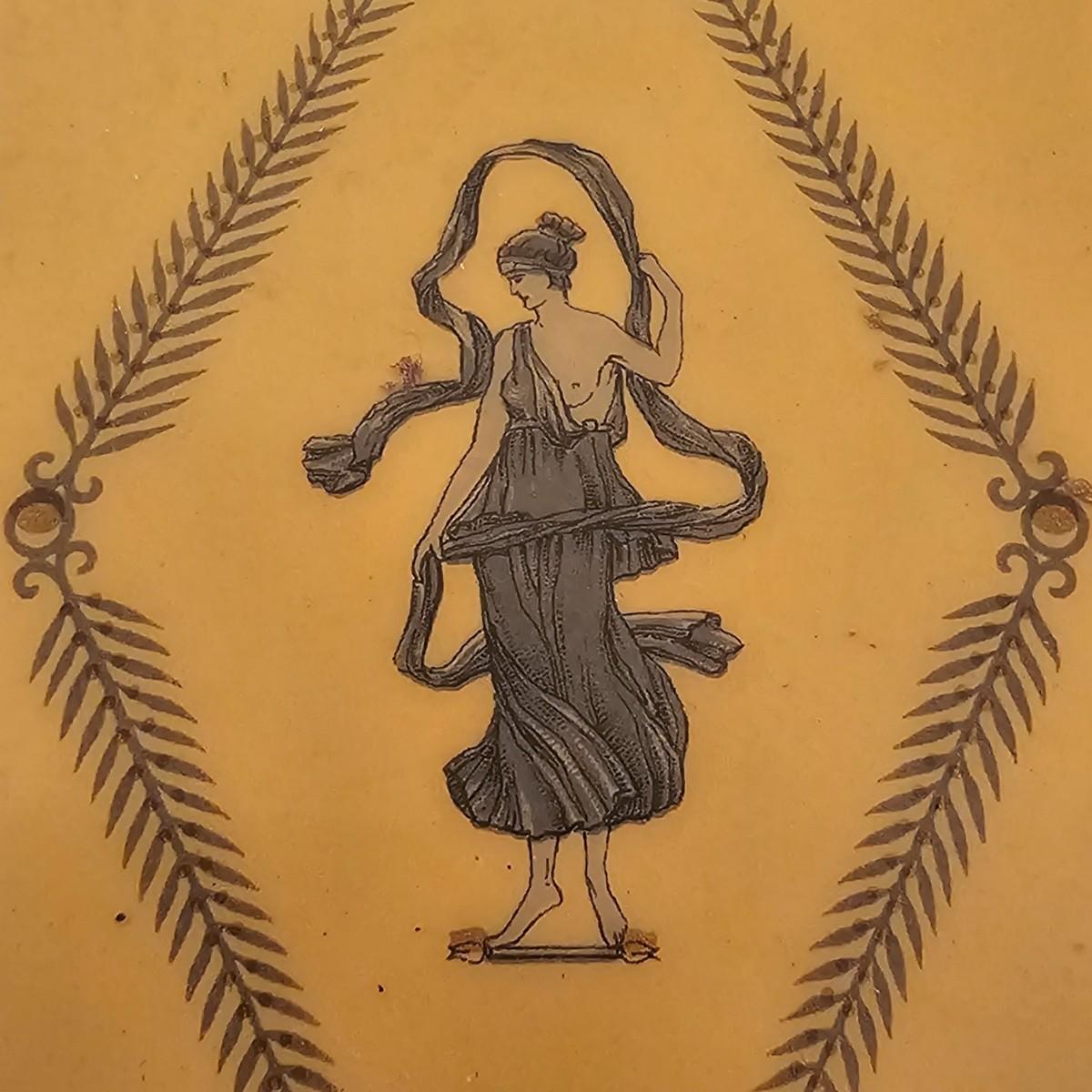 Vintage Lucite vanity set in beautiful caramel and tan colors. Part of the 'Empire' style line, this six piece set is probably from the 1930's or 1940's. Many of these were made by Dupont during that time and had the image of a Grecian goddess displayed on the backs. The set has a hand mirror, 5.5" x 15" H, a hair brush, clothes brush, nail file and cuticle tool and a button hook, 7.5" long. Hand mirror has beveled glass mirror. 'Lucite' and 'Empire' markings on most items. Clothes brush may be from another set but matches closely in color. Also included is an Art Nouveau style jewelry chest or casket, used for storing small jewelry like rings or earrings. Appears to be made of aluminum with bas relief decoration, and faux velvet lining. Measures 5" x 3" x 5"H. See photos for details. Shipping available.