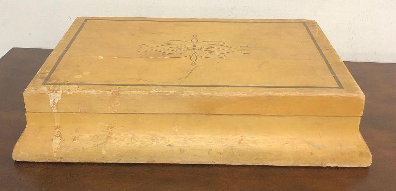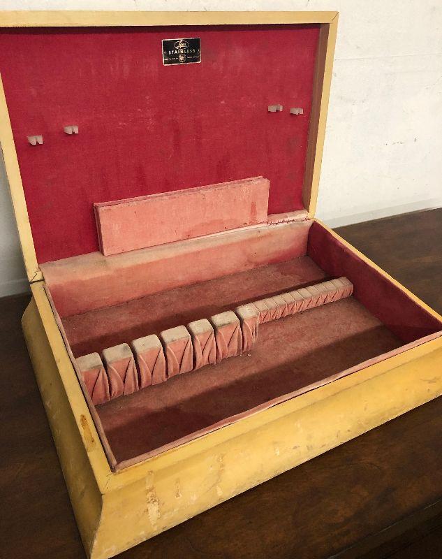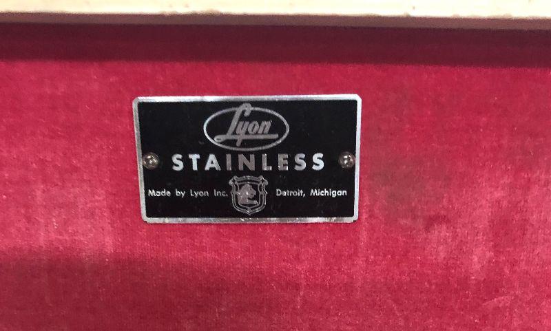 Here is a vintage stainless flatware chest from Lyon...Some exterior finish wear and interior fading..19 x 13 x 4"....as shown...