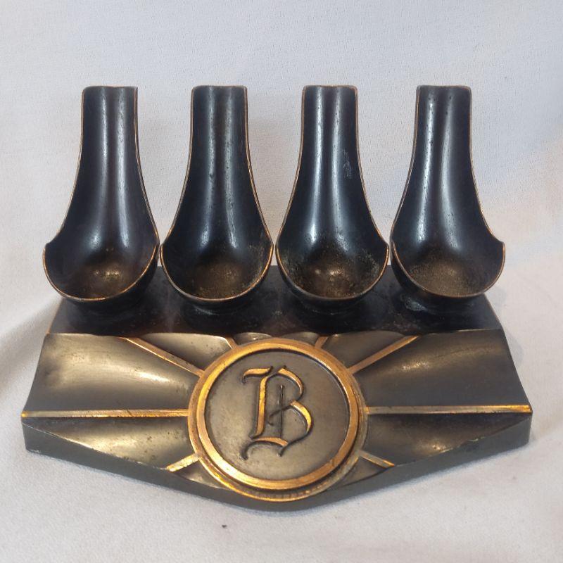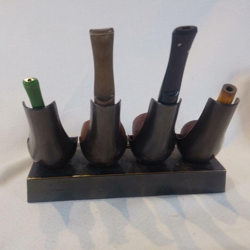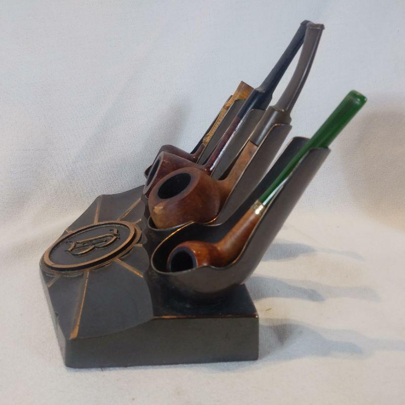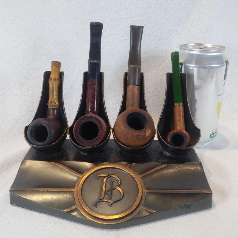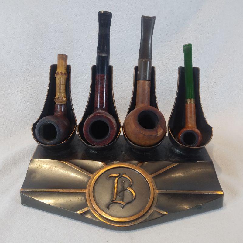 This is an excellent heavy metal 4 pipe display with copper accents. Large "B" monogram. This offering includes the 4 pipes shown - all heads are Briar Wood and have been enjoyed by the previous owner. The stand measures 7 1/2-inches wide X 5-inches deep X 3 3/4-inches tall. This will be a fun addition for a serious (or novice) pipe collector. Reserve/Starting Bid is $15.