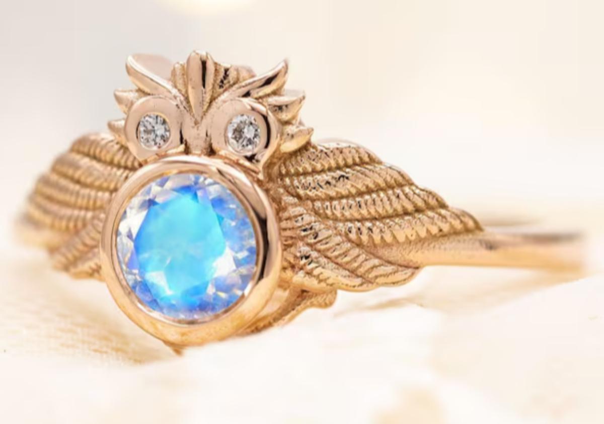 Art Deco Moonstone Engagement Ring Owl Style Wedding Ring