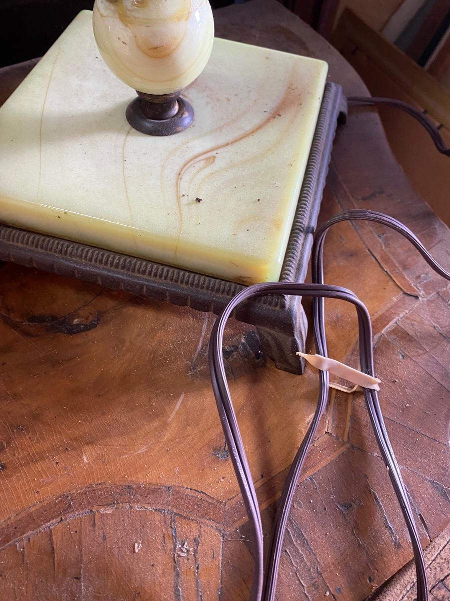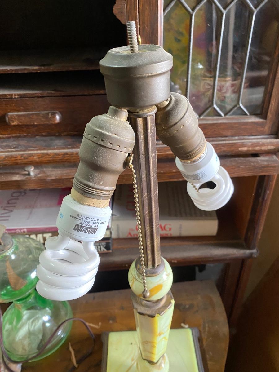 Art Deco Old Footed Houze Green Slag Glass Table Lamp Base, dual sockets, Ornate cast Iron base, stem and brass sockets. Lovely addition to any room. Comes with shade not original to lamp and finial. 21: high with 7" square base.