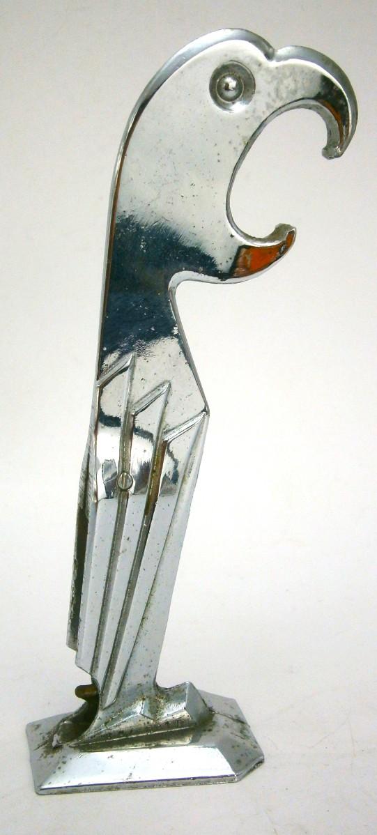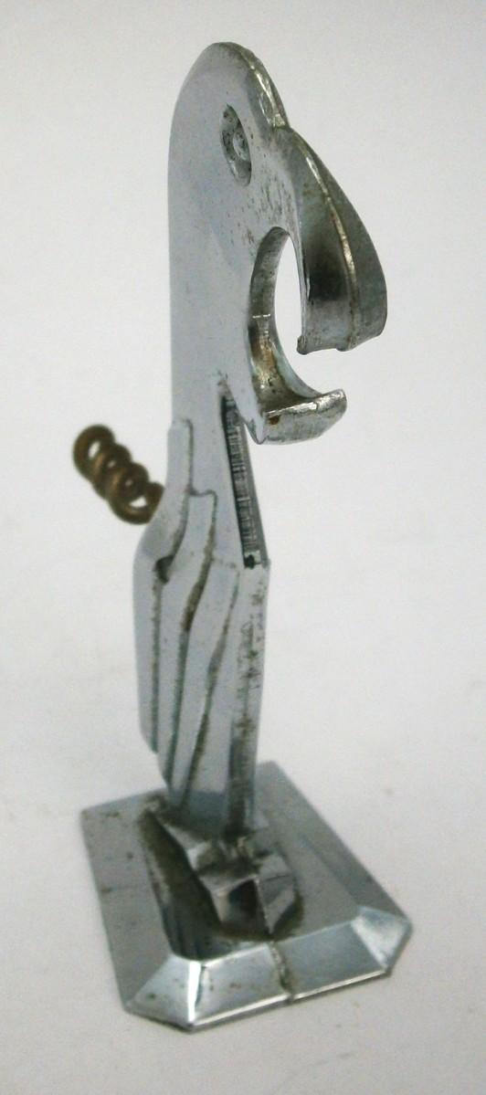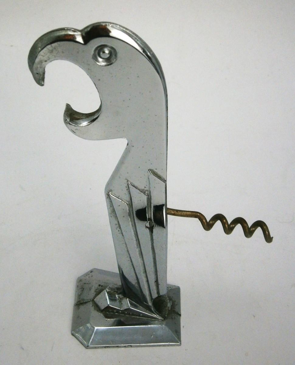 Art Deco Parrot Bottle Opener and Corkscrew, vintage, by NEGBAUR, 5 1/8 in. tall, chrome plated metal with steel screw.