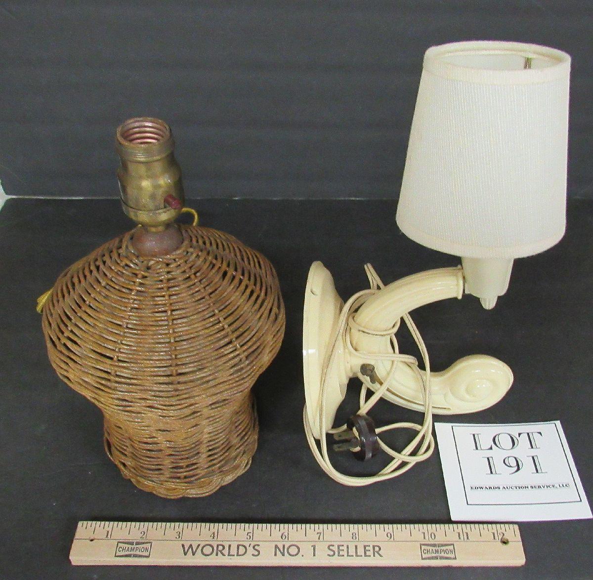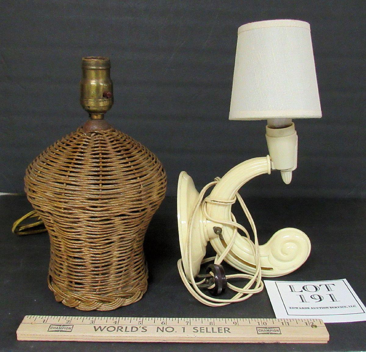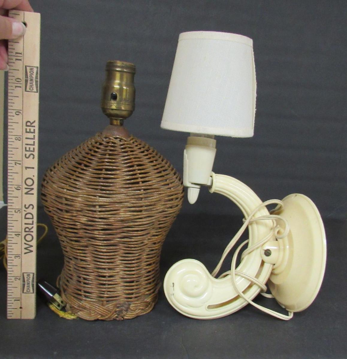Wicker lamp needs rewiring but is nice looking and would be great when working. Art Deco lamp works fine, needs cleaning. It is adjustable and is a great little night light for by the bed. Shade not original.