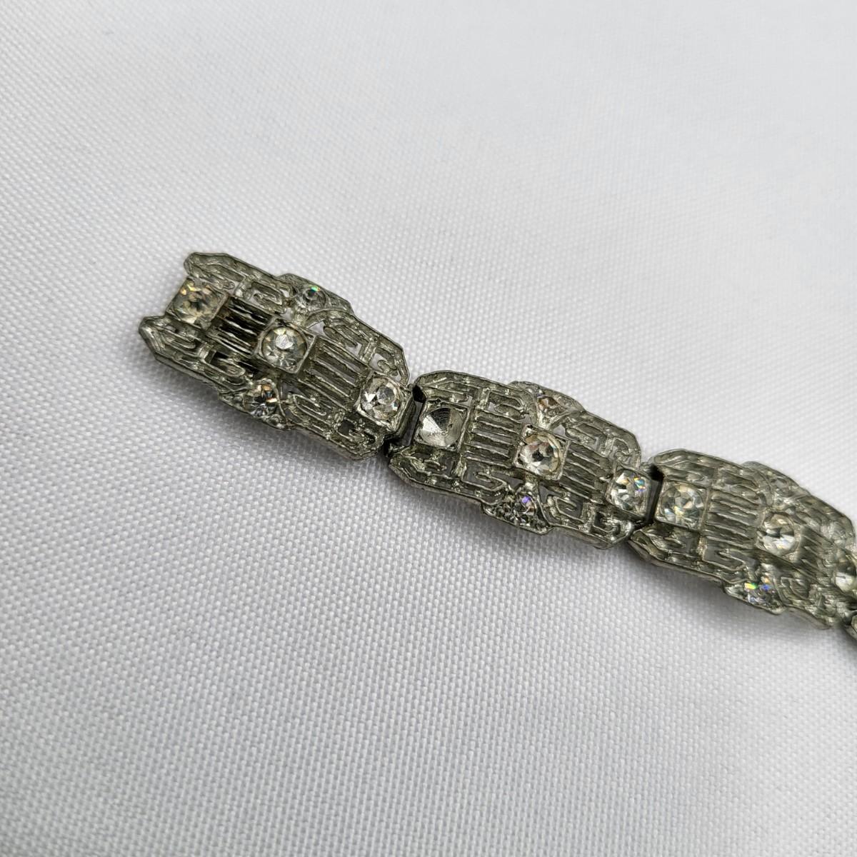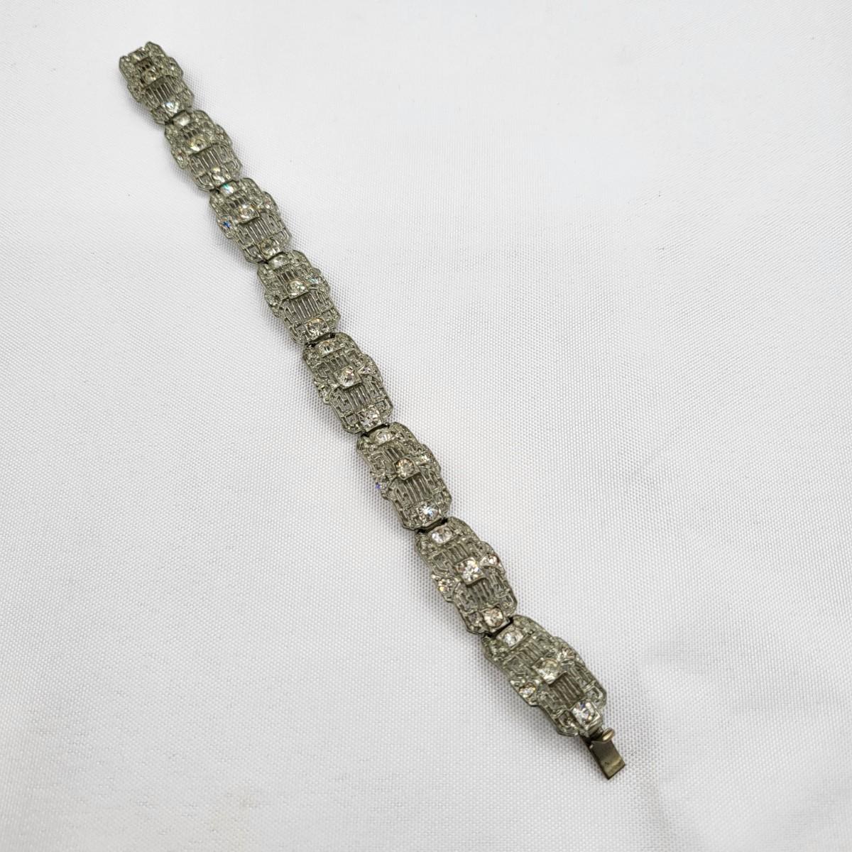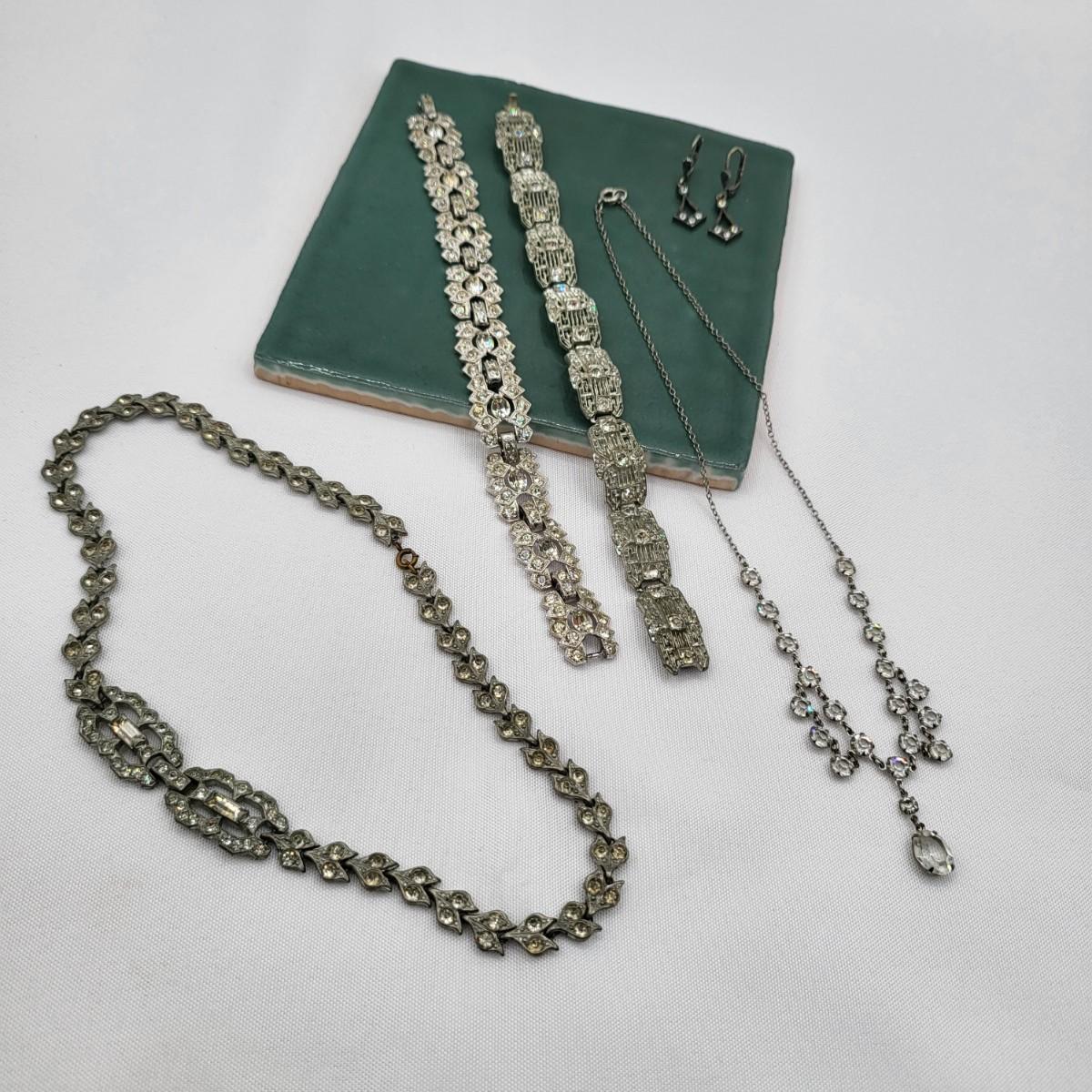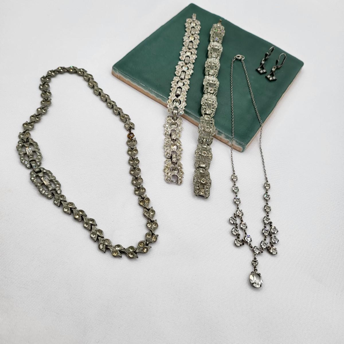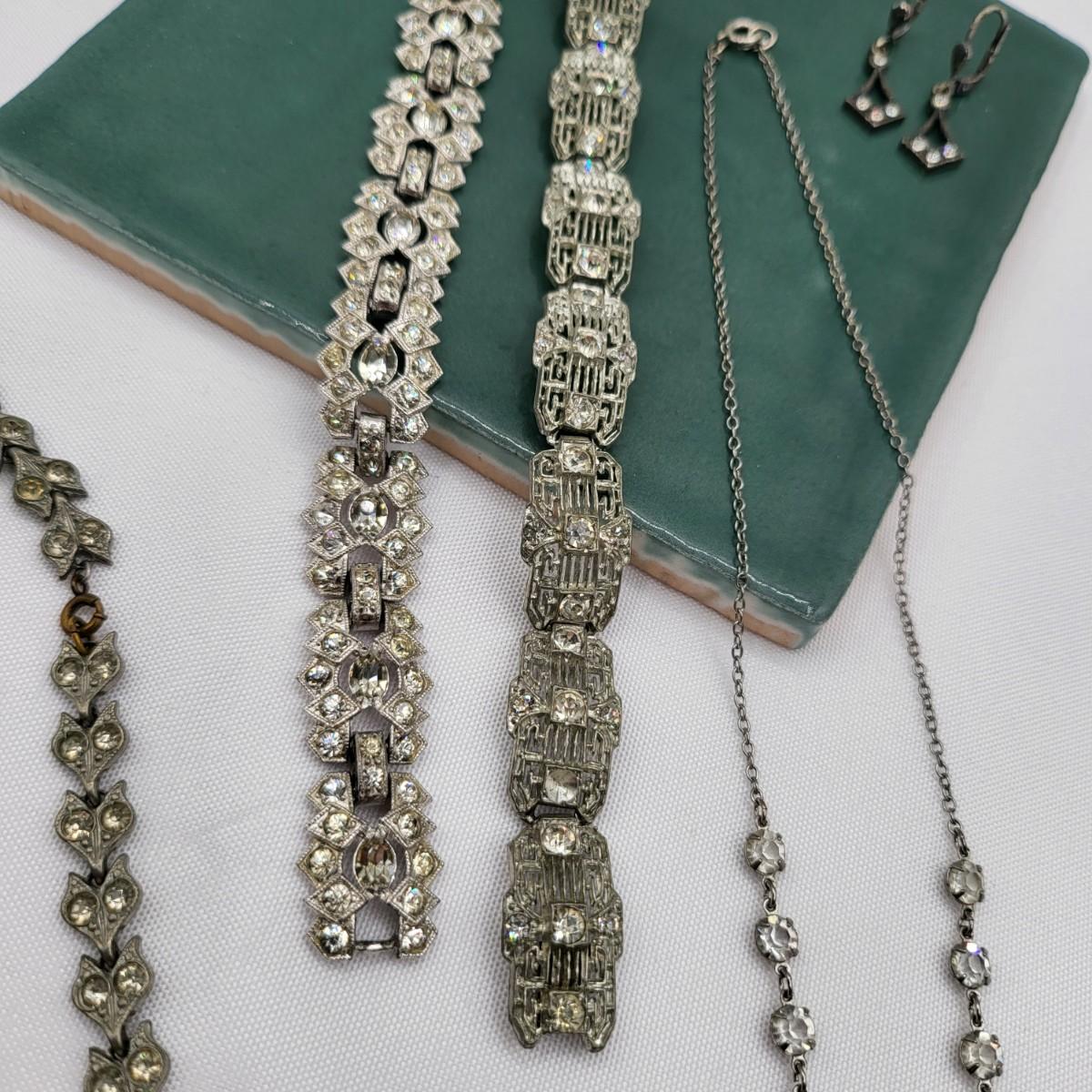 Two pot-metal style panel link bracelets 7" long (only one stone missing on one bracelet). One has fold over clasp, one has a push clasp. Antique deco pot metal tulip link necklace, brass clasp, 16" long. Open-back sparkly clear stones necklace, 14.5" long. Geometric deco pierced earrings, clear stones, 1" long.