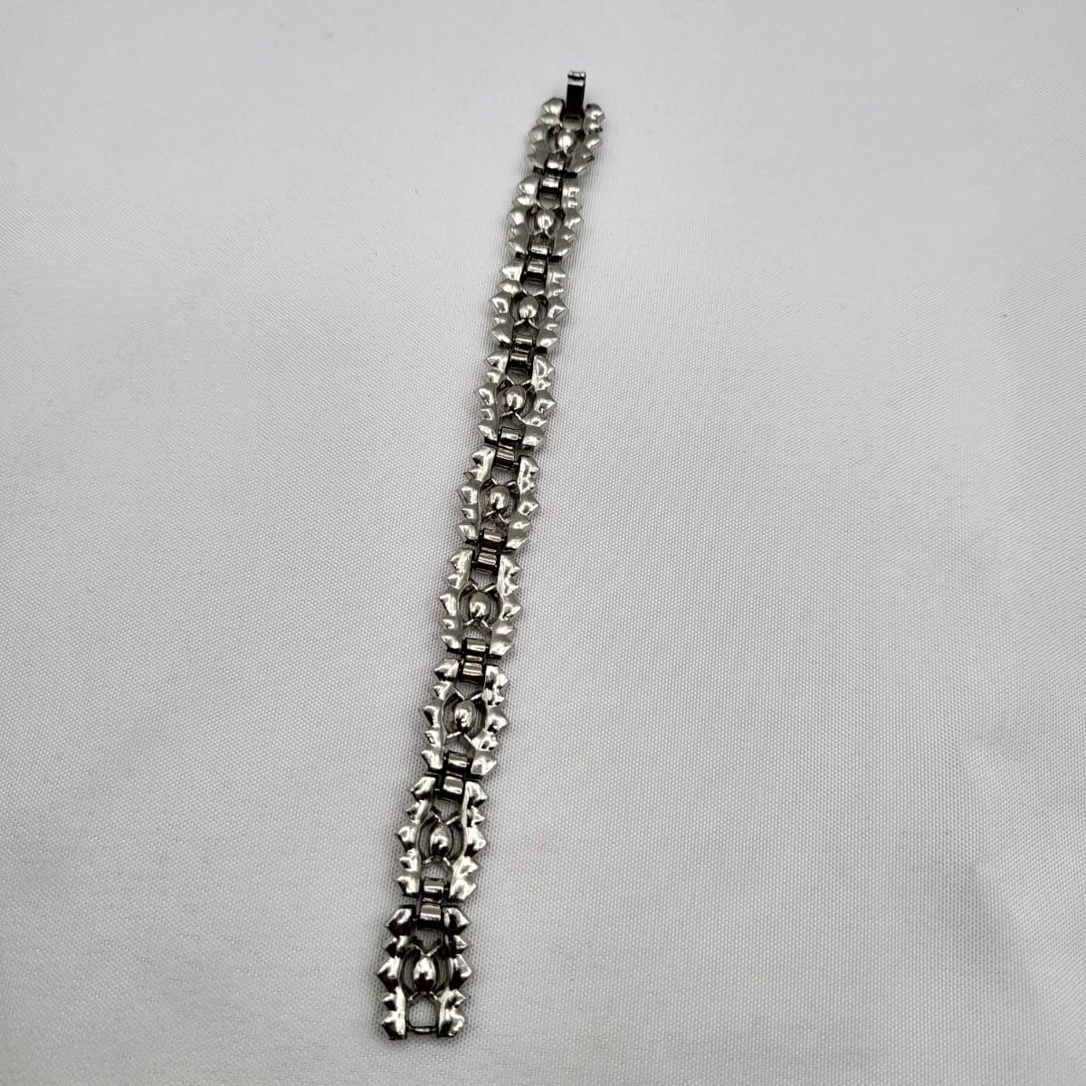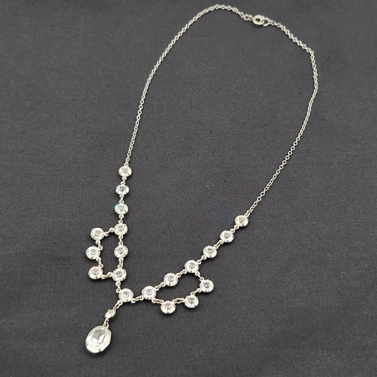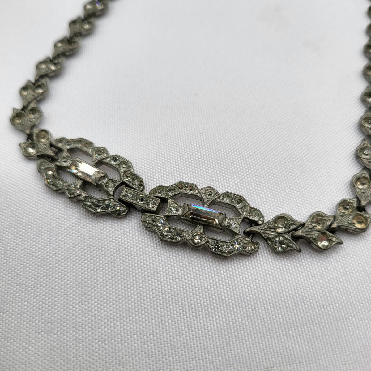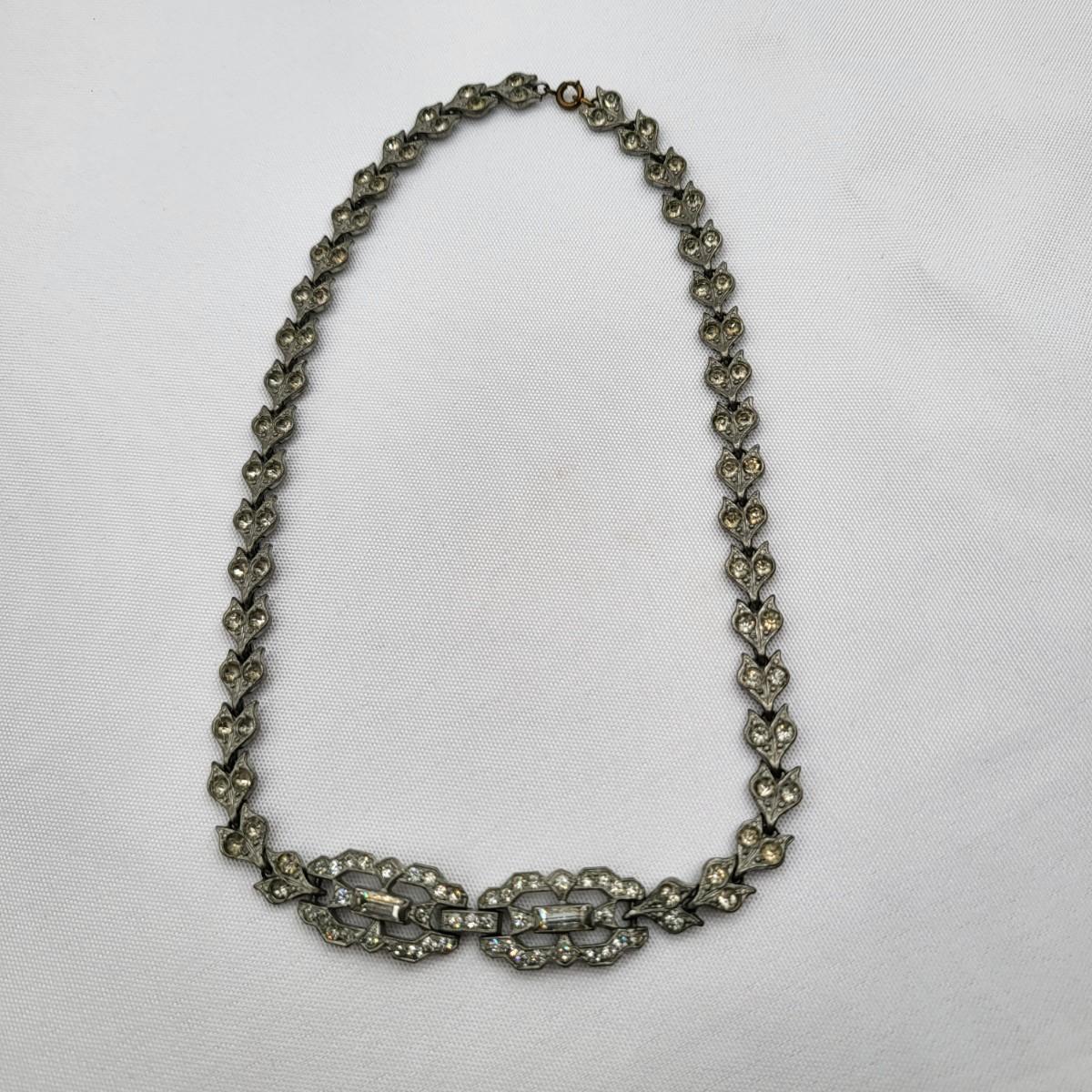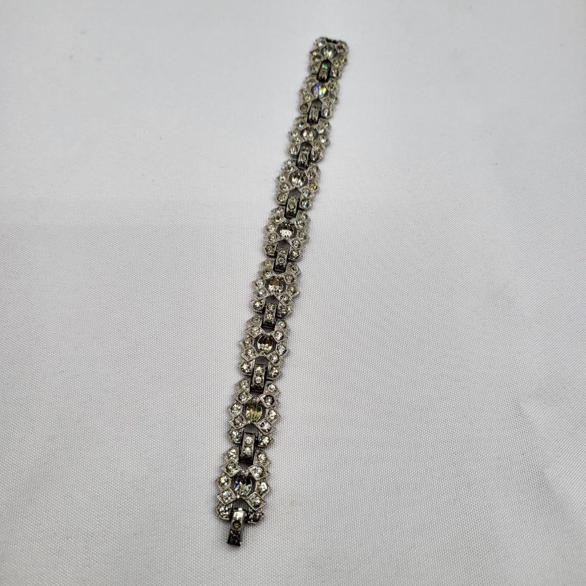 Two pot-metal style panel link bracelets 7" long (only one stone missing on one bracelet). One has fold over clasp, one has a push clasp. Antique deco pot metal tulip link necklace, brass clasp, 16" long. Open-back sparkly clear stones necklace, 14.5" long. Geometric deco pierced earrings, clear stones, 1" long.