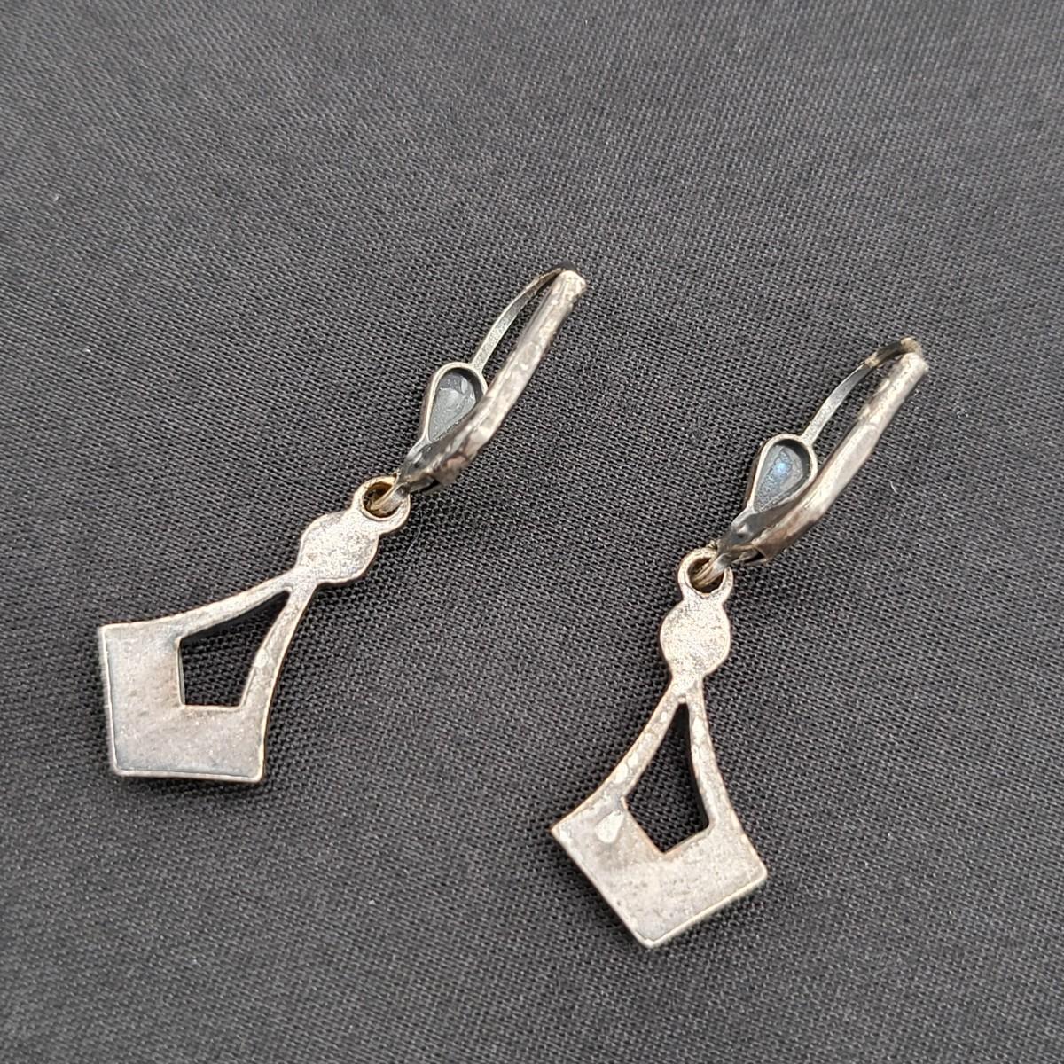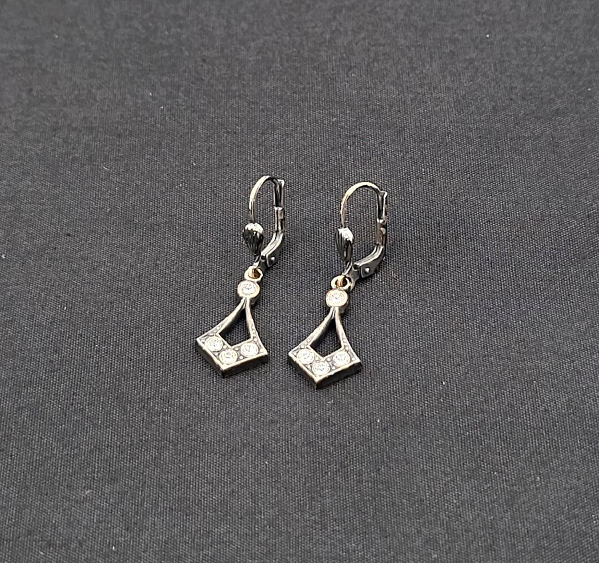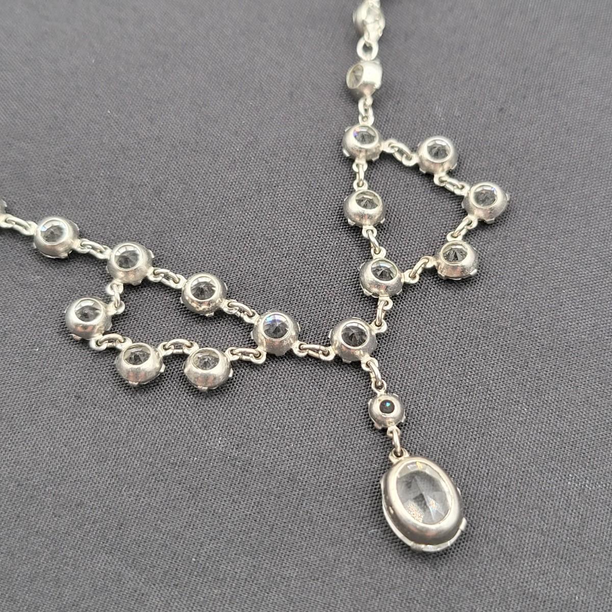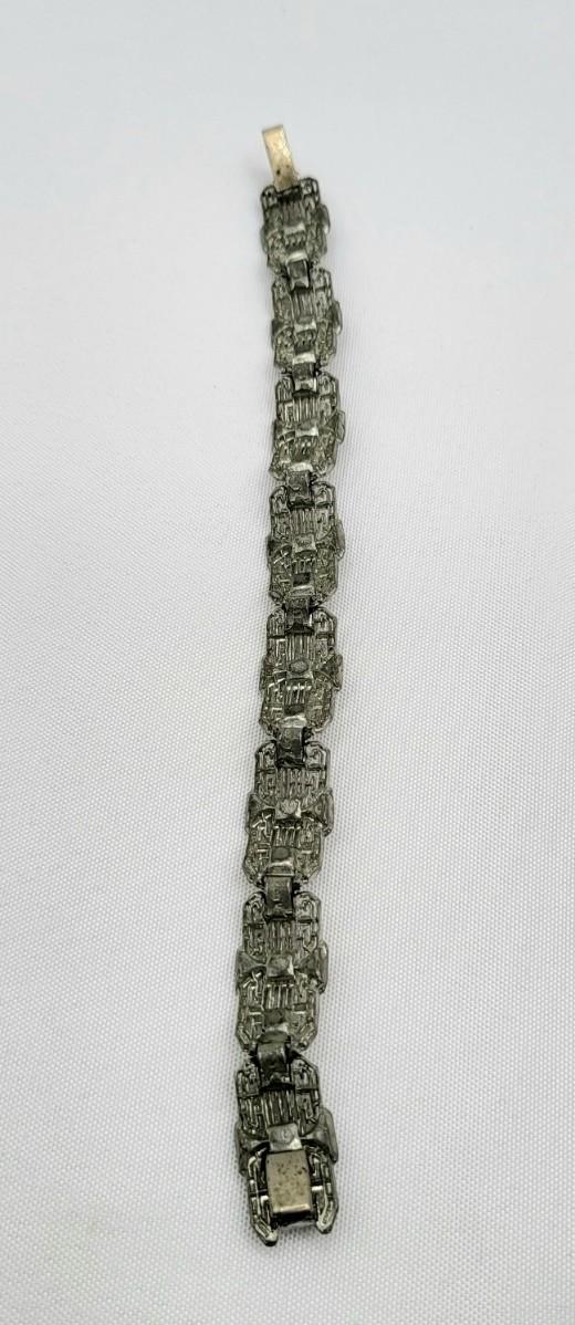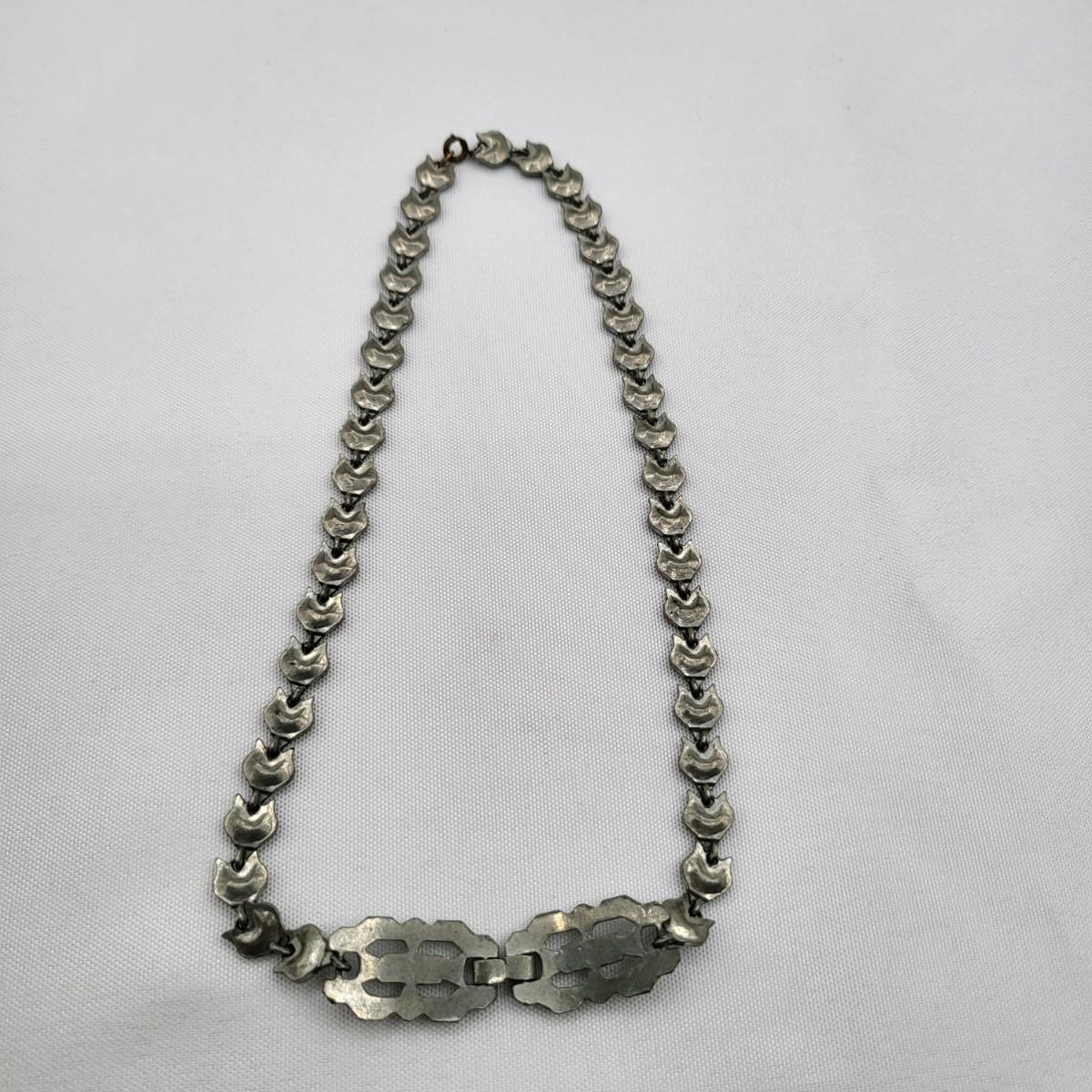 Two pot-metal style panel link bracelets 7" long (only one stone missing on one bracelet). One has fold over clasp, one has a push clasp. Antique deco pot metal tulip link necklace, brass clasp, 16" long. Open-back sparkly clear stones necklace, 14.5" long. Geometric deco pierced earrings, clear stones, 1" long.