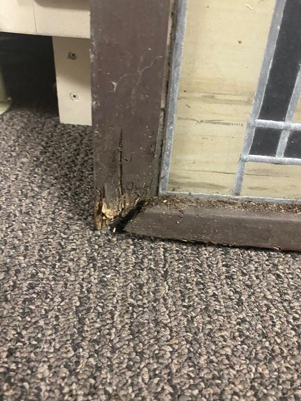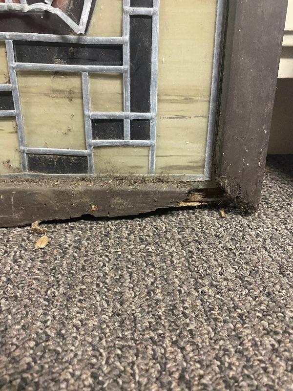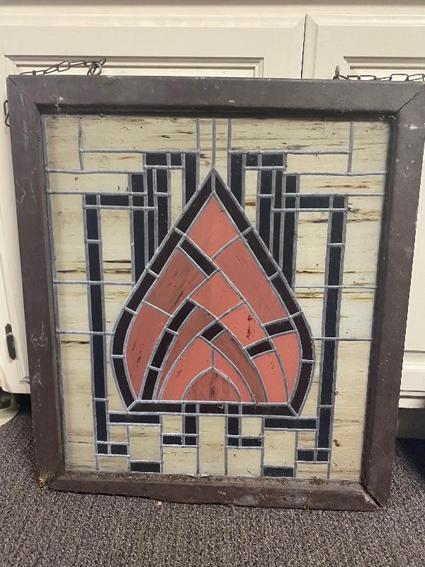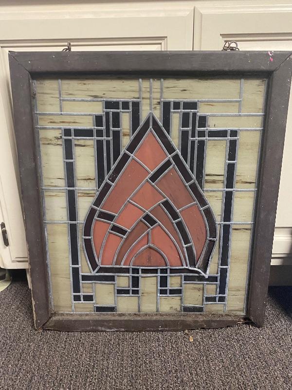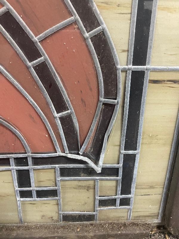 Art Deco stained glass. Needs a little work, It is in a wood frame but the frame is a little rotted and really needs to be replaced. The metal on one side of the glass is also coming up. The other side looks good. Measures roughly 21x25 at the outside of frame.