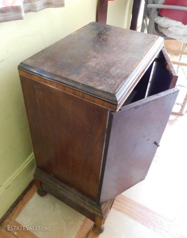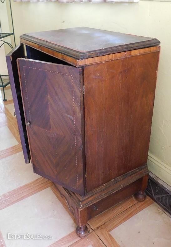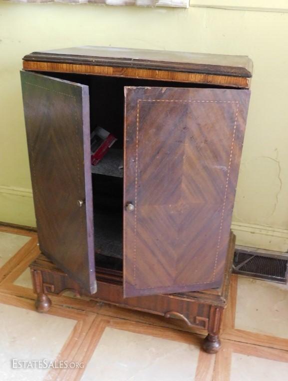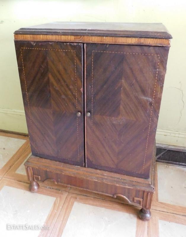 Art Deco stereo cabinet converted to display piece. Some wear and laminate issues. Needs cleaning. Contents not included.