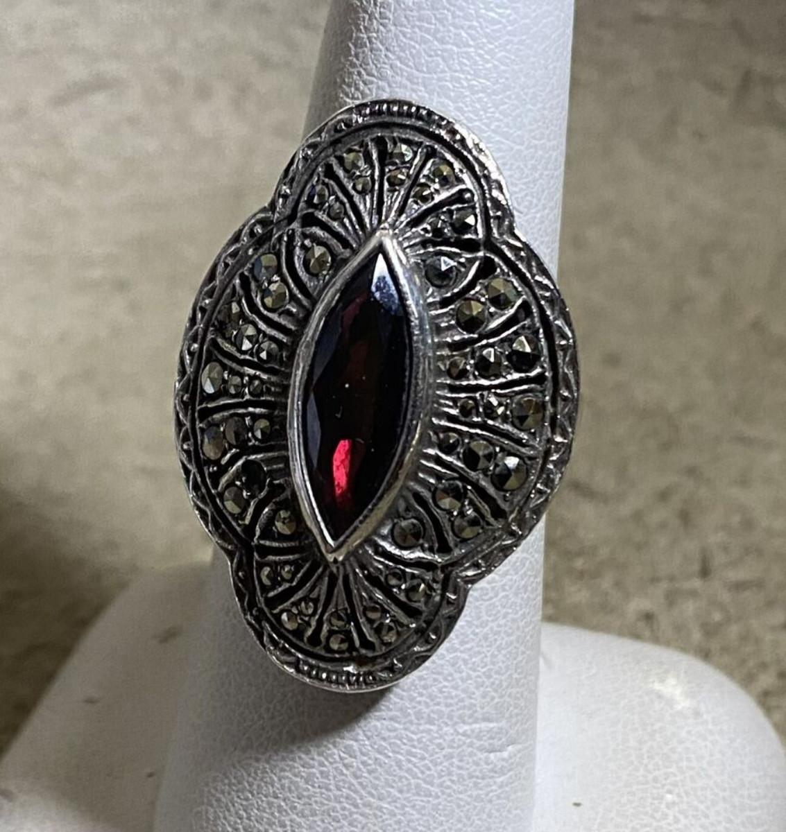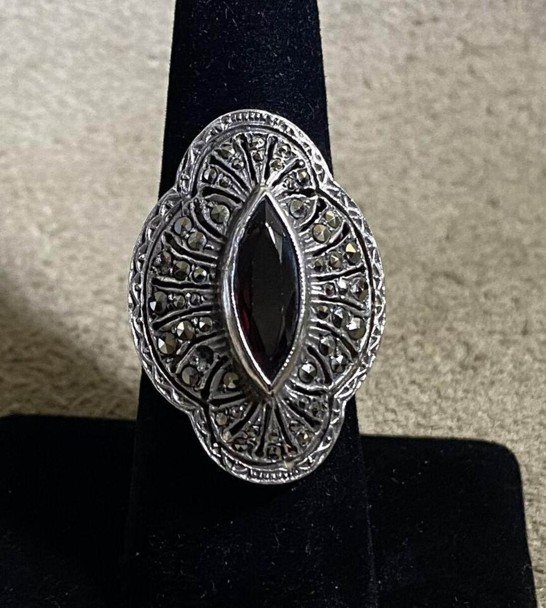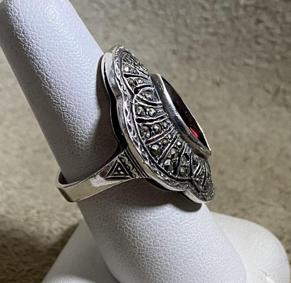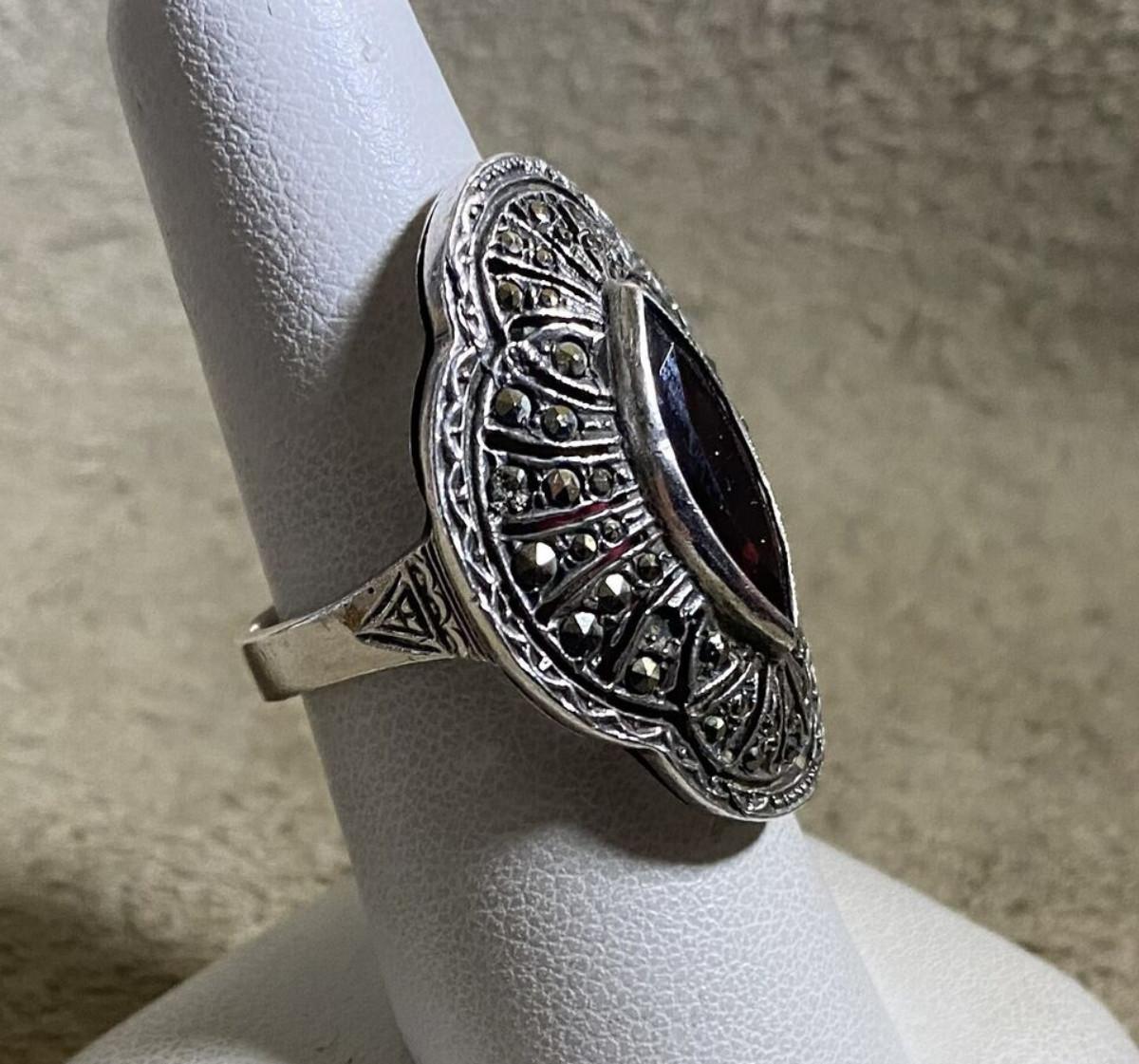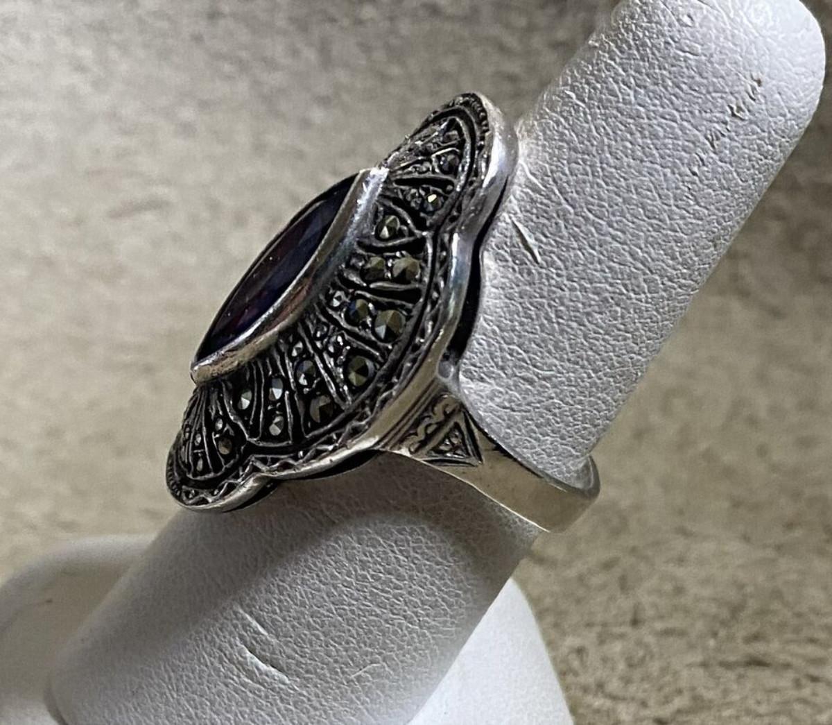 Art Deco style Amethyst Marquise & Marcasite Sterling Silver Ring Size 7.5