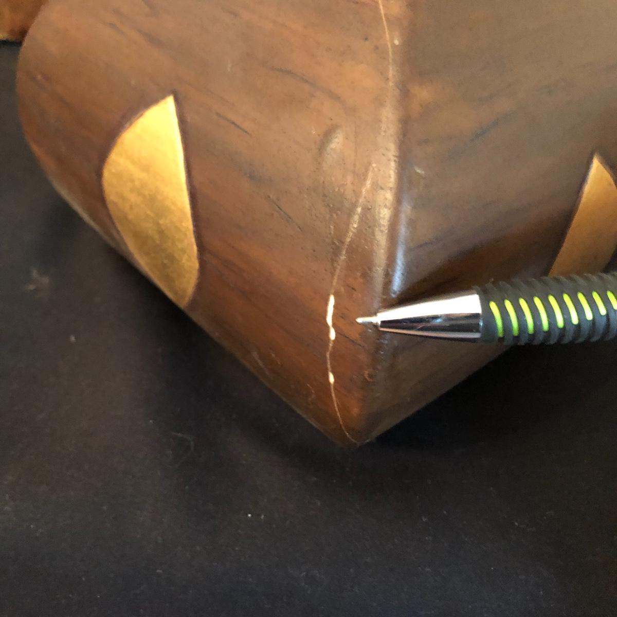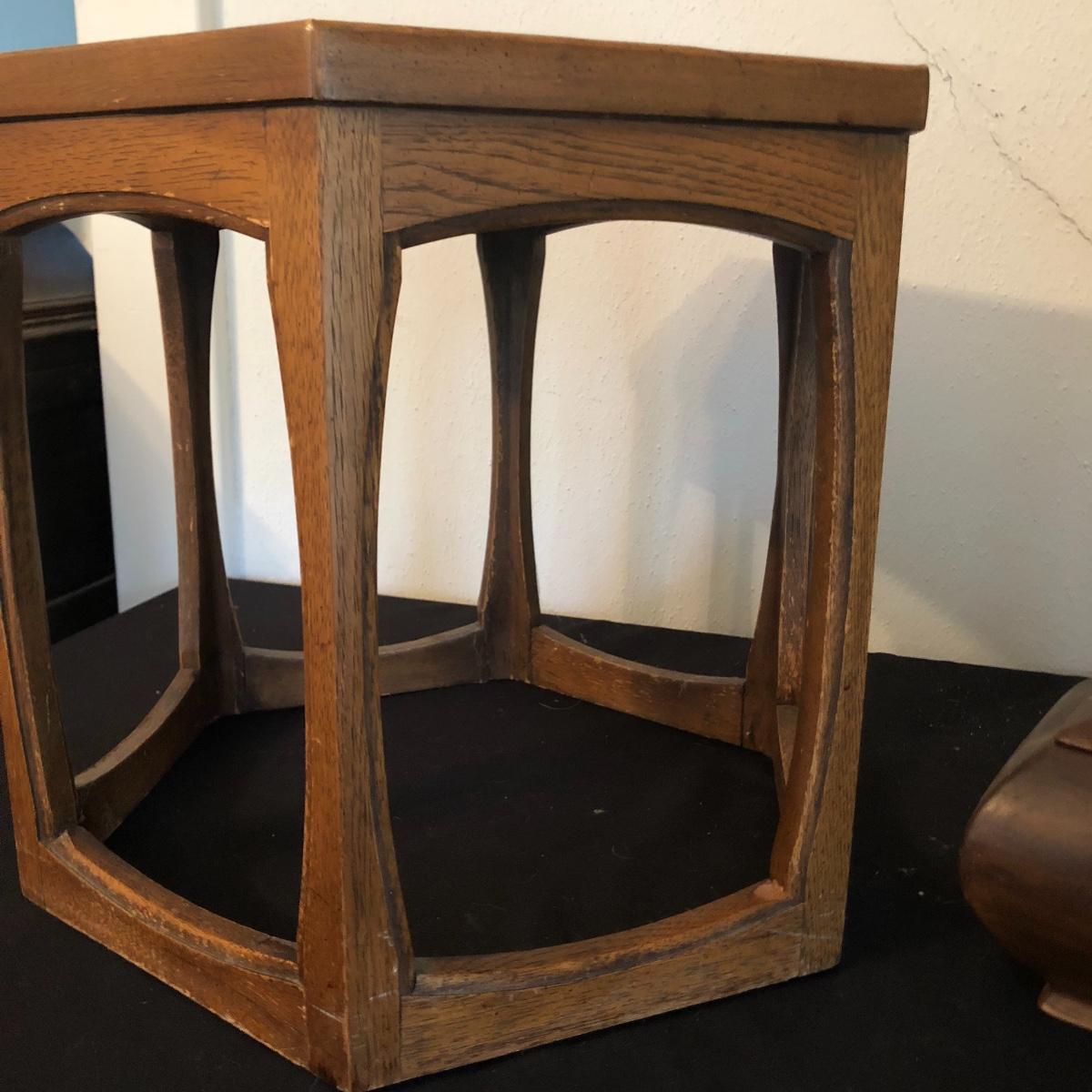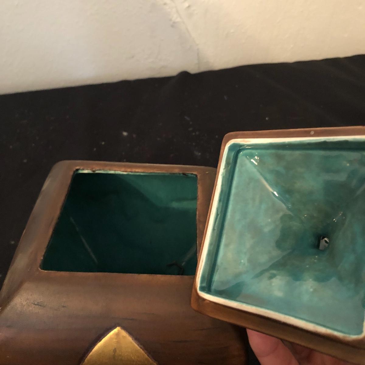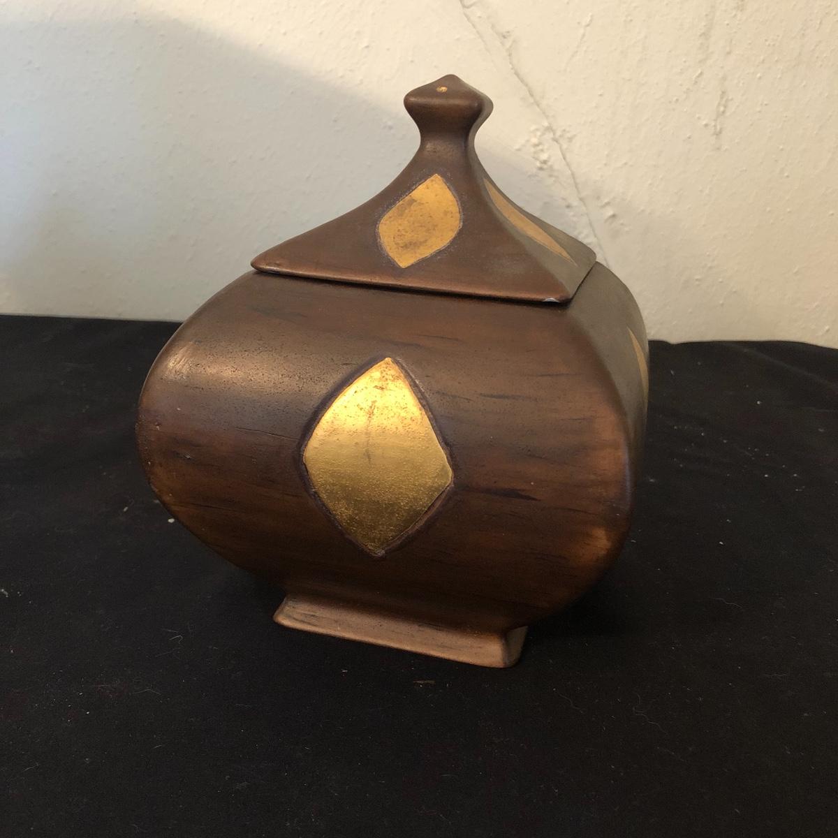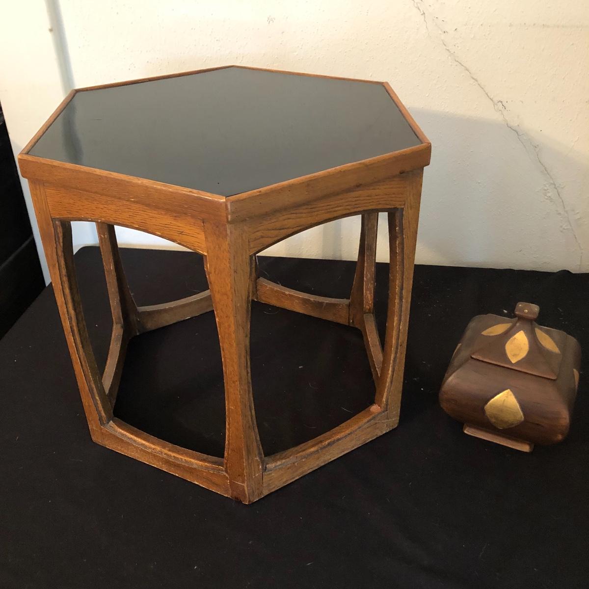 This small table/ stand is solid wood with a black veneered surface. It has some minor blemishes as does the ceramic lidded urn; this beautiful piece has been glazed to look like wood with a turquoise glazed interior. See images for blemishes.