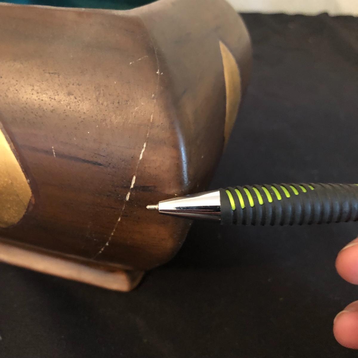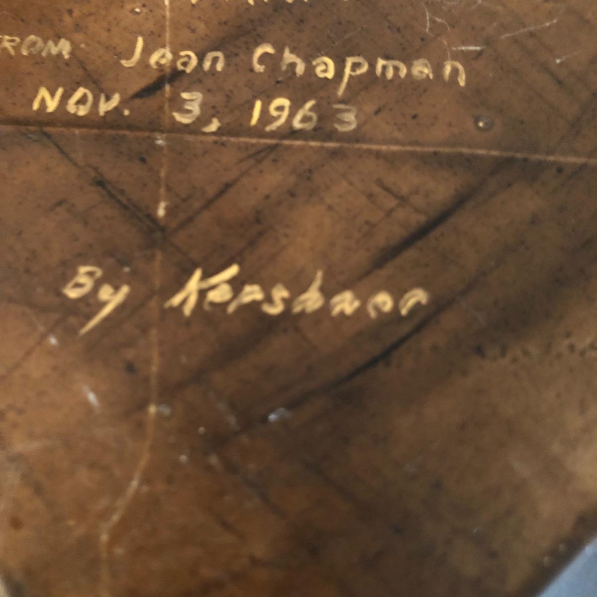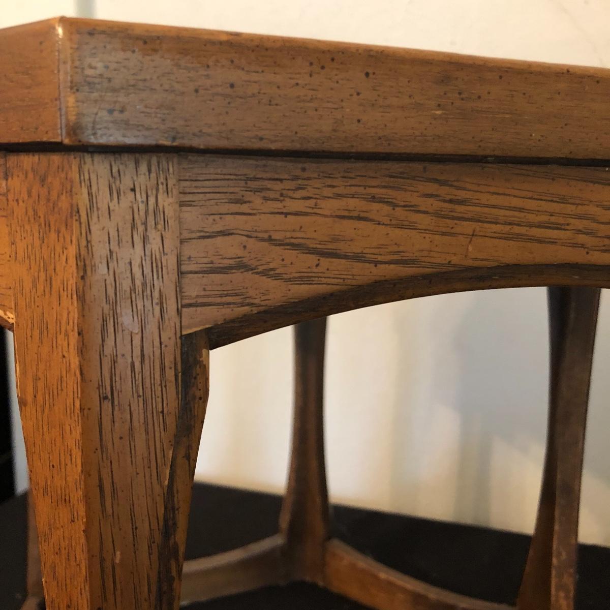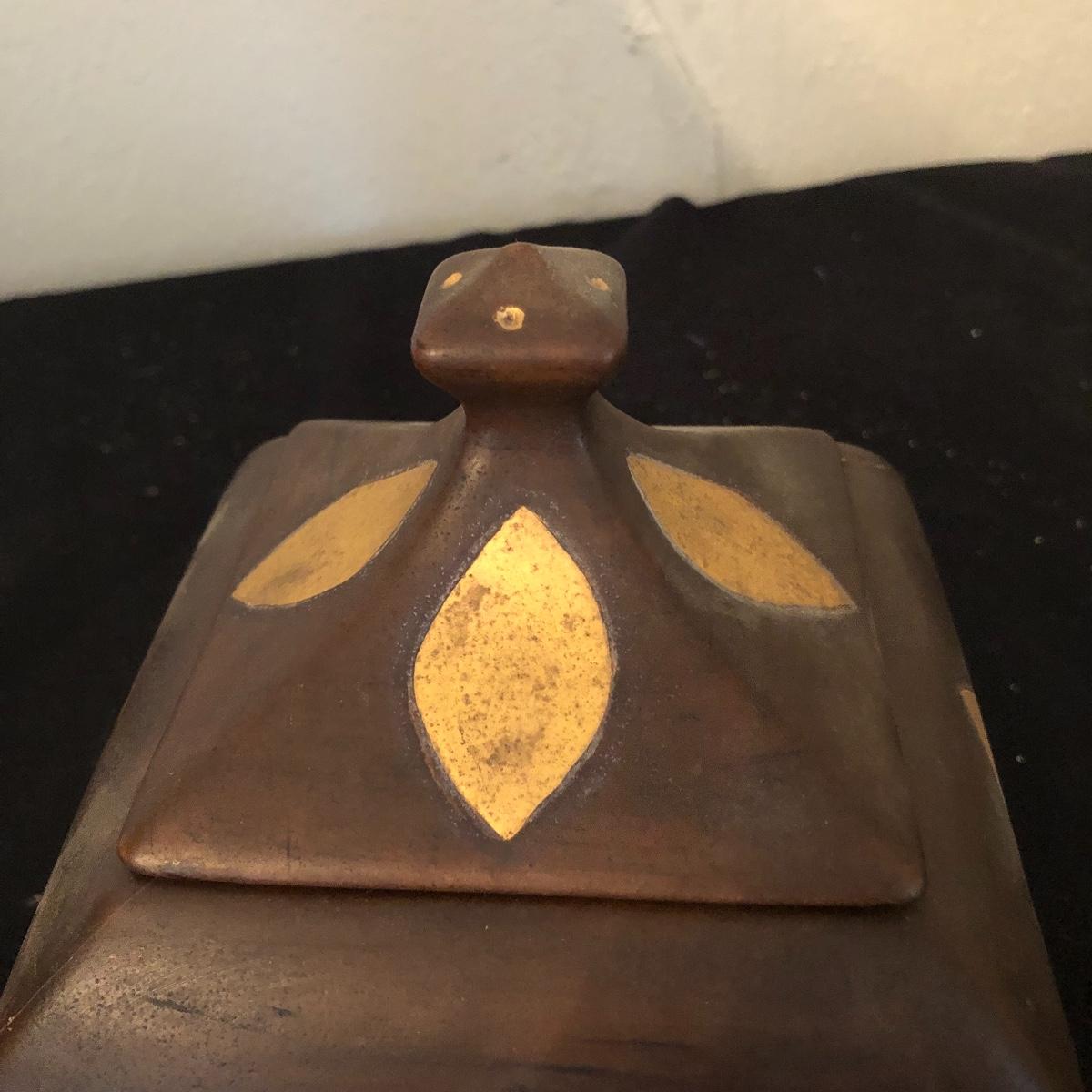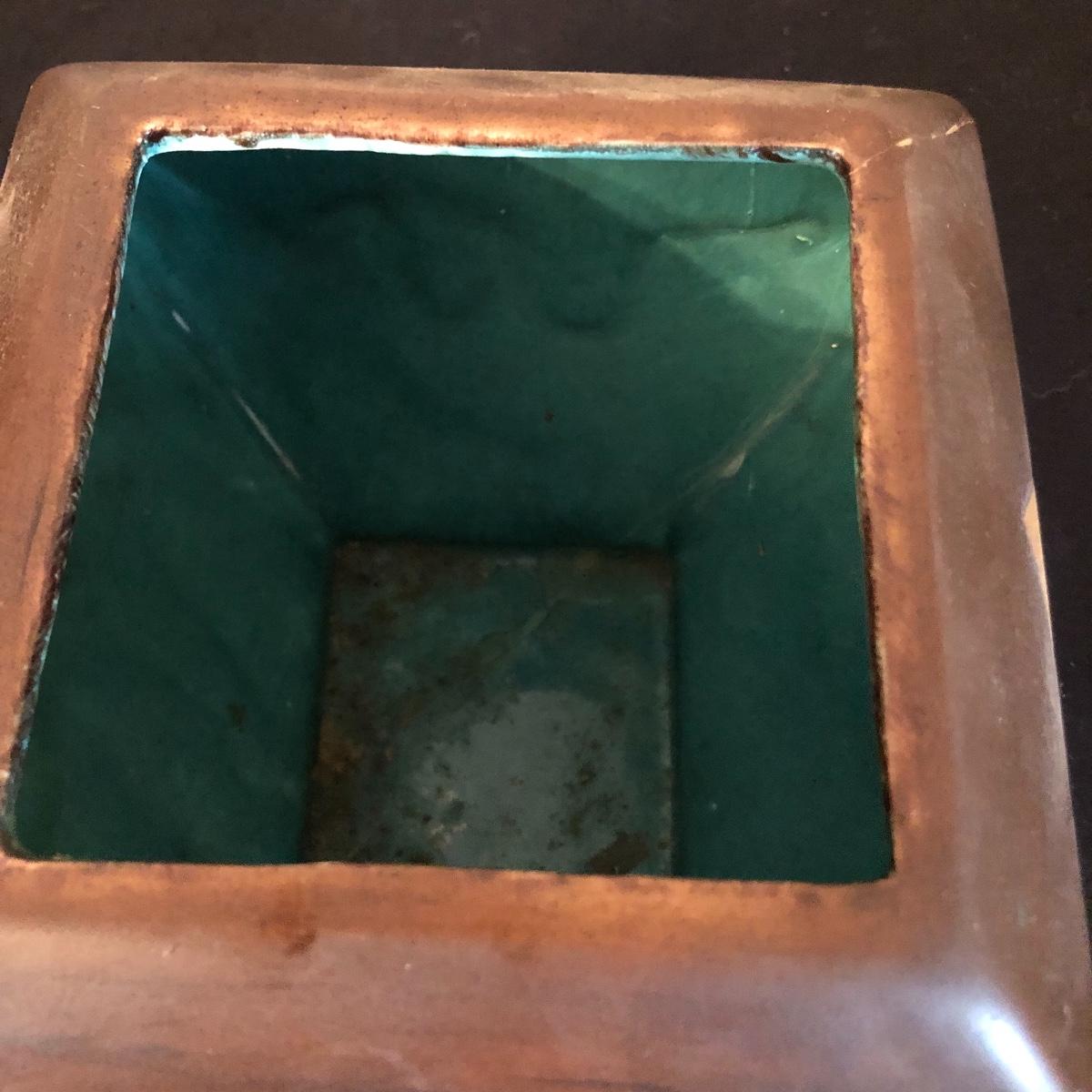 This small table/ stand is solid wood with a black veneered surface. It has some minor blemishes as does the ceramic lidded urn; this beautiful piece has been glazed to look like wood with a turquoise glazed interior. See images for blemishes.
