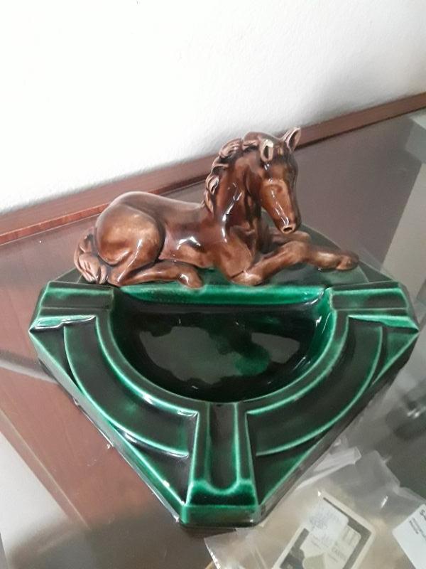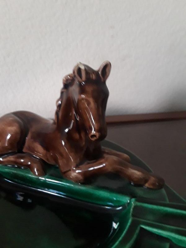 Vintage Horse Trinket Dish/ Change Holder/ Ashtray. Great Art Deco style. Brown horse on top a green dish. Beautifully glazed. Signed RS.
