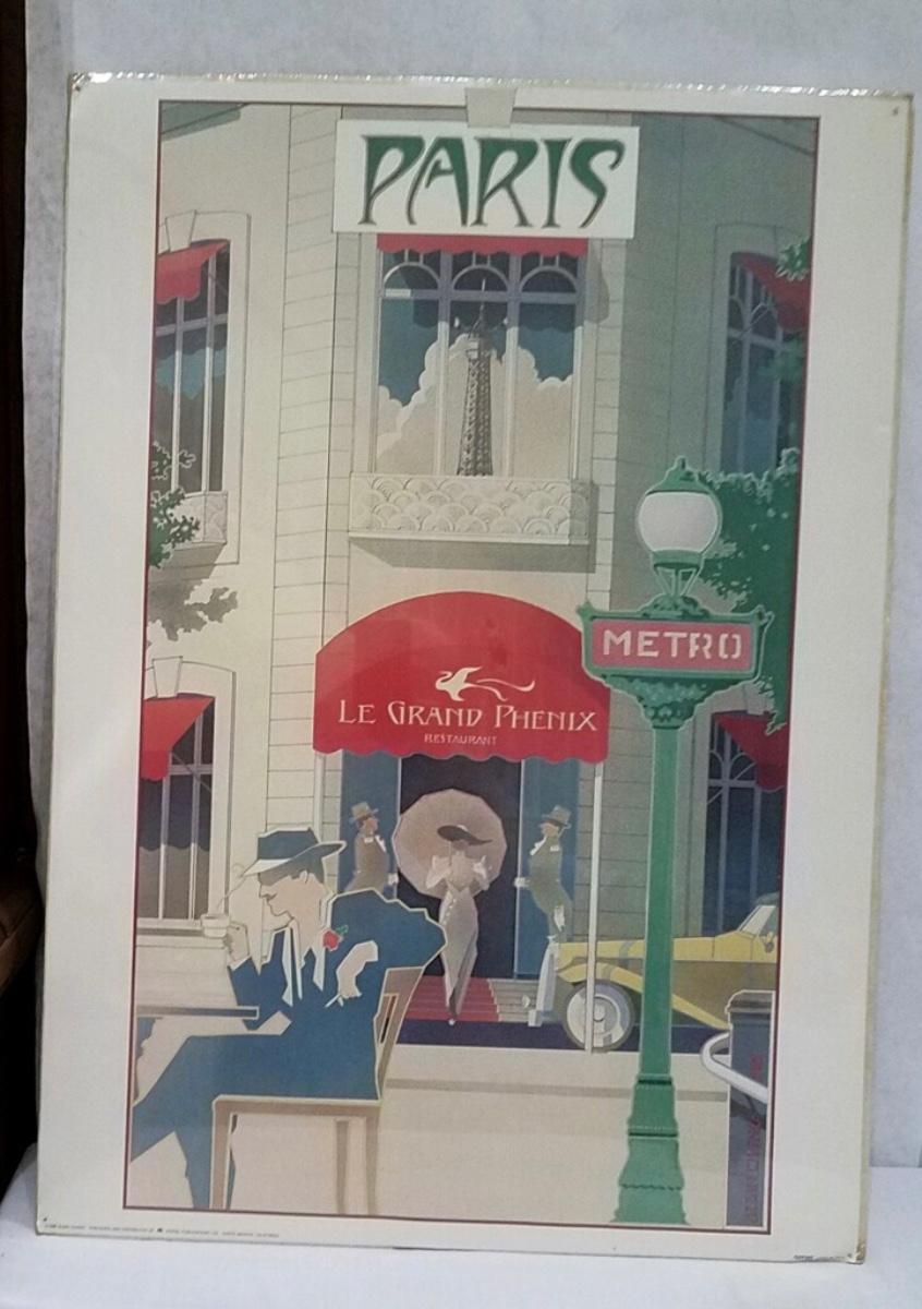 Art Deco style “Paris” poste, unframed, sealed in cardboard original package. 1986, approx 20.25” w x 28.25” h.