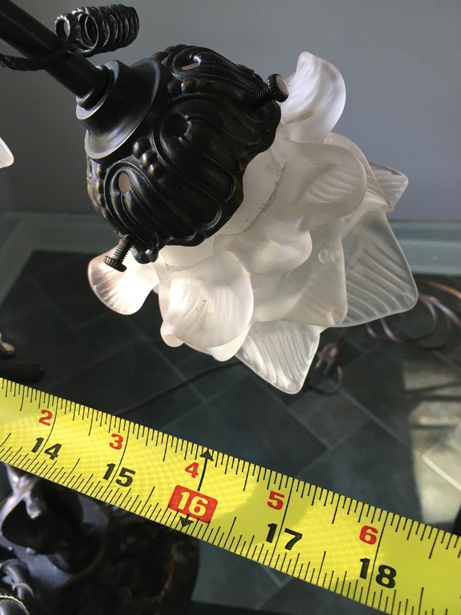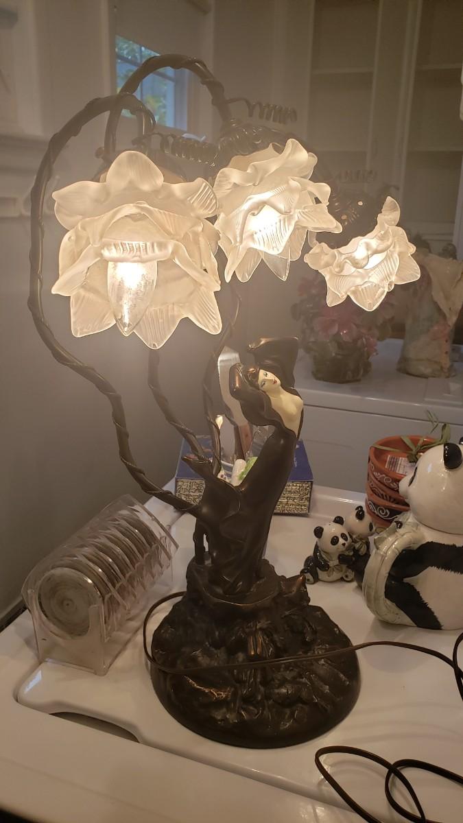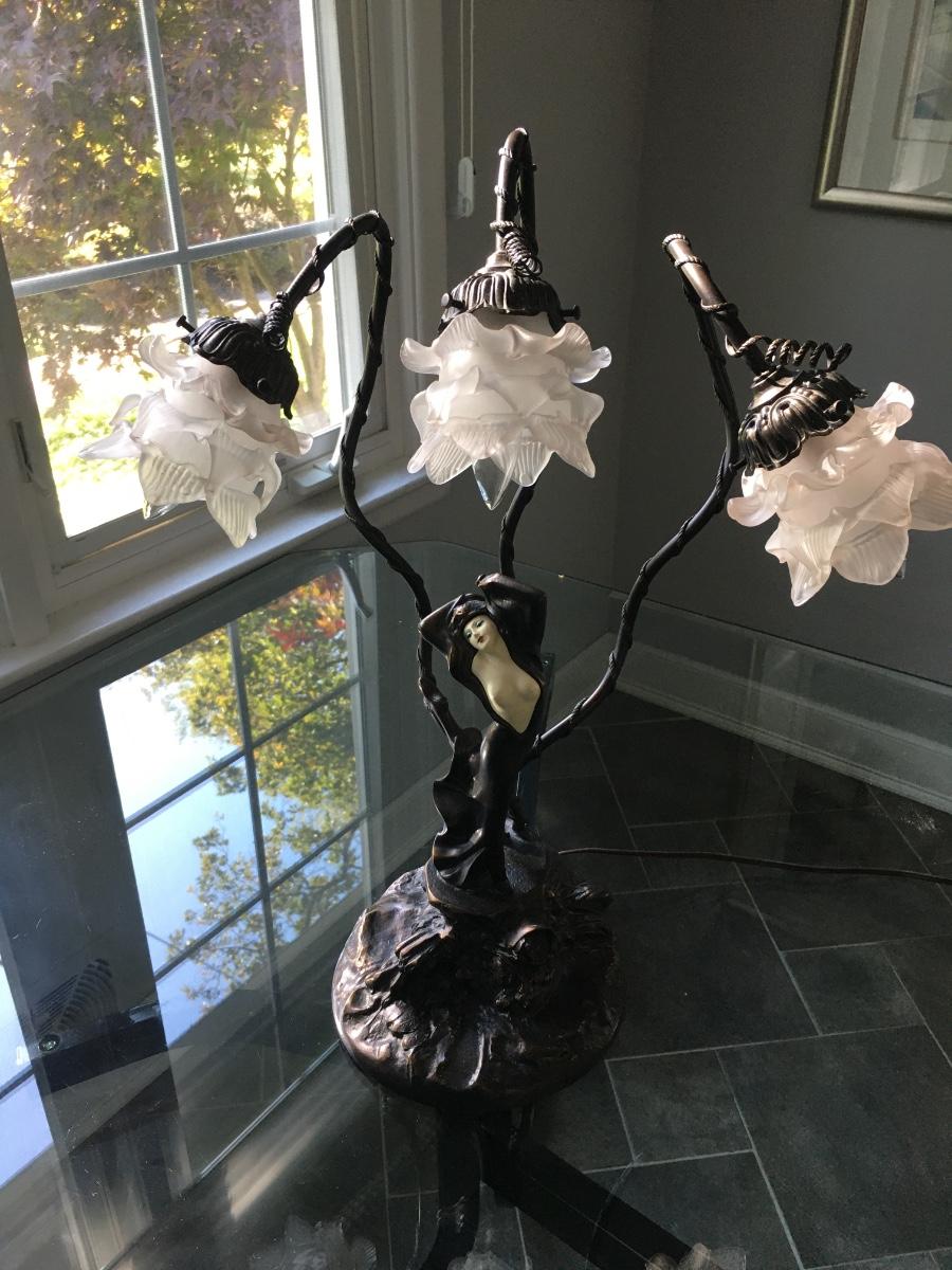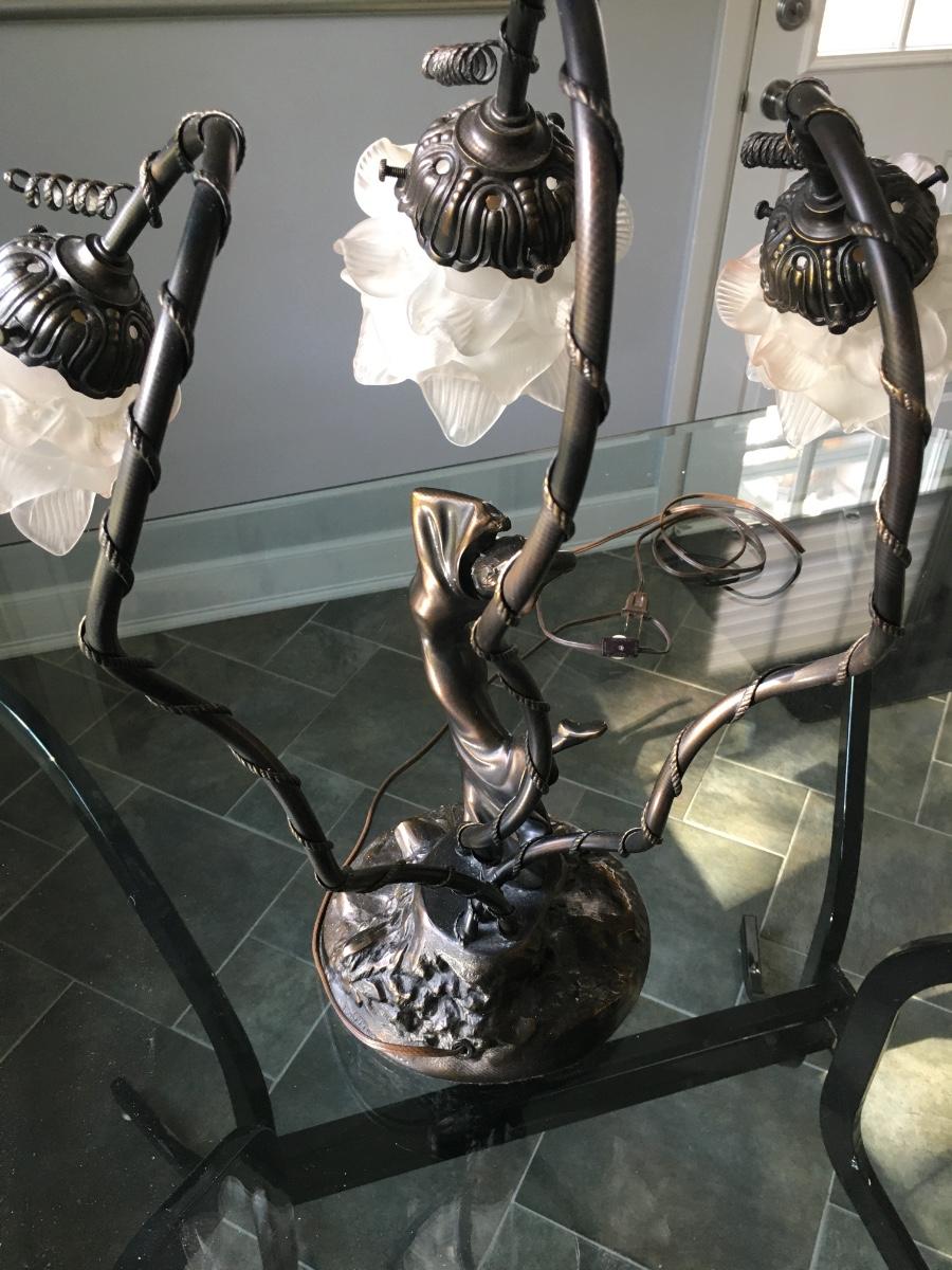 Lovely lady base surrounded by multi petaled glass lights. Very heavy with lovely details. On/Off switch on cord. Some small paint flecks on metal.