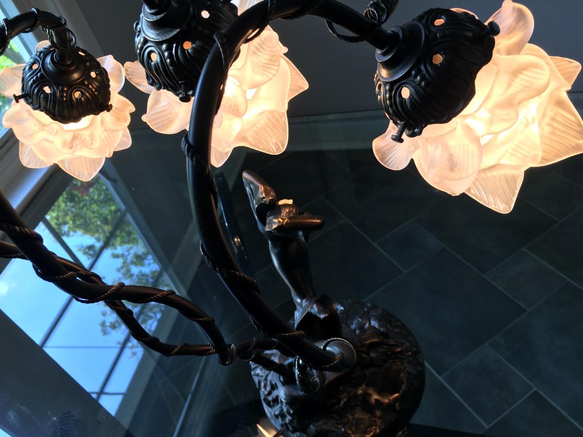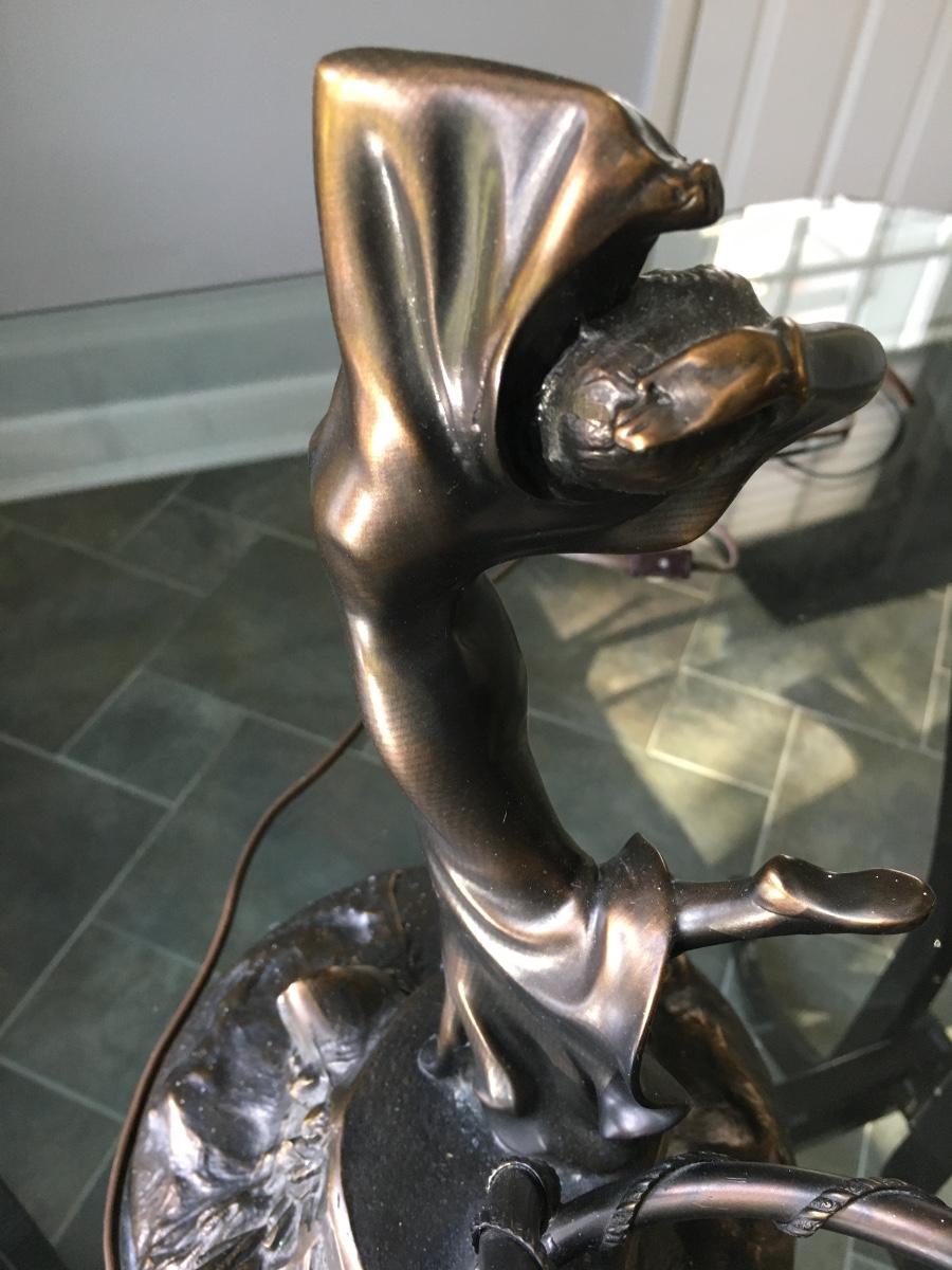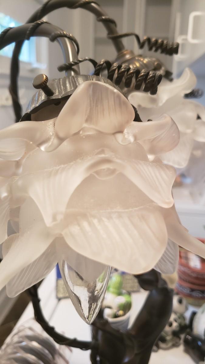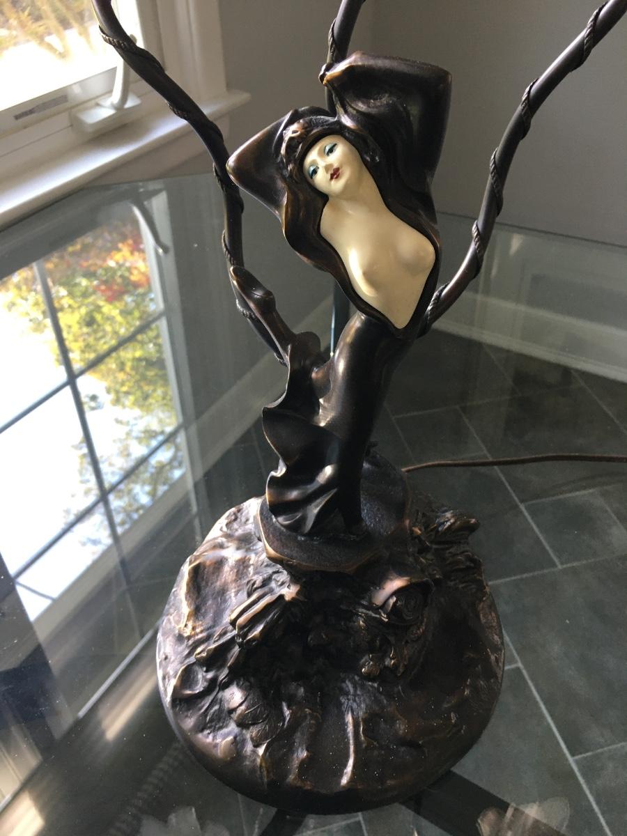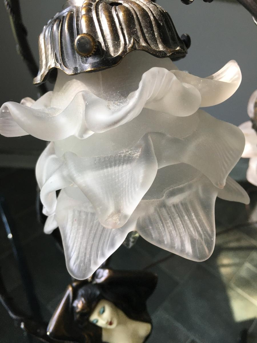 Lovely lady base surrounded by multi petaled glass lights. Very heavy with lovely details. On/Off switch on cord. Some small paint flecks on metal.