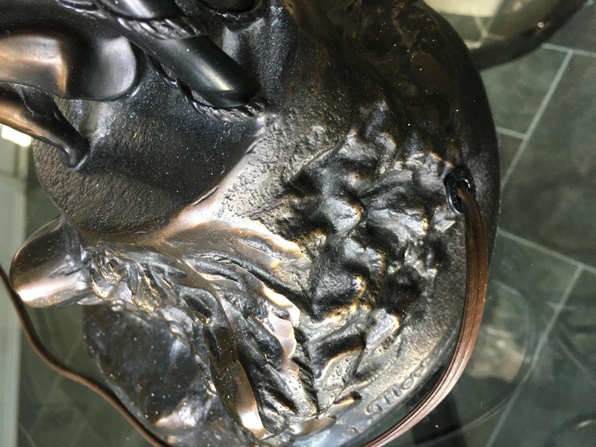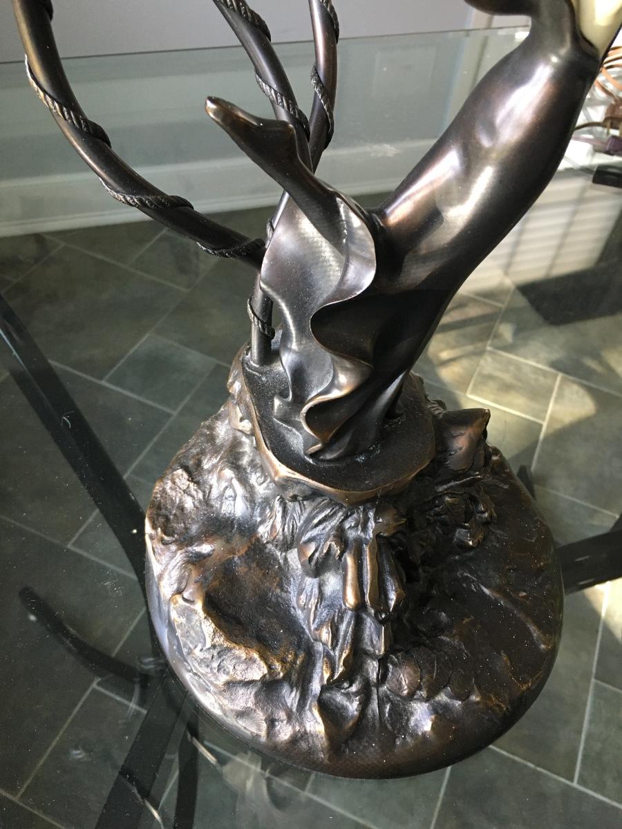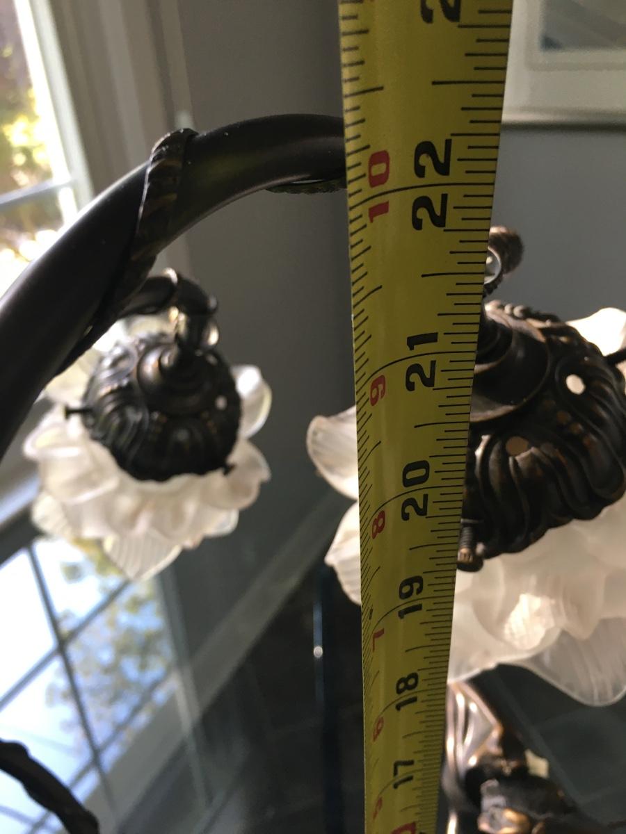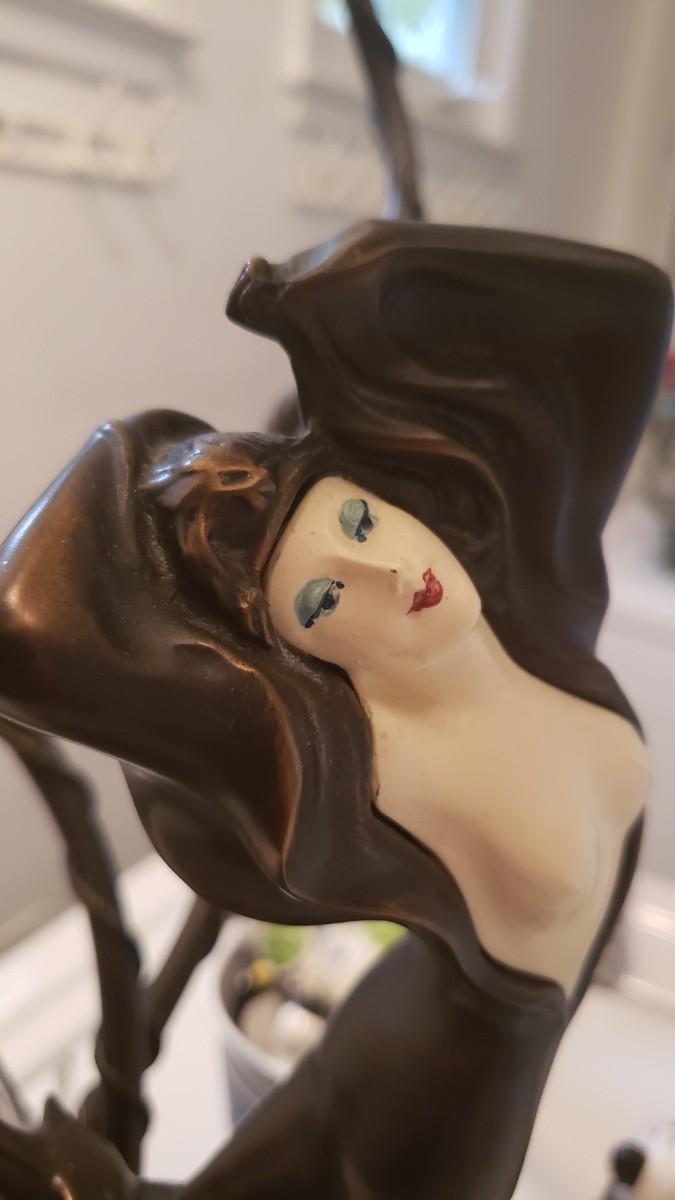 Lovely lady base surrounded by multi petaled glass lights. Very heavy with lovely details. On/Off switch on cord. Some small paint flecks on metal.
